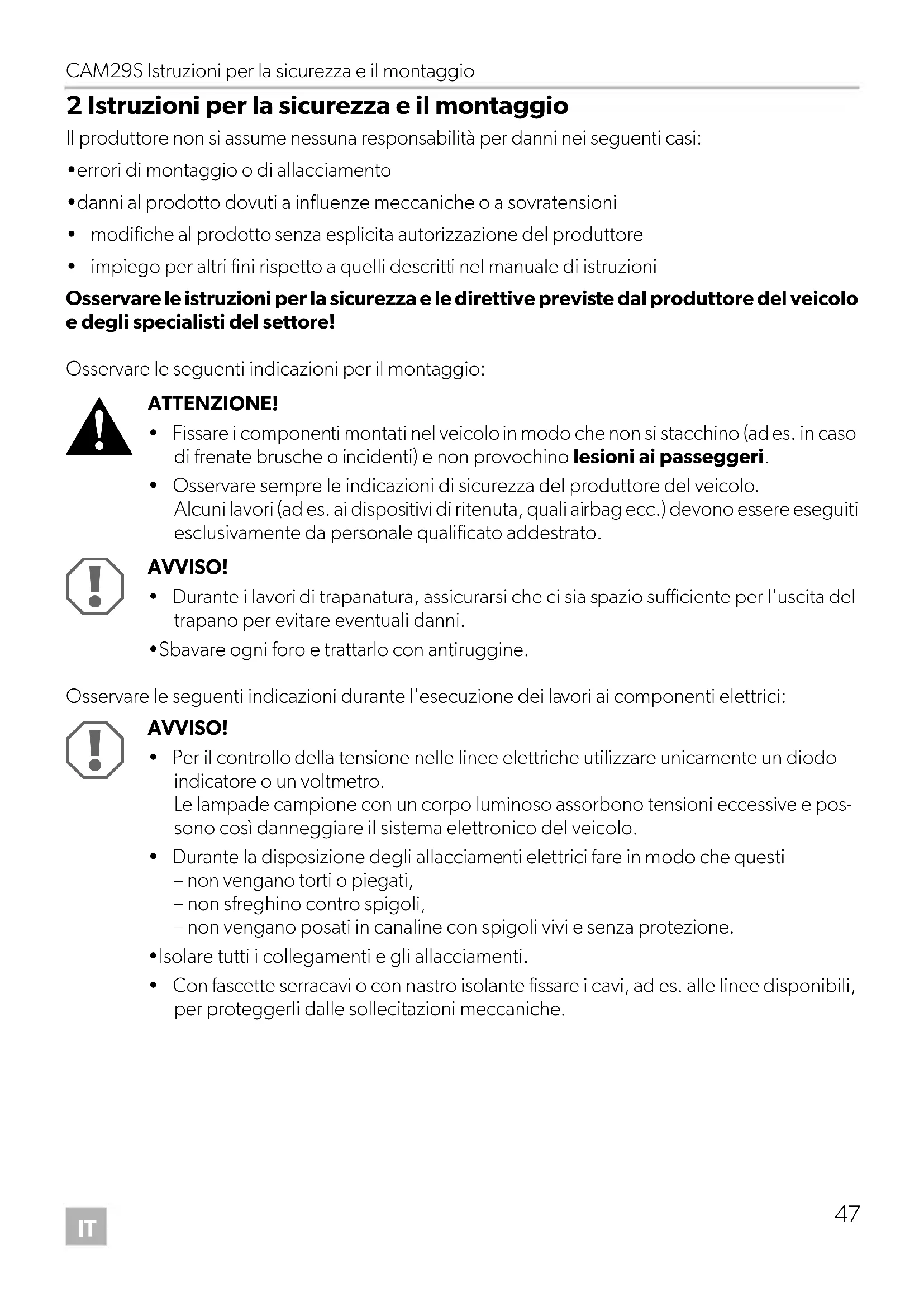 ATTENZIONE! Avviso di sicurezza: la mancata osservanza di questo avviso può essere causa di lesioni. AVVISO! La mancata osservanza di questa nota può causare danni materiali e compromettere il funzionamento del prodotto. NOTA Informazioni integranti relative all'impiego del prodotto. CAM29S-IO-16s.book Seite 46 Mittwoch, 7. Dezember 2016 5:03 17CAM29S Istruzioni per la sicurezza e il montaggio