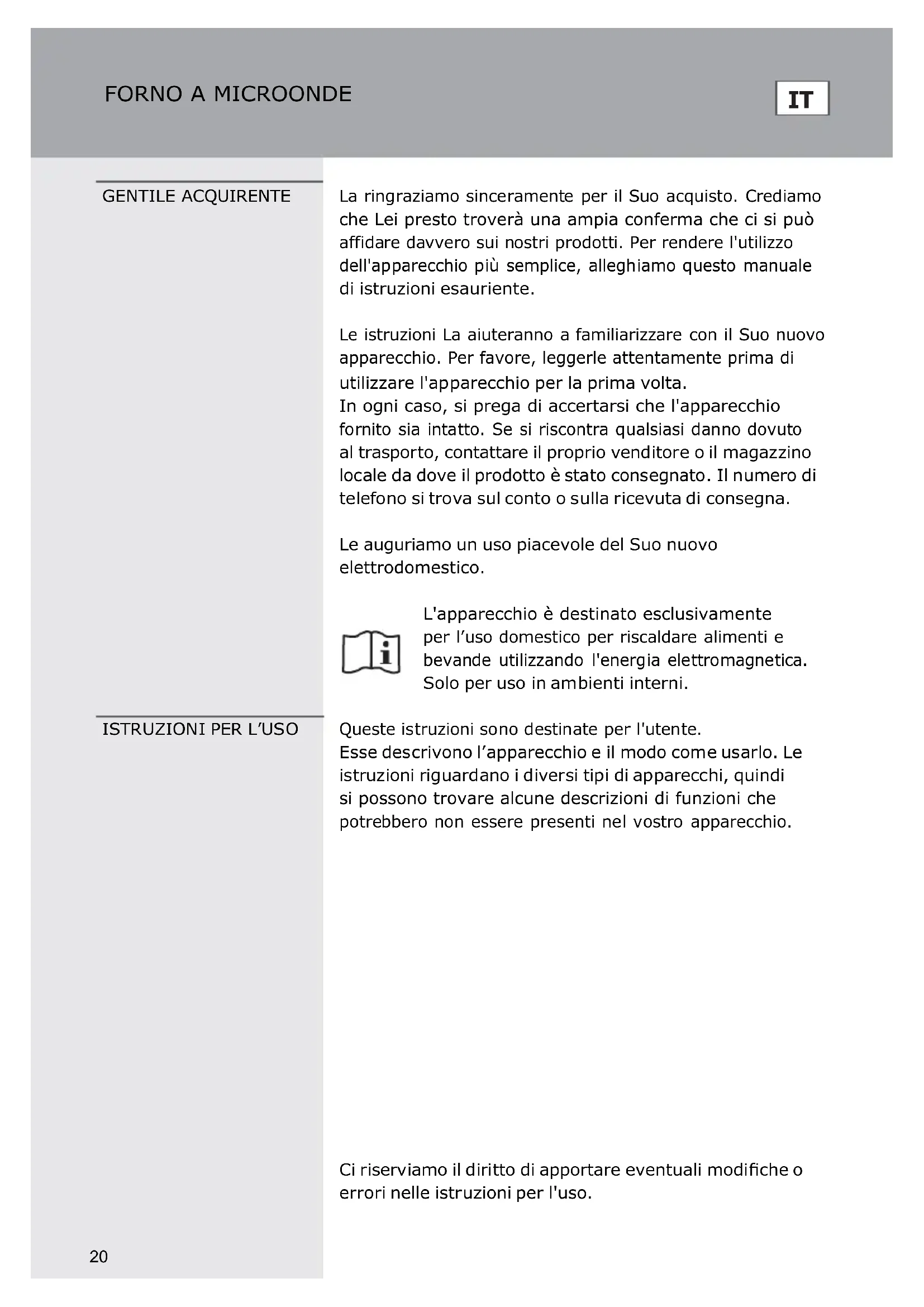 GENTILE ACQUIRENTE La ringraziamo sinceramente per il Suo acquisto. Crediamo che Lei presto troverà una ampia conferma che ci si può affidare davvero sui nostri prodotti. Per rendere l'utilizzo dell'apparecchio più semplice, alleghiamo questo manuale di istruzioni esauriente. Le istruzioni La aiuteranno a familiarizzare con il Suo nuovo apparecchio. Per favore, leggerle attentamente prima di utilizzare l'apparecchio per la prima volta. In ogni caso, si prega di accertarsi che l'apparecchio fornito sia intatto. Se si riscontra qualsiasi danno dovuto al trasporto, contattare il proprio venditore o il magazzino locale da dove il prodotto è stato consegnato. Il numero di telefono si trova sul conto o sulla ricevuta di consegna. Le auguriamo un uso piacevole del Suo nuovo elettrodomestico. L'apparecchio è destinato esclusivamente per l’uso domestico per riscaldare alimenti e bevande utilizzando l'energia elettromagnetica. Solo per uso in ambienti interni.
