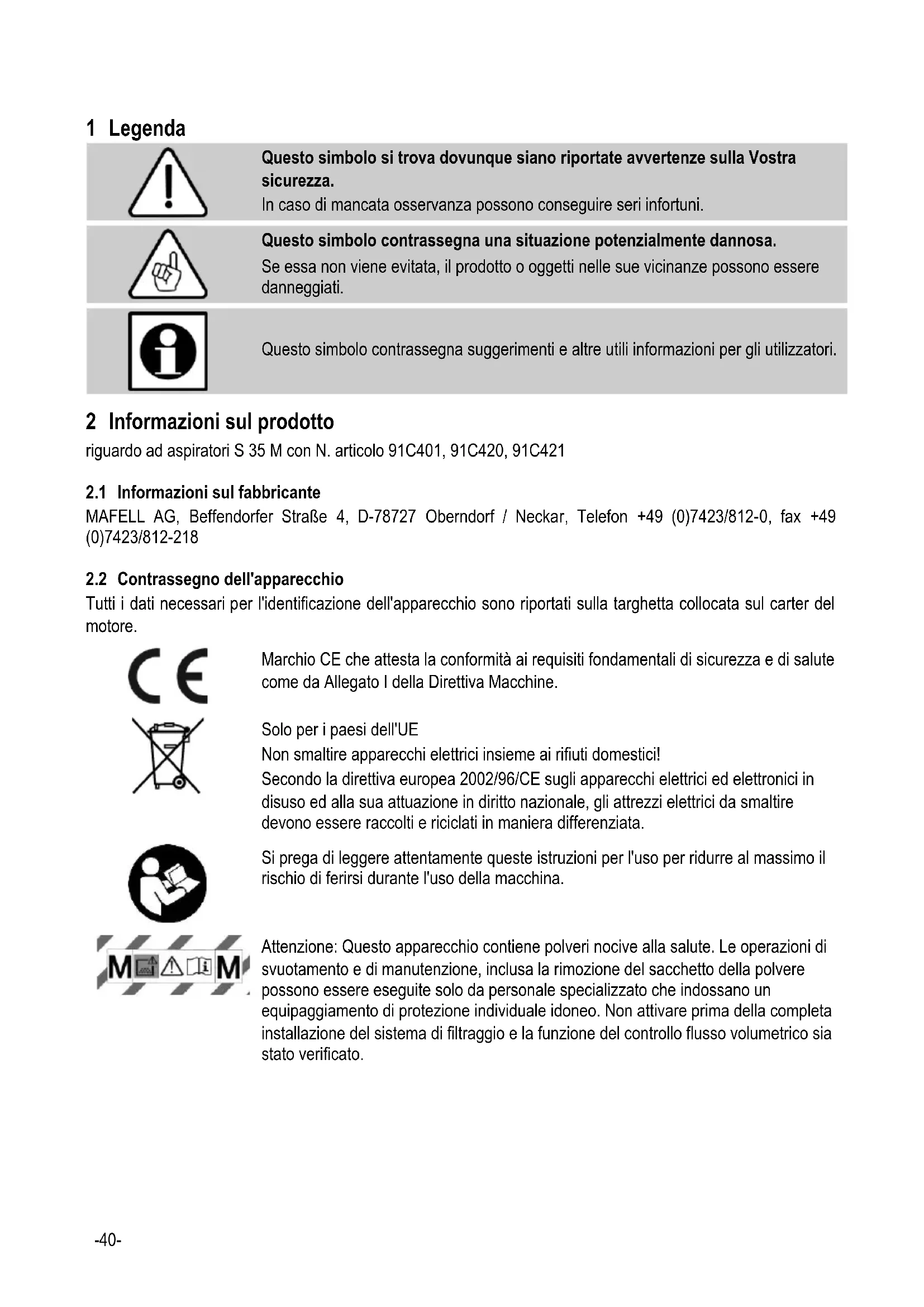 2 Informazioni sul prodotto riguardo ad aspiratori S 35 M con N. articolo 91C401, 91C420, 91C421