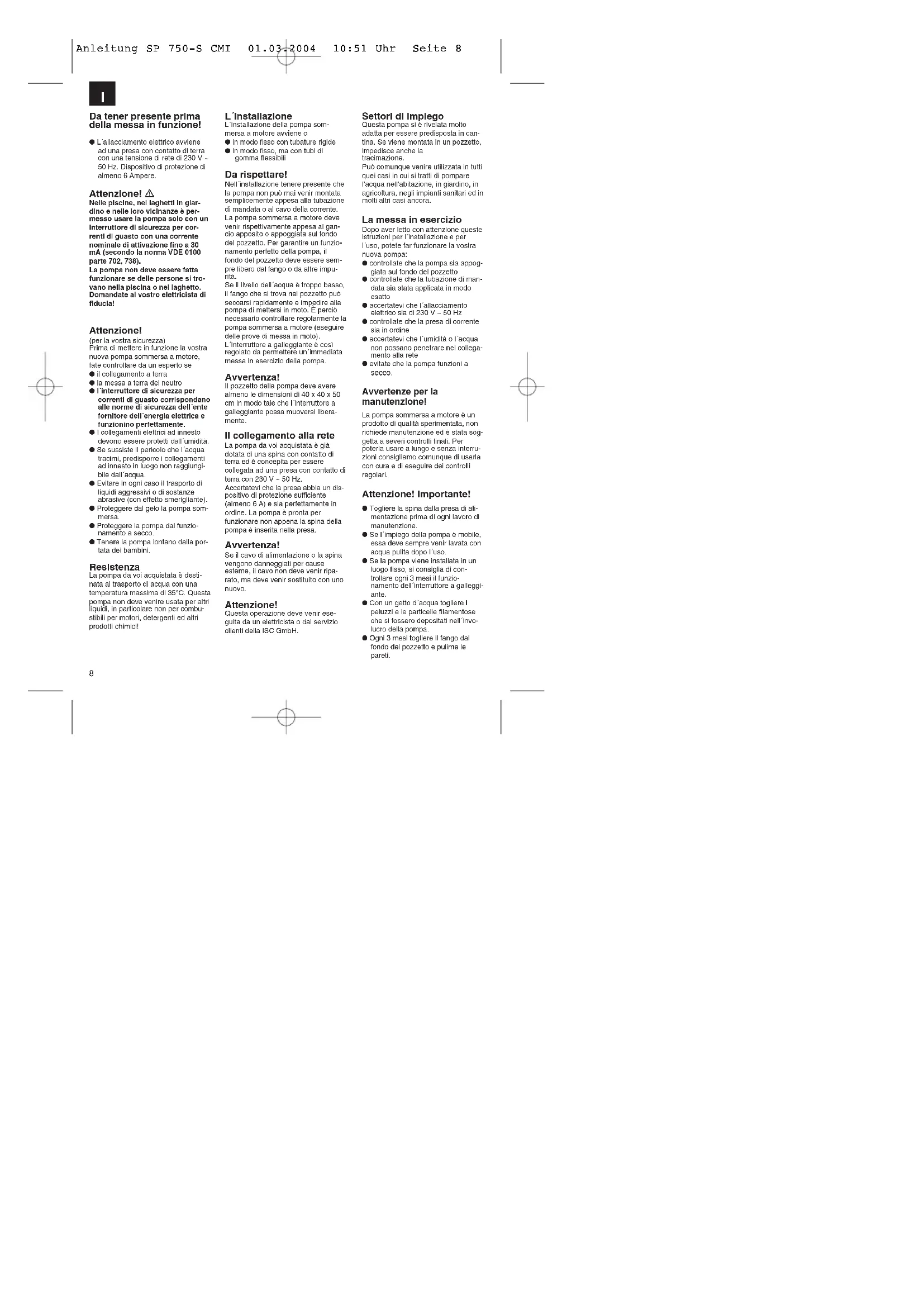 Tension de secteur 230V ~ 50 Hz Puissance absorbée 750 Watts Débit max 13.500 l/h Hauteur de refoulement max. 8 m Profondeur d’immersion max. 8 m Température de l’eau max. 35° C Raccord de tuyau 11/2” IG Corps étrangers jusqu’à ø 35 mm Hauteur point d´clenchement: MARCHE ca. 50 cm Hauteur point d´clenchement: ARRET ca. 5 cm Données techniques: Caractéristiques de puissance Hauteur de refoulement Débit 2 m max.: 13.000 l/h 4 m max.: 9.800 l/h 6 m max.: 5.300 l/h Anleitung SP 750-S CMI 01.03.2004 10:51 Uhr Seite 78 Da tener presente prima della messa in funzione! ● L´allacciamento elettrico avvienead una presa con contatto di terracon una tensione di rete di 230 V ~50 Hz. Dispositivo di protezione dialmeno 6 Ampere. Attenzione! Nelle piscine, nei laghetti in giar-dino e nelle loro vicinanze è per-messo usare la pompa solo con uninterruttore di sicurezza per cor-renti di guasto con una correntenominale di attivazione fino a 30mA (secondo la norma VDE 0100parte 702, 738).La pompa non deve essere fattafunzionare se delle persone si tro-vano nella piscina o nel laghetto.Domandate al vostro elettricista difiducia! Attenzione! (per la vostra sicurezza)Prima di mettere in funzione la vostranuova pompa sommersa a motore,fate controllare da un esperto se● il collegamento a terra● la messa a terra del neutro● l´interruttore di sicurezza percorrenti di guasto corrispondanoalle norme di sicurezza dell´entefornitore dell´energia elettrica efunzionino perfettamente.● I collegamenti elettrici ad innestodevono essere protetti dall´umidità.● Se sussiste il pericolo che l´acquatracimi, predisporre i collegamentiad innesto in luogo non raggiungi-bile dall´acqua.● Evitare in ogni caso il trasporto diliquidi aggressivi o di sostanzeabrasive (con effetto smerigliante).● Proteggere dal gelo la pompa som-mersa.● Proteggere la pompa dal funzio-namento a secco.● Tenere la pompa lontano dalla por-tata dei bambini. Resistenza La pompa da voi acquistata è desti-nata al trasporto di acqua con unatemperatura massima di 35°C. Questapompa non deve venire usata per altriliquidi, in particolare non per combu-stibili per motori, detergenti ed altriprodotti chimici! Settori di impiego Questa pompa si è rivelata moltoadatta per essere predisposta in can-tina. Se viene montata in un pozzetto,impedisce anche la tracimazione.Può comunque venire utilizzata in tuttiquei casi in cui si tratti di pomparel’acqua nell’abitazione, in giardino, inagricoltura, negli impianti sanitari ed inmolti altri casi ancora. La messa in esercizio Dopo aver letto con attenzione questeistruzioni per l´installazione e perl´uso, potete far funzionare la vostranuova pompa:● controllate che la pompa sia appog-giata sul fondo del pozzetto● controllate che la tubazione di man-data sia stata applicata in modoesatto● accertatevi che l´allacciamentoelettrico sia di 230 V ~ 50 Hz● controllate che la presa di correntesia in ordine● accertatevi che l´umidità o l´acquanon possano penetrare nel collega-mento alla rete● evitate che la pompa funzioni asecco. Avvertenze per la manutenzione! La pompa sommersa a motore è unprodotto di qualità sperimentata, nonrichiede manutenzione ed è stata sog-getta a severi controlli finali. Perpoterla usare a lungo e senza interru-zioni consigliamo comunque di usarlacon cura e di eseguire dei controlliregolari. Attenzione! Importante! ● Togliere la spina dalla presa di ali-mentazione prima di ogni lavoro dimanutenzione.● Se l´impiego della pompa è mobile,essa deve sempre venir lavata conacqua pulita dopo l´uso.● Se la pompa viene installata in unluogo fisso, si consiglia di con-trollare ogni 3 mesi il funzio-namento dell´interruttore a galleggi-ante.● Con un getto d´acqua togliere ipeluzzi e le particelle filamentoseche si fossero depositati nell´invo-lucro della pompa.● Ogni 3 mesi togliere il fango dalfondo del pozzetto e pulirne lepareti. L´installazione L´installazione della pompa som-mersa a motore avviene o● in modo fisso con tubature rigide● in modo fisso, ma con tubi digomma flessibili Da rispettare! Nell´installazione tenere presente chela pompa non può mai venir montatasemplicemente appesa alla tubazionedi mandata o al cavo della corrente.La pompa sommersa a motore devevenir rispettivamente appesa al gan-cio apposito o appoggiata sul fondodel pozzetto. Per garantire un funzio-namento perfetto della pompa, ilfondo del pozzetto deve essere sem-pre libero dal fango o da altre impu-rità.Se il livello dell´acqua è troppo basso,il fango che si trova nel pozzetto puòseccarsi rapidamente e impedire allapompa di mettersi in moto. È perciònecessario controllare regolarmente lapompa sommersa a motore (eseguiredelle prove di messa in moto).L´interruttore a galleggiante è cosìregolato da permettere un´immediatamessa in esercizio della pompa. Avvertenza! Il pozzetto della pompa deve averealmeno le dimensioni di 40 x 40 x 50cm in modo tale che l´interruttore agalleggiante possa muoversi libera-mente. Il collegamento alla rete La pompa da voi acquistata è giàdotata di una spina con contatto diterra ed è concepita per essere collegata ad una presa con contatto diterra con 230 V ~ 50 Hz. Accertatevi che la presa abbia un dis-positivo di protezione sufficiente(almeno 6 A) e sia perfettamente inordine. La pompa è pronta per funzionare non appena la spina dellapompa è inserita nella presa. Avvertenza! Se il cavo di alimentazione o la spinavengono danneggiati per causeesterne, il cavo non deve venir ripa-rato, ma deve venir sostituito con unonuovo. Attenzione! Questa operazione deve venir ese-guita da un elettricista o dal servizioclienti della ISC GmbH.