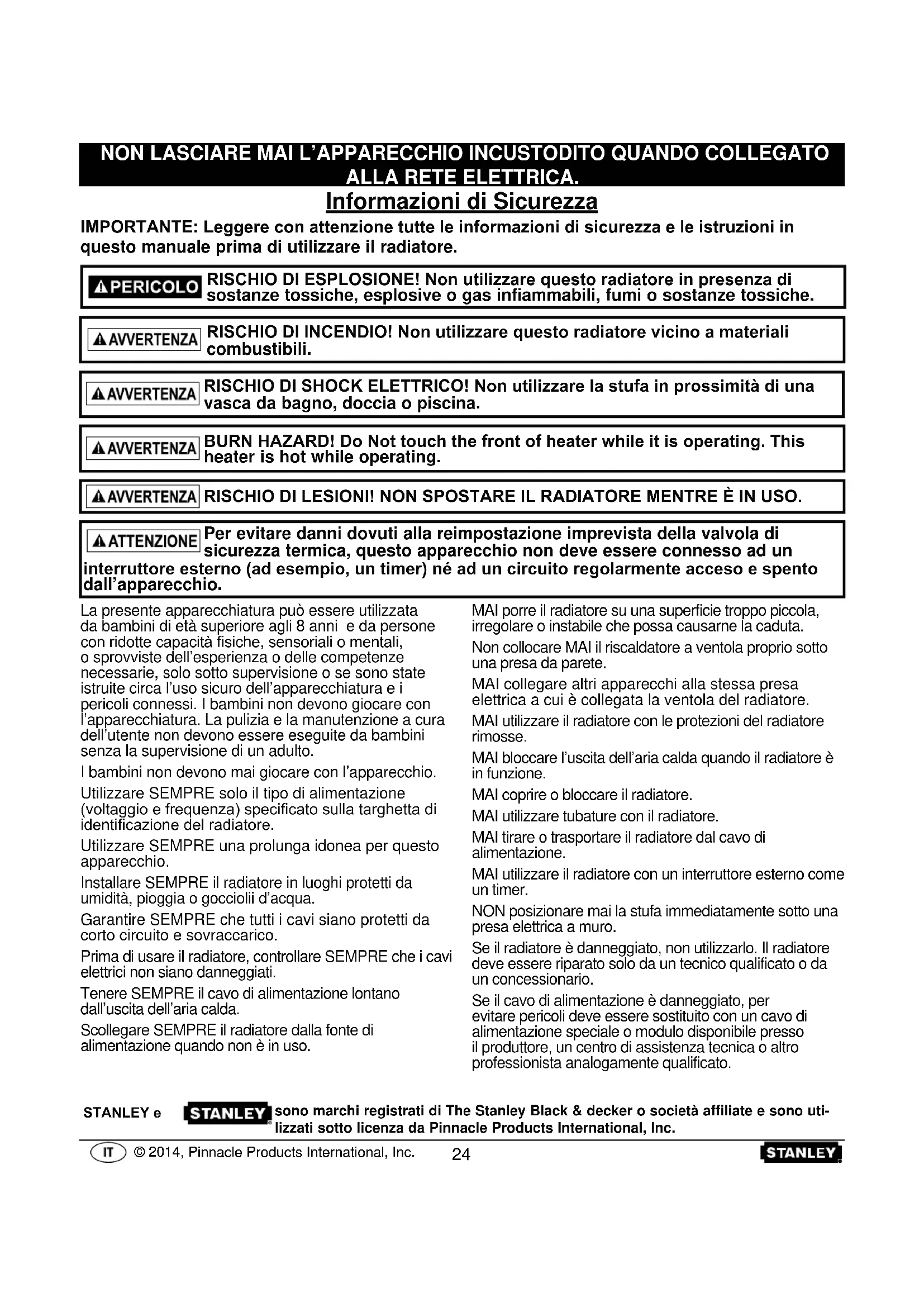 heater is hot while operating. 5,6&+,2',/(6,21,12163267$5(,/5$',$725(0(175(Ê,1862 La presente apparecchiatura può essere utilizzata da bambini di età superiore agli 8 anni e da persone FRQULGRWWHFDSDFLWj¿VLFKHVHQVRULDOLRPHQWDOLo sprovviste dell’esperienza o delle competenze necessarie, solo sotto supervisione o se sono state istruite circa l’uso sicuro dell’apparecchiatura e i pericoli connessi. I bambini non devono giocare con l’apparecchiatura. La pulizia e la manutenzione a cura dell’utente non devono essere eseguite da bambini senza la supervisione di un adulto.I bambini non devono mai giocare con l’apparecchio.Utilizzare SEMPRE solo il tipo di alimentazione YROWDJJLRHIUHTXHQ]DVSHFL¿FDWRVXOODWDUJKHWWDGLLGHQWL¿FD]LRQHGHOUDGLDWRUHUtilizzare SEMPRE una prolunga idonea per questo apparecchio.Installare SEMPRE il radiatore in luoghi protetti da umidità, pioggia o gocciolii d’acqua.Garantire SEMPRE che tutti i cavi siano protetti da corto circuito e sovraccarico. Prima di usare il radiatore, controllare SEMPRE che i cavi elettrici non siano danneggiati. Tenere SEMPRE il cavo di alimentazione lontano dall’uscita dell’aria calda.Scollegare SEMPRE il radiatore dalla fonte di alimentazione quando non è in uso.MAI porre il radiatore su una superficie troppo piccola, irregolare o instabile che possa causarne la caduta.Non collocare MAI il riscaldatore a ventola proprio sotto una presa da parete.MAI collegare altri apparecchi alla stessa presa elettrica a cui è collegata la ventola del radiatore.MAI utilizzare il radiatore con le protezioni del radiatore rimosse.MAI bloccare l’uscita dell’aria calda quando il radiatore è in funzione.MAI coprire o bloccare il radiatore.MAI utilizzare tubature con il radiatore.MAI tirare o trasportare il radiatore dal cavo di alimentazione.MAI utilizzare il radiatore con un interruttore esterno come un timer.NON posizionare mai la stufa immediatamente sotto una presa elettrica a muro.Se il radiatore è danneggiato, non utilizzarlo. Il radiatore deve essere riparato solo da un tecnico qualificato o da un concessionario.Se il cavo di alimentazione è danneggiato, per evitare pericoli deve essere sostituito con un cavo di alimentazione speciale o modulo disponibile presso il produttore, un centro di assistenza tecnica o altro professionista analogamente qualificato. Per evitare danni dovuti alla reimpostazione imprevista della valvola di sicurezza termica, questo apparecchio non deve essere connesso ad un LQWHUUXWWRUHHVWHUQRDGHVHPSLRXQWLPHUQpDGXQFLUFXLWRUHJRODUPHQWHDFFHVRHVSHQWR dall’apparecchio. sono marchi registrati di The Stanley Black & decker o società affiliate e sono uti-lizzati sotto licenza da Pinnacle Products International, Inc.67$1/(<H 24© 2014, Pinnacle Products International, Inc. NEVER LEAVE HEATER UNATTENDED WHILE CONNECTED TO A POWER SOURCE © 2014, Pinnacle Products International, Inc. NE JAMAIS LAISSER LE RADIATEUR SANS SURVEILLANCE QUAND IL EST BRANCHÉ À UNE SOURCE D’ALIMENTATION. NON LASCIARE MAI L’APPARECCHIO INCUSTODITO QUANDO COLLEGATO ALLA RETE ELETTRICA. $VVHPEODJJLR$3DJLQD