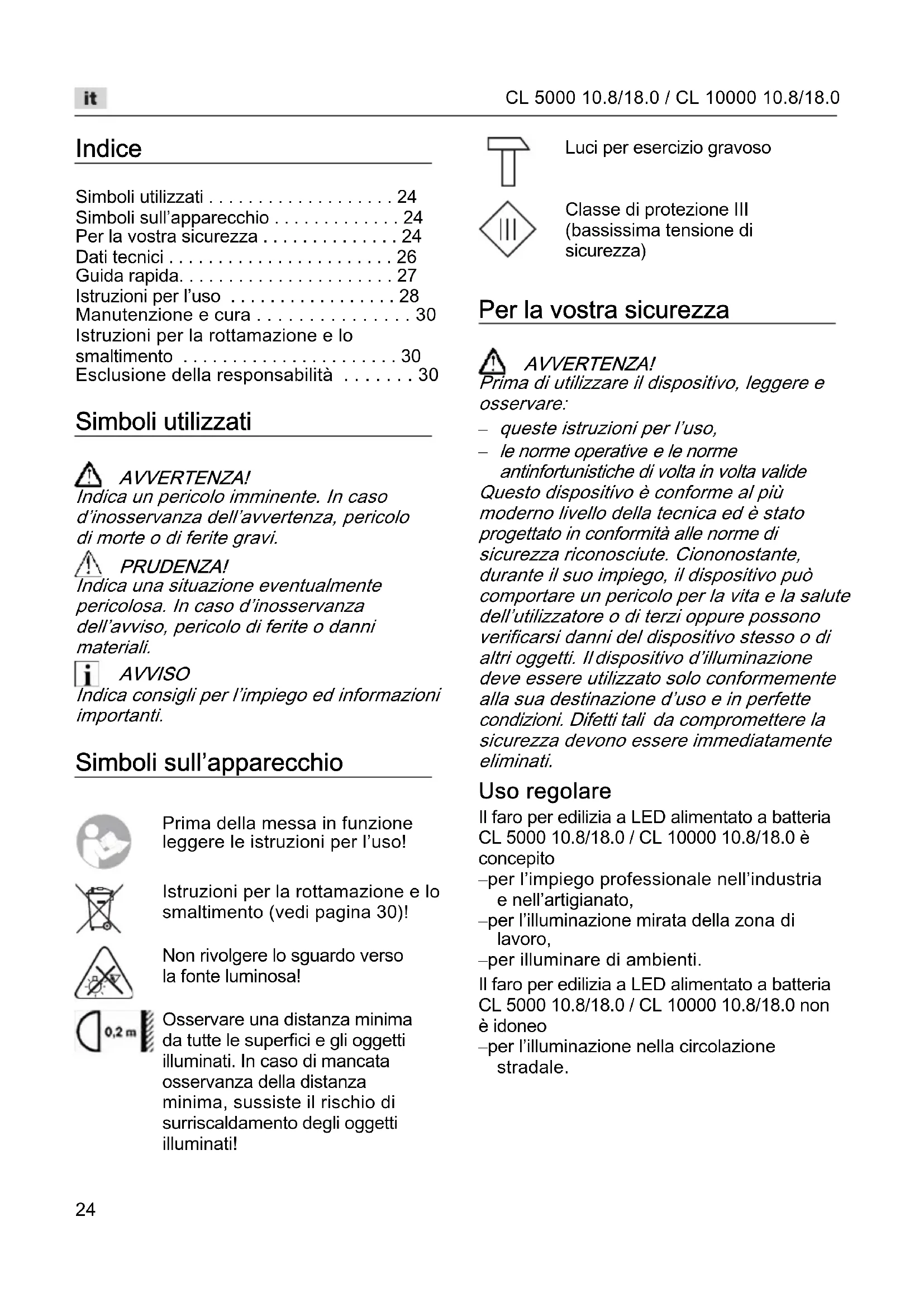 le norme operative e le norme antinfortunistiche di volta in volta valide Questo dispositivo è conforme al più moderno livello della tecnica ed è stato progettato in conformità alle norme di sicurezza riconosciute. Ciononostante, durante il suo impiego, il dispositivo può comportare un pericolo per la vita e la salute dell’utilizzatore o di terzi oppure possono verificarsi danni del dispositivo stesso o di altri oggetti. Il dispositivo d’illuminazione deve essere utilizzato solo conformemente alla sua destinazione d’uso e in perfette condizioni. Difetti tali da compromettere la sicurezza devono essere immediatamente eliminati. Uso regolare Il faro per edilizia a LED alimentato a batteria CL 5000 10.8/18.0 / CL 10000 10.8/18.0 è concepito – per l’impiego professionale nell’industria e nell’artigianato, – per l’illuminazione mirata della zona di lavoro, – per illuminare di ambienti. Il faro per edilizia a LED alimentato a batteria CL 5000 10.8/18.0 / CL 10000 10.8/18.0 non è idoneo – per l’illuminazione nella circolazione stradale. Prima della messa in funzione leggere le istruzioni per l’uso! Istruzioni per la rottamazione e lo smaltimento (vedi pagina 30)! Non rivolgere lo sguardo verso la fonte luminosa! Osservare una distanza minima da tutte le superfici e gli oggetti illuminati. In caso di mancata osservanza della distanza minima, sussiste il rischio di surriscaldamento degli oggetti illuminati! Luci per esercizio gravoso Classe di protezione III (bassissima tensione di sicurezza)CL 5000 10.8/18.0 / CL 10000 10.8/18.0