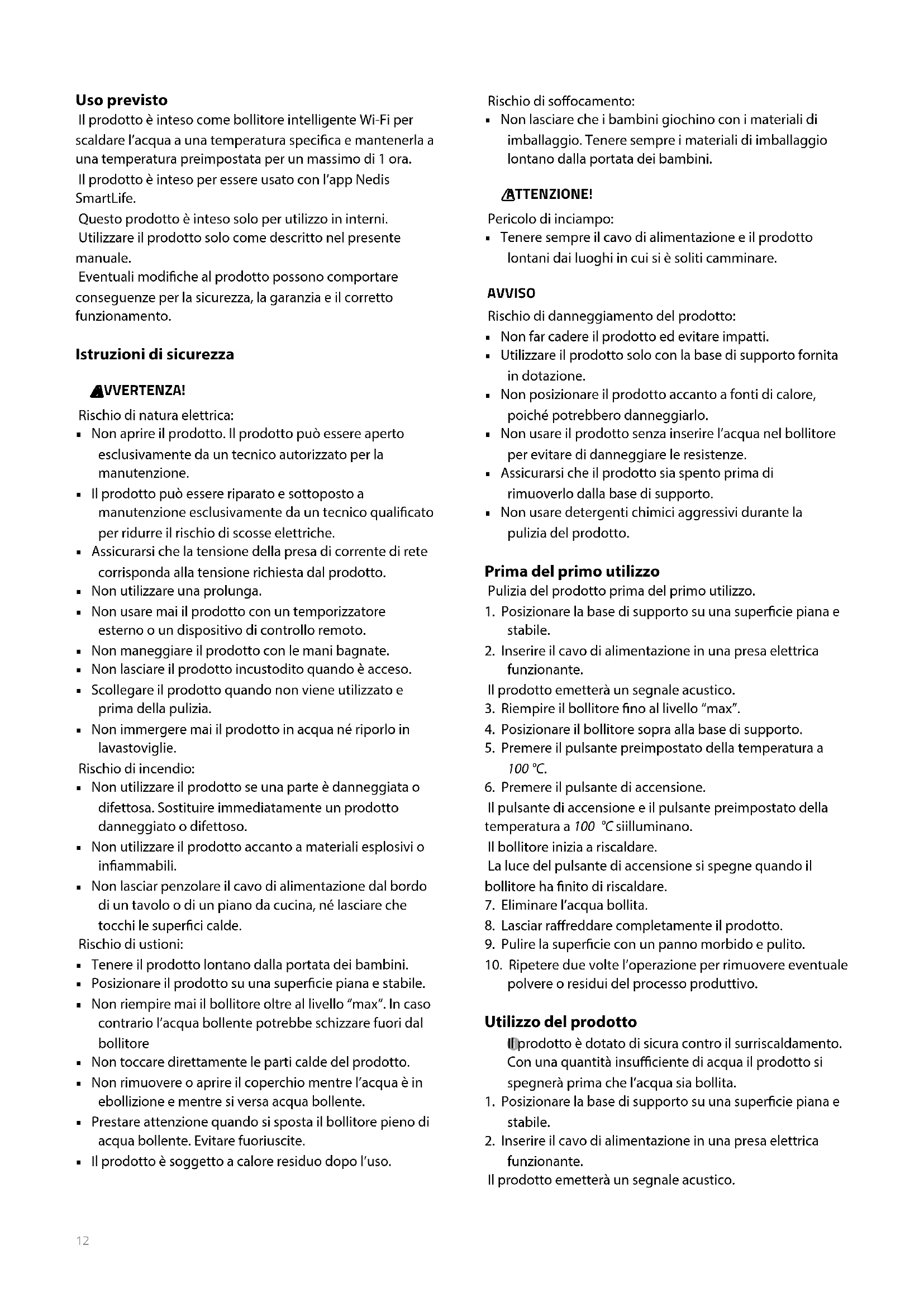 funzionante. Il prodotto emetterà un segnale acustico. Uso previsto Il prodotto è inteso come bollitore intelligente Wi-Fi per scaldare l’acqua a una temperatura specica e mantenerla a una temperatura preimpostata per un massimo di 1 ora. Il prodotto è inteso per essere usato con l’app Nedis SmartLife. Questo prodotto è inteso solo per utilizzo in interni. Utilizzare il prodotto solo come descritto nel presente manuale. Eventuali modiche al prodotto possono comportare conseguenze per la sicurezza, la garanzia e il corretto funzionamento. Istruzioni di sicurezza