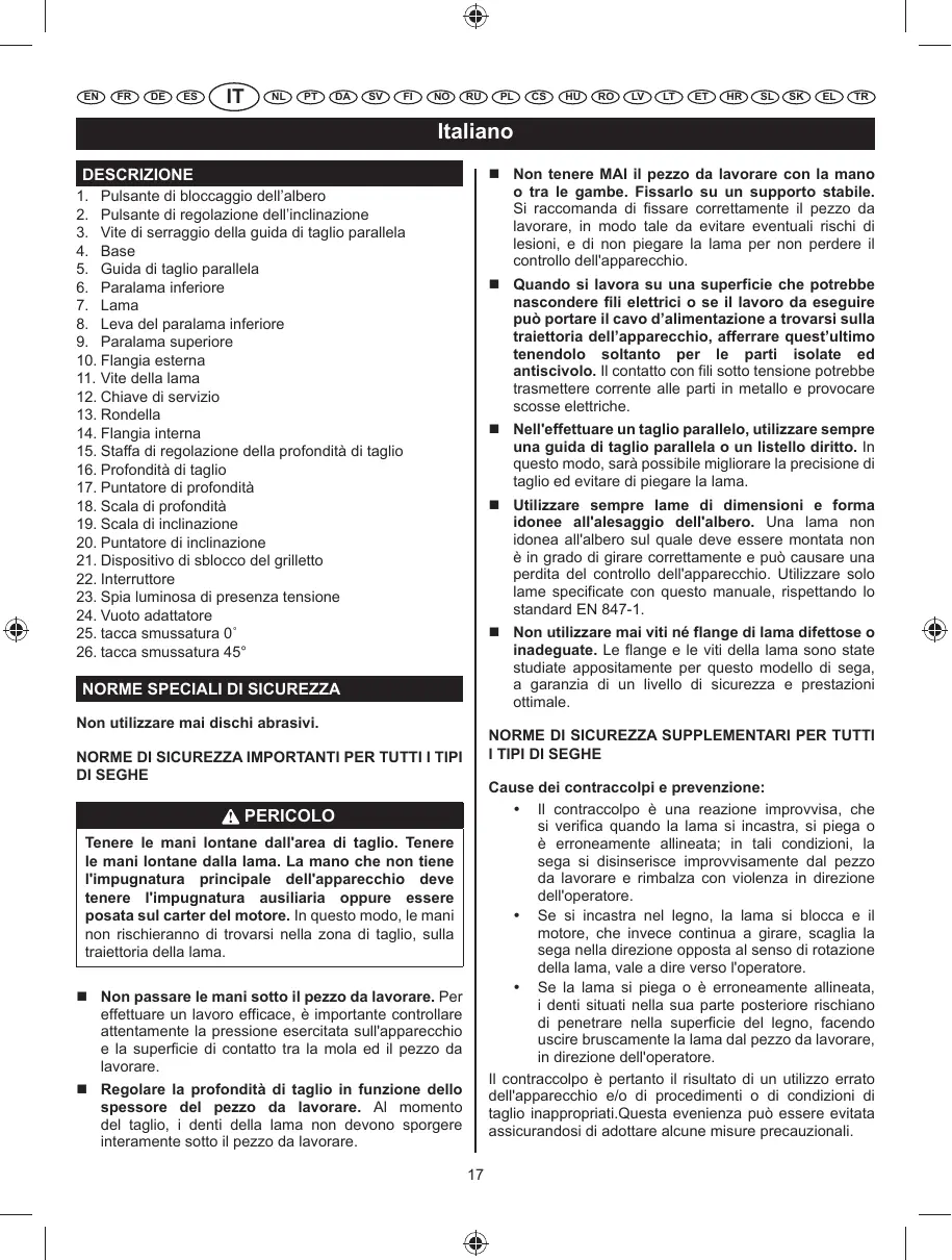 EN FR DE ES IT NL PT DA SV FI NO RU PL CS HU RO LV LT ET HR SL SK EL TR Italiano Tenere saldamente la sega con entrambe le mani e posizionare le braccia in modo tale che possano controllare un eventuale contraccolpo. Durante l'esecuzione del lavoro, collocarsi su un lato della sega:non rimanere mai lungo l'asse della lama. Il contraccolpo fa sì che la sega venga scagliata improvvisamente all'indietro, ma questo movimento può essere tenuto sotto controllo se l'operatore lo prevede e si prepara all'evenienza.