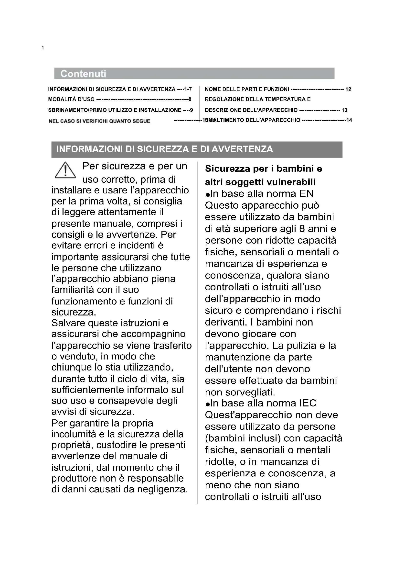 In base alla norma IEC Quest'apparecchio non deveseissereutilizzato da persone (bambini inclusi) con capacità fisiche, sensoriali o mentali ridotte,o in mancanza di esperienza e conoscenza,a meno che non siano controllati o struiti all'uso