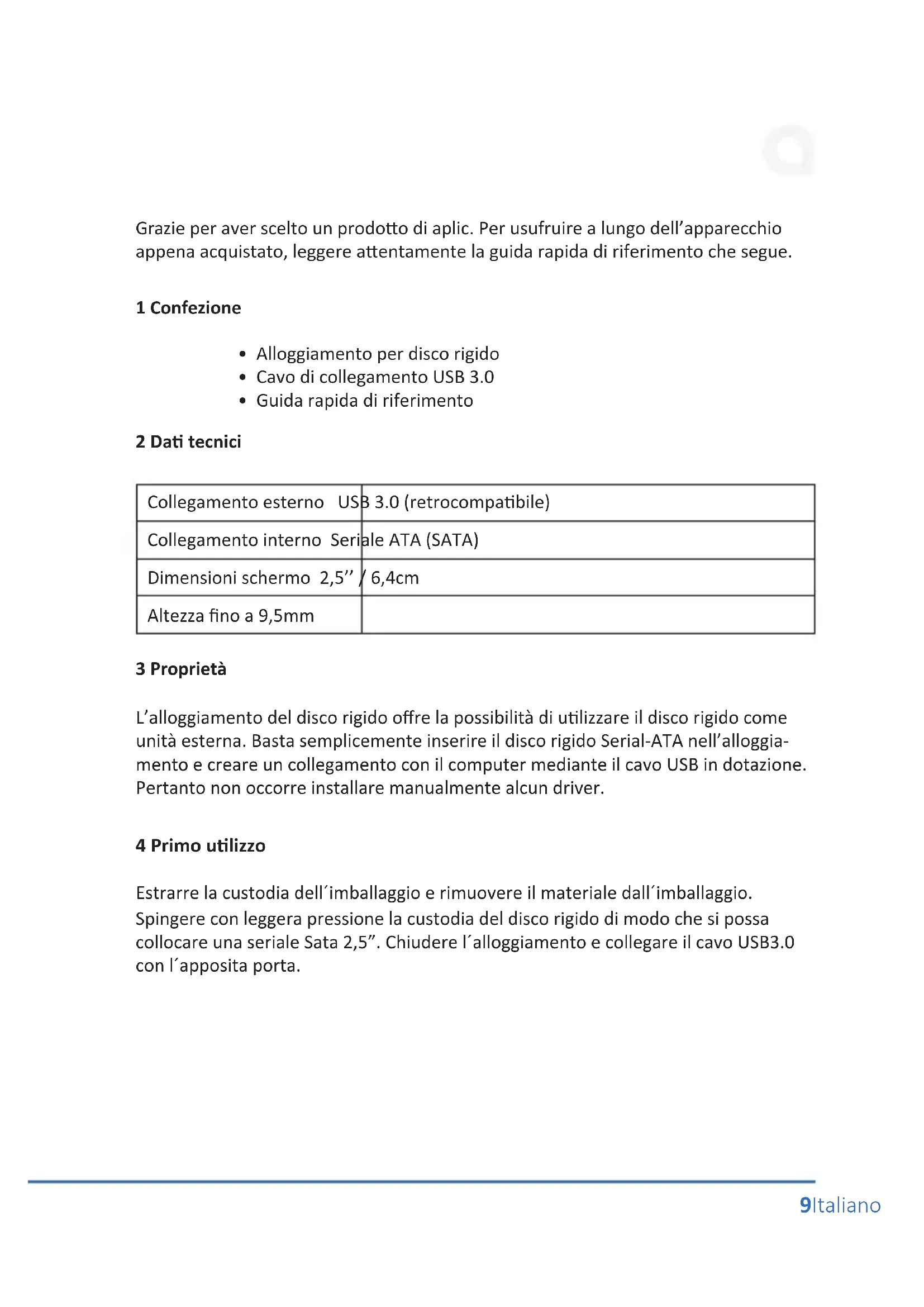 - Guida rapida di riferimento 2 Da tecnici Collegamento esterno USB 3.0 (retrocompabile) Collegamento interno Seriale ATA (SATA) Dimensioni schermo 2,5’’ / 6,4cm Altezza no a 9,5mm 3 Proprietà L’alloggiamento del disco rigido ore la possibilità di ulizzare il disco rigido come unità esterna. Basta semplicemente inserire il disco rigido Serial-ATA nell’alloggia- mento e creare un collegamento con il computer mediante il cavo USB in dotazione. Pertanto non occorre installare manualmente alcun driver. 4 Primo ulizzo Estrarre la custodia dell´imballaggio e rimuovere il materiale dall´imballaggio. Spingere con leggera pressione la custodia del disco rigido di modo che si possa collocare una seriale Sata 2,5”. Chiudere l´alloggiamento e collegare il cavo USB3.0 con l´apposita porta.10 Italiano 5 Avvertenze di sicurezza ed esclusione della responsabilità Non tentare di riparare o sistemare da soli l’alloggiamento per il disco rigido. Evitare di entrare in contao con la tensione di rete. L’alloggiamento per il disco rigido non è soo tensione solo se il conneore è staccato. Prima di toccare i componen eleronici, rimuovere l’Elericità Staca dal Proprio corpo questo modo si evitano i danni causa dalle scariche elerostache del corpo. Le scariche elerostache possono causare danni irreparabili alla scheda plug-in e a tu i componen hardware collega! L’installazione del disco rigido avviene a rischio e pericolo dell’utente. Se non si ha esperienza tecnica praca nel seore dei computer/dell’eleronica, far eseguire l’installazione da un esperto. Il produore declina qualsiasi responsabilità per danni e danni secondari causa da un’installazione o un uso inappropriato. L’ob- bligo della sicurezza dei da spea solo al cliente.L’alloggiamento del disco rigido non è omologato per il funzionamento all’esterno. Usare pertanto l’apparecchio solo in una zona asciua. Proteggerlo da elevata umidità dell’aria, da acqua e neve. Non esporre assolutamente l’apparecchio a temperature elevate.Non esporre l’apparecchio a cambi repenni di temperatura, né a for vibrazioni, poiché potrebbero danneggiare le par eleroniche. Controllare che l’apparecchio non presen eventuali danni prima di ulizzarlo. Non ulizzare l’apparecchio se ha preso un colpo o se è stato danneggiato in qualsiasi altro modo.Rispeare anche le disposizioni e le limitazioni nazionali.Non usare l’apparecchio per scopi diversi da quelli descri in questa guida di riferimento.Questo prodoo non è un giocat- tolo. Conservare l’apparecchio fuori dalla portata dei bambini o di persone men- talmente inferme.Qualsiasi riparazione o modica apportata all’apparecchio, non eseguita dal fornitore originario, comporta la decadenza dei diri di garanzia. Le speciche dell’apparecchio possono essere modicate senza preavviso. 6 Indicazioni per lo smalmento Secondo la direva europea RAEE, gli apparecchi elerici ed eleronici non possono essere smal insieme ai riu domesci. I relavi componen devono essere porta separatamente presso le struure di riciclaggio o smalmento, poiché le par tossiche e pericolose potrebbero recare gravi danni all’ambiente in caso di smalmento inappropriato.11Italiano Direva RAEE: 2012/19/EU Reg. RAEE n.: DE 94495668 In conformità alla legge sugli apparecchi eleronici (ElektroG), gli ulizzatori sono tenu a restuire al produore, ai pun vendita o ai pun di raccolta pubblici arezza gli apparecchi elerici ed eleronici al termine del loro ciclo di durata. La legislazione regionale disciplina i casi parcolari. Il simbolo sul prodoo, sulle istruzioni per l’uso e/o sulla confezione rimanda a queste direve. Grazie a que- sto po di separazione dei materiali, ulizzo e smalmento dei vecchi apparecchi, si contribuisce in modo importante alla tutela ambientale. La società WD Plus GmbH ivi dichiara che l’apparecchio 302509/20170209SZ135 è conforme ai requisi di base e alle rimanen disposizioni in materia. Per la dichiarazione di conformità completa, rivolgersi a: WD Plus GmbH, Wohlenbergstraße 16, 30179 Hannover12 Français Nous vous remercions d’avoir choisi un produit aplic. An que vous puissiez proter durablement de votre nouvel achat, veuillez lire aenvement le guide de démarrage rapide ci-dessous. 1 Contenu de la livraison