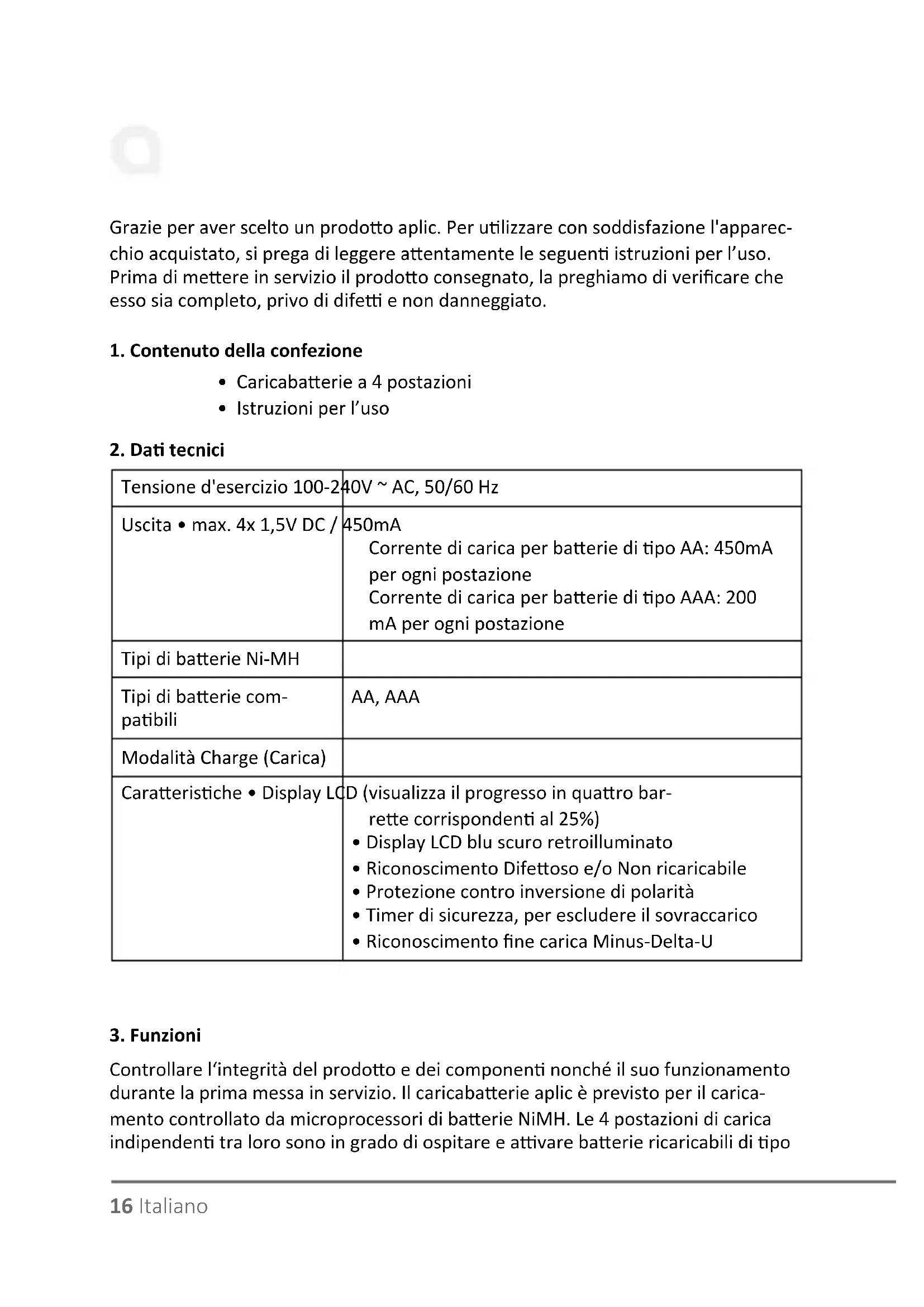 Controllare l‘integrità del prodoo e dei componen nonché il suo funzionamento durante la prima messa in servizio. Il caricabaerie aplic è previsto per il carica- mento controllato da microprocessori di baerie NiMH. Le 4 postazioni di carica indipenden tra loro sono in grado di ospitare e avare baerie ricaricabili di po Tensione d'esercizio 100-240V ~ AC, 50/60 Hz Uscita • max. 4x 1,5V DC / 450mA Corrente di carica per baerie di po AA: 450mA per ogni postazione Corrente di carica per baerie di po AAA: 200 mA per ogni postazione Tipi di baerie Ni-MH Tipi di baerie com- pabili AA, AAA Modalità Charge (Carica) Caraerische • Display LCD (visualizza il progresso in quaro bar- ree corrisponden al 25%)