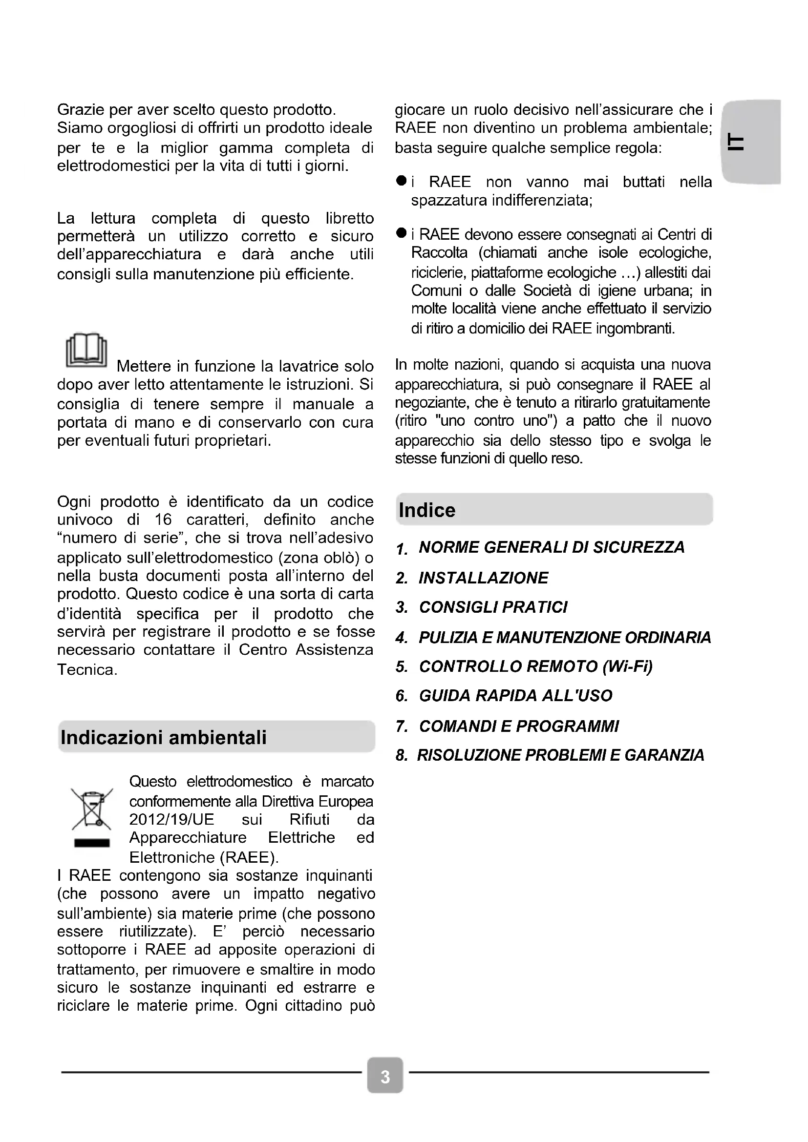 Mettere in funzione la lavatrice solo dopo aver letto attentamente le istruzioni. Si consiglia di tenere sempre il manuale a portata di mano e di conservarlo con cura per eventuali futuri proprietari.