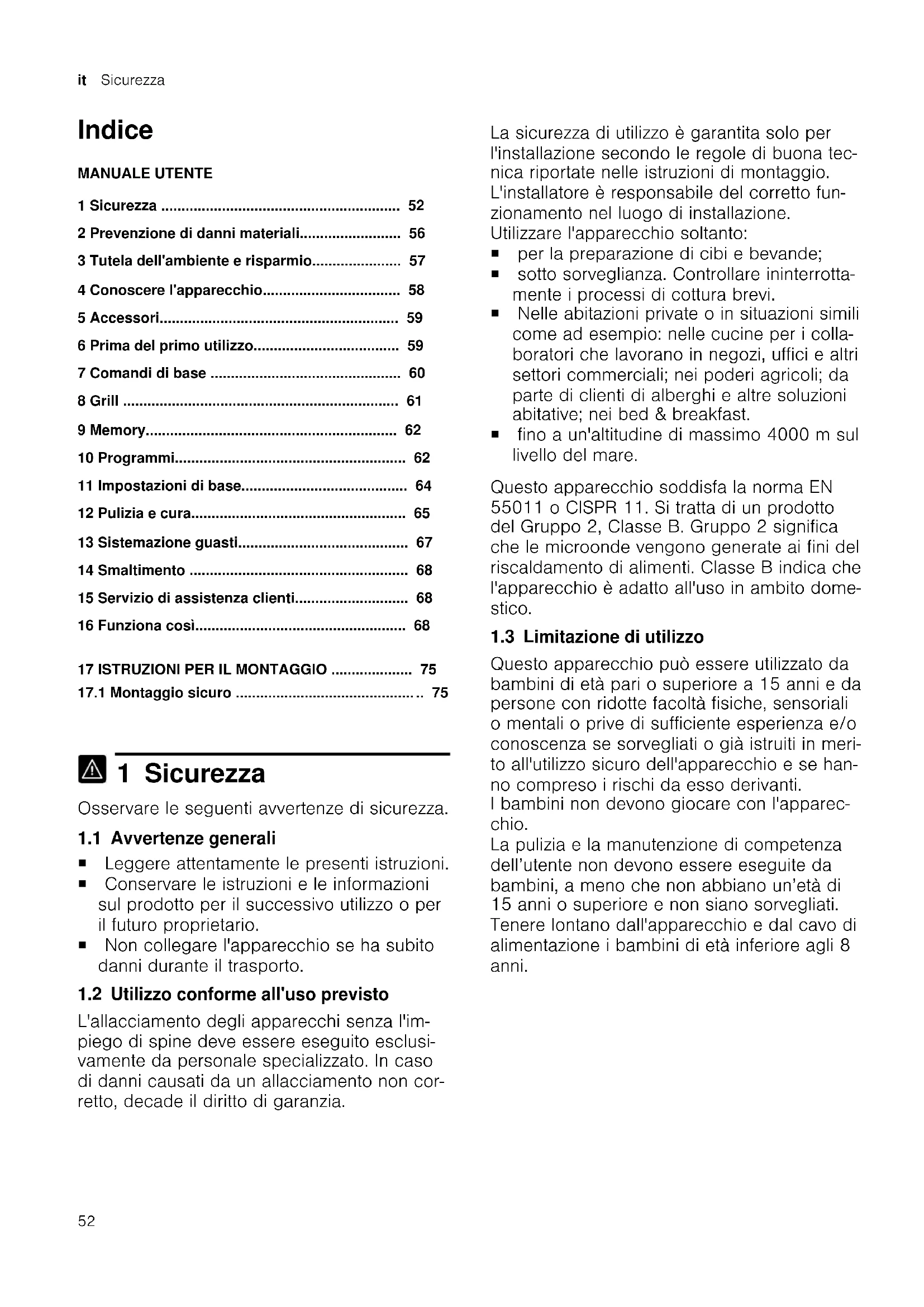 1 Sicurezza Osservare le seguenti avvertenze di sicurezza. 1.1 Avvertenze generali ¡ Leggere attentamente le presenti istruzioni. ¡ Conservare le istruzioni e le informazioni sul prodotto per il successivo utilizzo o per il futuro proprietario. ¡ Non collegare l'apparecchio se ha subito danni durante il trasporto. 1.2 Utilizzo conforme all'uso previsto L'allacciamento degli apparecchi senza l'im- piego di spine deve essere eseguito esclusi- vamente da personale specializzato. In caso di danni causati da un allacciamento non cor- retto, decade il diritto di garanzia. La sicurezza di utilizzo è garantita solo per l'installazione secondo le regole di buona tec- nica riportate nelle istruzioni di montaggio. L'installatore è responsabile del corretto fun- zionamento nel luogo di installazione. Utilizzare l'apparecchio soltanto: ¡ per la preparazione di cibi e bevande; ¡ sotto sorveglianza. Controllare ininterrotta- mente i processi di cottura brevi. ¡ Nelle abitazioni private o in situazioni simili come ad esempio: nelle cucine per i colla- boratori che lavorano in negozi, uffici e altri settori commerciali; nei poderi agricoli; da parte di clienti di alberghi e altre soluzioni abitative; nei bed & breakfast. ¡ fino a un'altitudine di massimo 4000m sul livello del mare. Questo apparecchio soddisfa la norma EN 55011 o CISPR 11. Si tratta di un prodotto del Gruppo 2, Classe B. Gruppo 2 significa che le microonde vengono generate ai fini del riscaldamento di alimenti. Classe B indica che l'apparecchio è adatto all'uso in ambito dome- stico. 1.3 Limitazione di utilizzo Questo apparecchio può essere utilizzato da bambini di età pari o superiore a 15 anni e da persone con ridotte facoltà fisiche, sensoriali o mentali o prive di sufficiente esperienza e/o conoscenza se sorvegliati o già istruiti in meri- to all'utilizzo sicuro dell'apparecchio e se han- no compreso i rischi da esso derivanti. I bambini non devono giocare con l'apparec- chio. La pulizia e la manutenzione di competenza dell’utente non devono essere eseguite da bambini, a meno che non abbiano un’età di 15 anni o superiore e non siano sorvegliati. Tenere lontano dall'apparecchio e dal cavo di alimentazione i bambini di età inferiore agli 8 anni.Sicurezza it