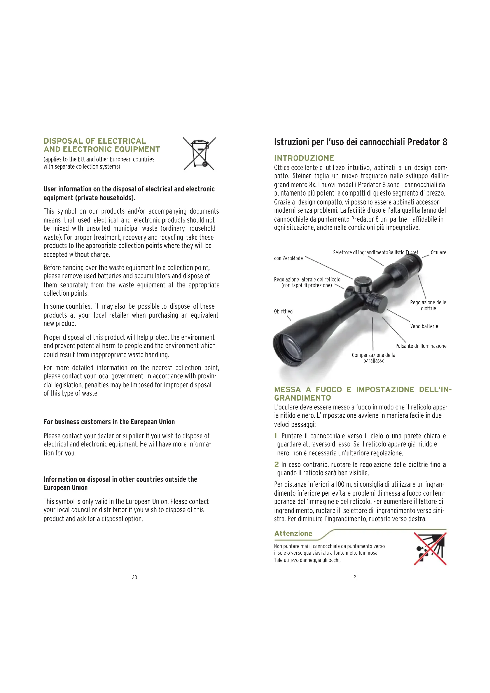(applies to the EU, and other European countries with separate collection systems) User information on the disposal of electrical and electronic equipment (private households). This symbol on our products and/or accompanying documents means that used electrical and electronic products should not be mixed with unsorted municipal waste (ordinary household waste). For proper treatment, recovery and recycling, take these products to the appropriate collection points where they will be accepted without charge. Before handing over the waste equipment to a collection point, please remove used batteries and accumulators and dispose of them separately from the waste equipment at the appropriate collection points. In some countries, it may also be possible to dispose of these products at your local retailer when purchasing an equivalent new product. Proper disposal of this product will help protect the environment and prevent potential harm to people and the environment which could result from inappropriate waste handling. For more detailed information on the nearest collection point, please contact your local government. In accordance with provin- cial legislation, penalties may be imposed for improper disposal of this type of waste. For business customers in the European Union Please contact your dealer or supplier if you wish to dispose of electrical and electronic equipment. He will have more informa- tion for you. Information on disposal in other countries outside the European Union This symbol is only valid in the European Union. Please contact your local council or distributor if you wish to dispose of this product and ask for a disposal option. MESSA A FUOCO E IMPOSTAZIONE DELL’IN- GRANDIMENTO L’oculare deve essere messo a fuoco in modo che il reticolo appa- ia nitido e nero. L’impostazione avviene in maniera facile in due veloci passaggi: 1 Puntare il cannocchiale verso il cielo o una parete chiara e guardare attraverso di esso. Se il reticolo appare già nitido e nero, non è necessaria un’ulteriore regolazione. 2 In caso contrario, ruotare la regolazione delle diottrie fino a quando il reticolo sarà ben visibile. Per distanze inferiori a 100 m, si consiglia di utilizzare un ingran- dimento inferiore per evitare problemi di messa a fuoco contem- poranea dell’immagine e del reticolo. Per aumentare il fattore di ingrandimento, ruotare il selettore di ingrandimento verso sini- stra. Per diminuire l’ingrandimento, ruotarlo verso destra. INTRODUZIONE Ottica eccellente e utilizzo intuitivo, abbinati a un design com- patto. Steiner taglia un nuovo traguardo nello sviluppo dell’in- grandimento 8x. I nuovi modelli Predator 8 sono i cannocchiali da puntamento più potenti e compatti di questo segmento di prezzo. Grazie al design compatto, vi possono essere abbinati accessori moderni senza problemi. La facilità d’uso e l’alta qualità fanno del cannocchiale da puntamento Predator 8 un partner affidabile in ogni situazione, anche nelle condizioni più impegnative. Istruzioni per l‘uso dei cannocchiali Predator 8 Attenzione Non puntare mai il cannocchiale da puntamento verso il sole o verso qualsiasi altra fonte molto luminosa! Tale utilizzo danneggia gli occhi. Regolazione delle diottrie Selettore di ingrandimentoBallistic Turret con ZeroMode Regolazione laterale del reticolo (con tappi di protezione) Compensazione della parallasse Pulsante di illuminazione Obiettivo Oculare Vano batterie