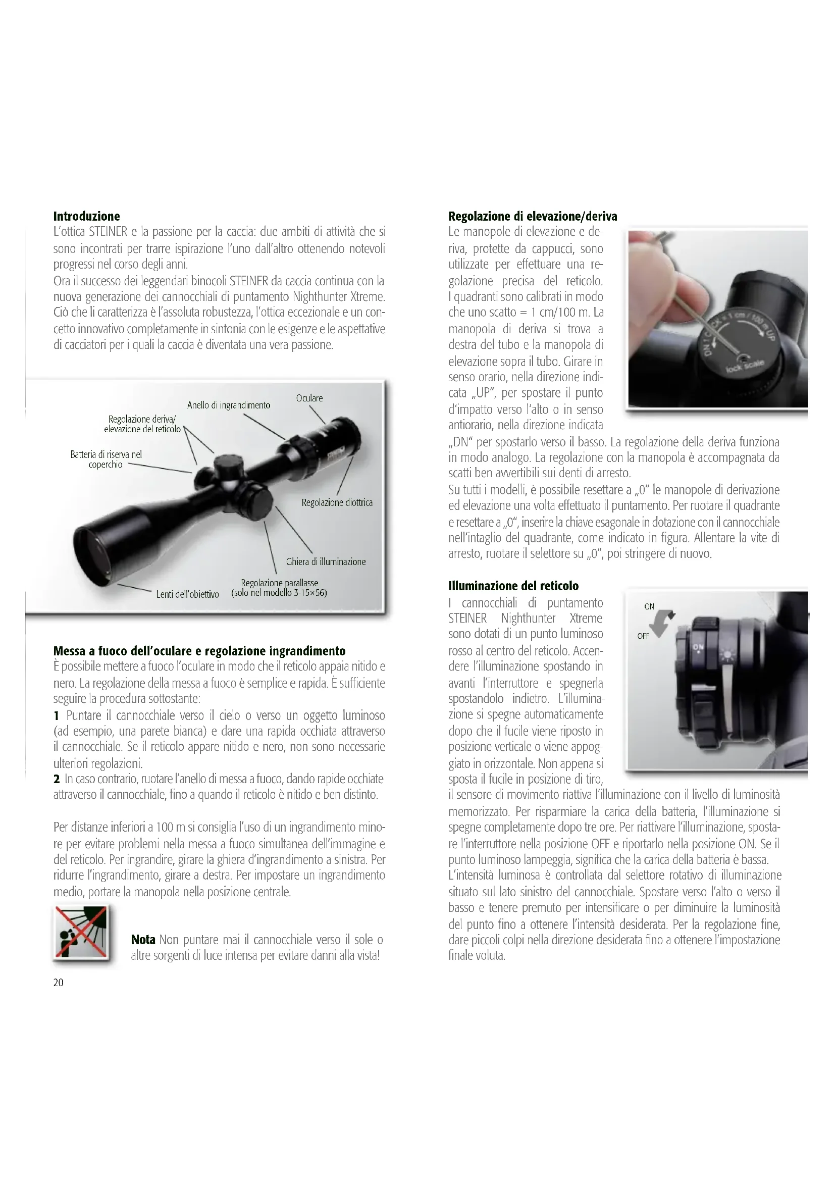 - Réticule 4A-I ** 2ans pour les pièces électroniques20 Introduzione L’ottica STEINER e la passione per la caccia: due ambiti di attività che si sono incontrati per trarre ispirazione l’uno dall’altro ottenendo notevoli progressi nel corso degli anni. Ora il successo dei leggendari binocoli STEINER da caccia continua con la nuova generazione dei cannocchiali di puntamento Nighthunter Xtreme. Ciò che li caratterizza è l’assoluta robustezza, l’ottica eccezionale e un con- cetto innovativo completamente in sintonia con le esigenze e le aspettative di cacciatori per i quali la caccia è diventata una vera passione. Messa a fuoco dell’oculare e regolazione ingrandimento È possibile mettere a fuoco l’oculare in modo che il reticolo appaia nitido e nero. La regolazione della messa a fuoco è semplice e rapida. È sufficiente seguire la procedura sottostante: 1 Puntare il cannocchiale verso il cielo o verso un oggetto luminoso (ad esempio, una parete bianca) e dare una rapida occhiata attraverso il cannocchiale. Se il reticolo appare nitido e nero, non sono necessarie ulteriori regolazioni. 2 In caso contrario, ruotare l’anello di messa a fuoco, dando rapide occhiate attraverso il cannocchiale, fino a quando il reticolo è nitido e ben distinto. Per distanze inferiori a 100 m si consiglia l’uso di un ingrandimento mino- re per evitare problemi nella messa a fuoco simultanea dell’immagine e del reticolo. Per ingrandire, girare la ghiera d’ingrandimento a sinistra. Per ridurre l’ingrandimento, girare a destra. Per impostare un ingrandimento medio, portare la manopola nella posizione centrale. Regolazione di elevazione/deriva Le manopole di elevazione e de- riva, protette da cappucci, sono utilizzate per effettuare una re- golazione precisa del reticolo. I quadranti sono calibrati in modo che uno scatto = 1 cm/100 m. La manopola di deriva si trova a destra del tubo e la manopola di elevazione sopra il tubo. Girare in senso orario, nella direzione indi- cata „UP“, per spostare il punto d‘impatto verso l‘alto o in senso antiorario, nella direzione indicata „DN“ per spostarlo verso il basso. La regolazione della deriva funziona in modo analogo. La regolazione con la manopola è accompagnata da scatti ben avvertibili sui denti di arresto. Su tutti i modelli, è possibile resettare a „0“ le manopole di derivazione ed elevazione una volta effettuato il puntamento. Per ruotare il quadrante e resettare a „0“, inserire la chiave esagonale in dotazione con il cannocchiale nell‘intaglio del quadrante, come indicato in figura. Allentare la vite di arresto, ruotare il selettore su „0“, poi stringere di nuovo. Illuminazione del reticolo I cannocchiali di puntamento STEINER Nighthunter Xtreme sono dotati di un punto luminoso rosso al centro del reticolo. Accen- dere l’illuminazione spostando in avanti l’interruttore e spegnerla spostandolo indietro. L’illumina- zione si spegne automaticamente dopo che il fucile viene riposto in posizione verticale o viene appog- giato in orizzontale. Non appena si sposta il fucile in posizione di tiro, il sensore di movimento riattiva l’illuminazione con il livello di luminosità memorizzato. Per risparmiare la carica della batteria, l’illuminazione si spegne completamente dopo tre ore. Per riattivare l’illuminazione, sposta- re l’interruttore nella posizione OFF e riportarlo nella posizione ON. Se il punto luminoso lampeggia, significa che la carica della batteria è bassa. L’intensità luminosa è controllata dal selettore rotativo di illuminazione situato sul lato sinistro del cannocchiale. Spostare verso l’alto o verso il basso e tenere premuto per intensificare o per diminuire la luminosità del punto fino a ottenere l’intensità desiderata. Per la regolazione fine, dare piccoli colpi nella direzione desiderata fino a ottenere l’impostazione finale voluta. Nota Non puntare mai il cannocchiale verso il sole o altre sorgenti di luce intensa per evitare danni alla vista! Regolazione deriva/ elevazione del reticolo Regolazione parallasse (solo nel modello 3-15×56) Ghiera di illuminazione Batteria di riserva nel coperchio Lenti dell’obiettivo Oculare Regolazione diottrica Anello di ingrandimento