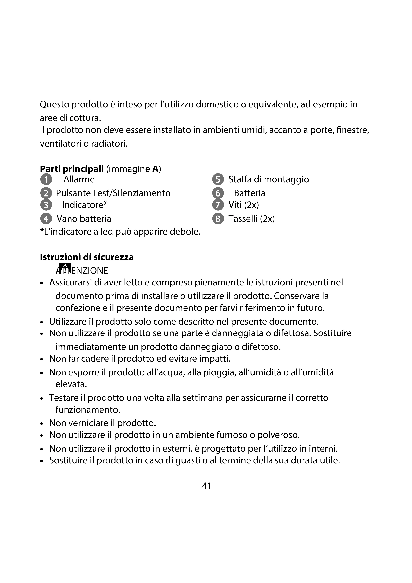- Testare il prodotto una volta alla settimana per assicurarne il corretto funzionamento.