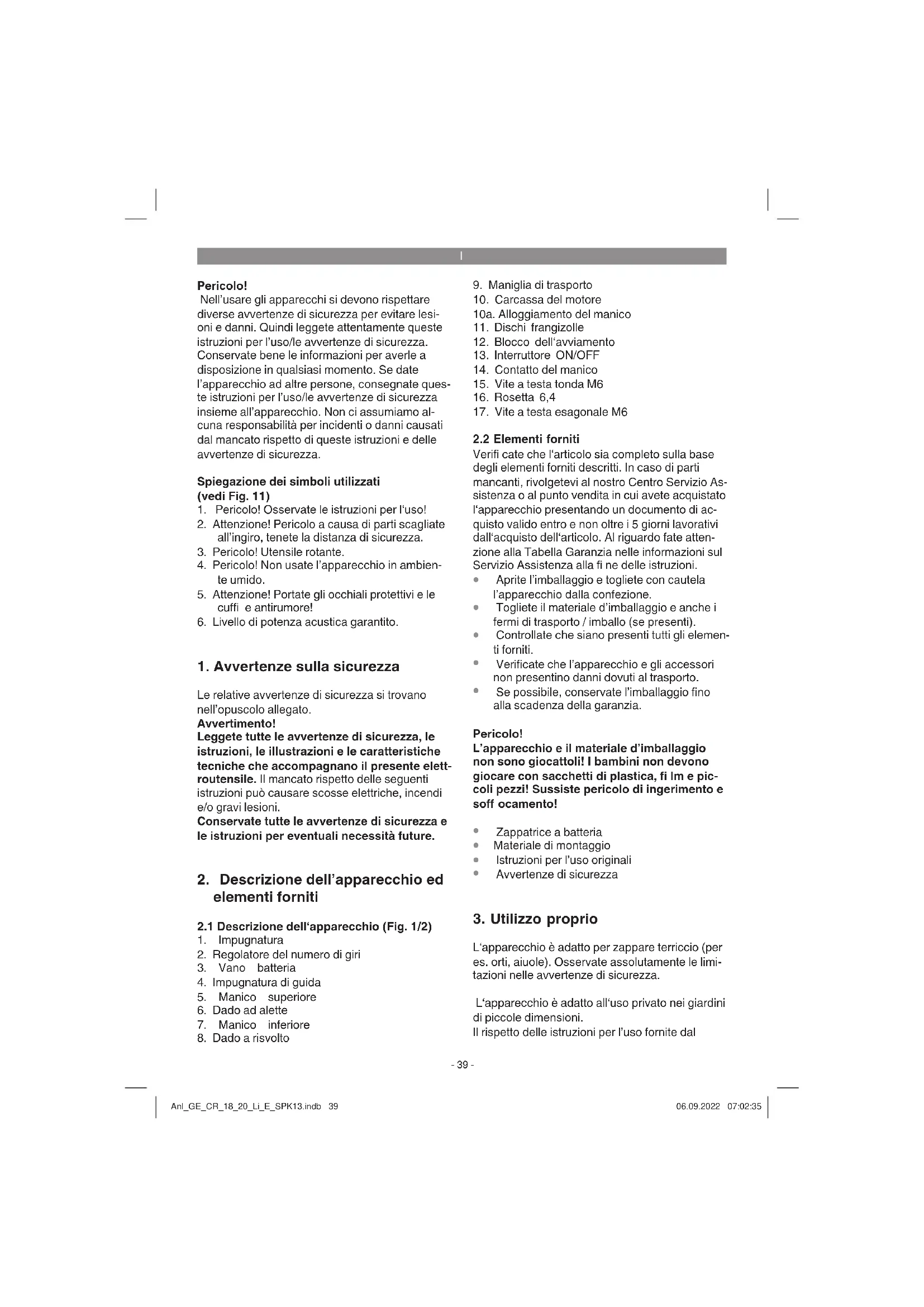 L‘apparecchio è adatto per zappare terriccio (per es. orti, aiuole). Osservate assolutamente le limi- tazioni nelle avvertenze di sicurezza. L‘apparecchio è adatto all‘uso privato nei giardini di piccole dimensioni. Il rispetto delle istruzioni per l’uso fornite dal Anl_GE_CR_18_20_Li_E_SPK13.indb 39Anl_GE_CR_18_20_Li_E_SPK13.indb 39 06.09.2022 07:02:3506.09.2022 07:02:35I