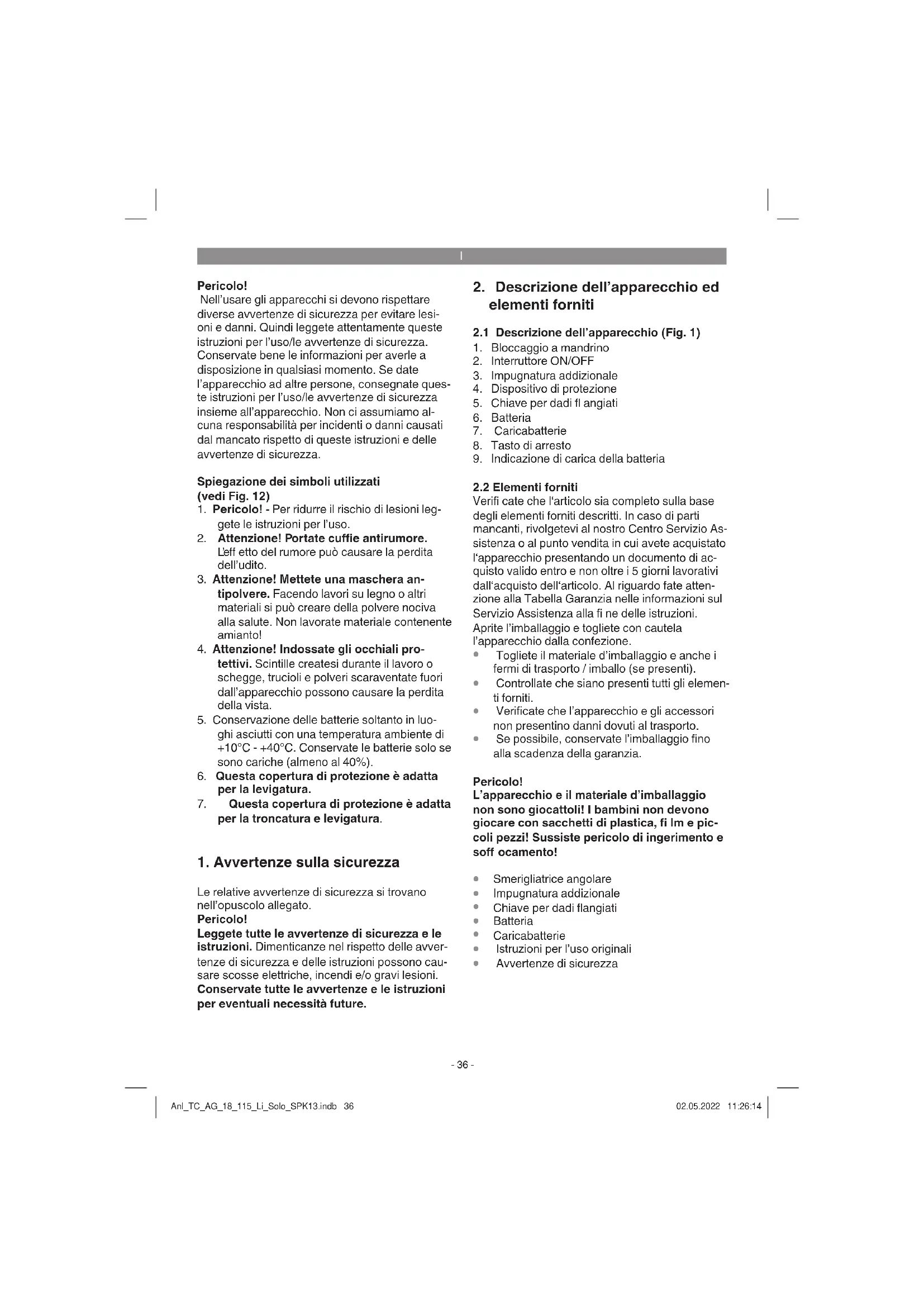 Avvertimento! Togliete sempre la batteria prima di eseguire re- golazioni sull‘apparecchio. Prima di mettere in esercizio il vostro apparecchio a batteria leggete assolutamente le seguenti av- vertenze: