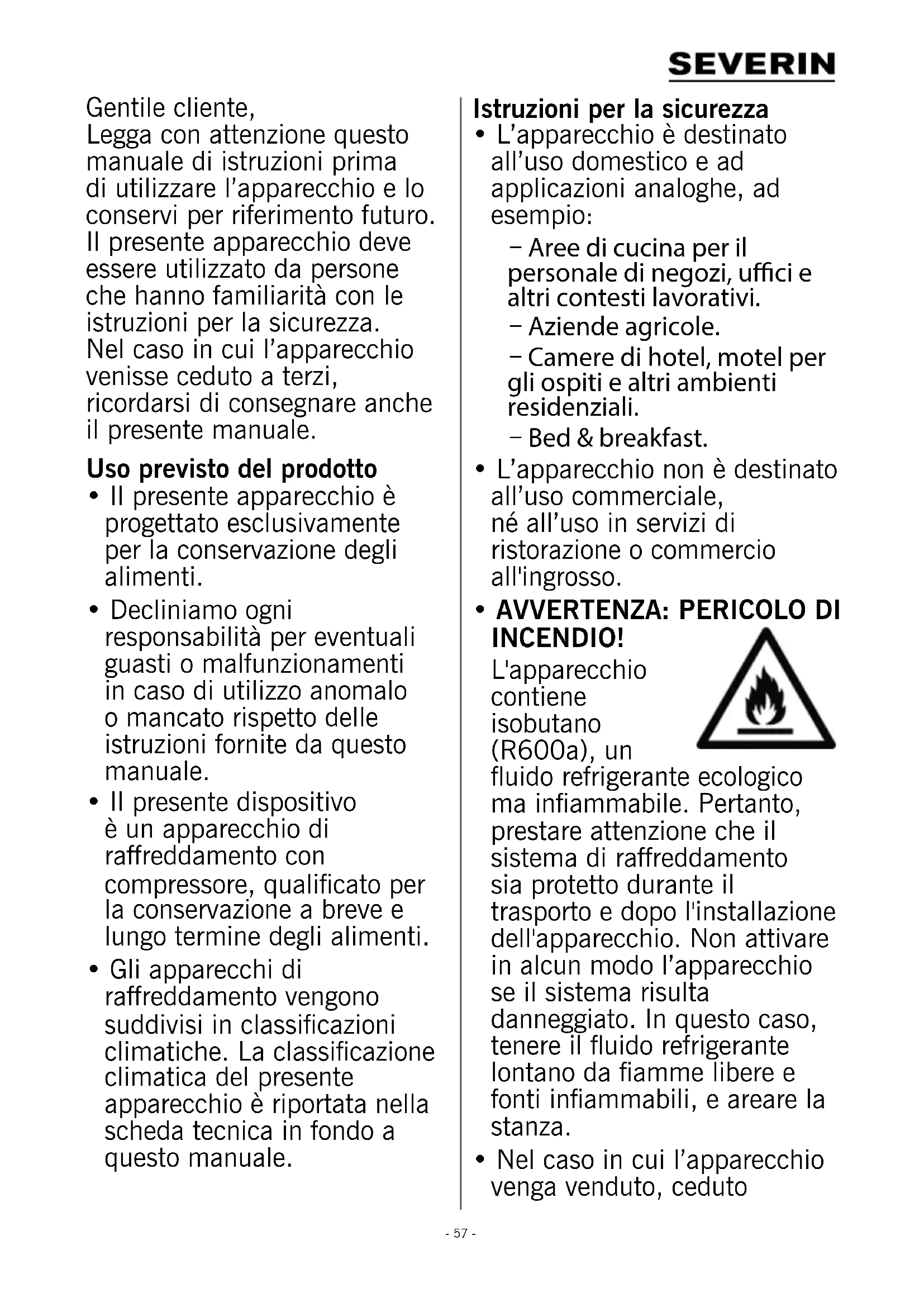 - Nel caso in cui l’apparecchio venga venduto, ceduto- 58 - a terzi o sottoposto al riciclaggio, fare riferimento al propellente inammabile ciclopentano (C