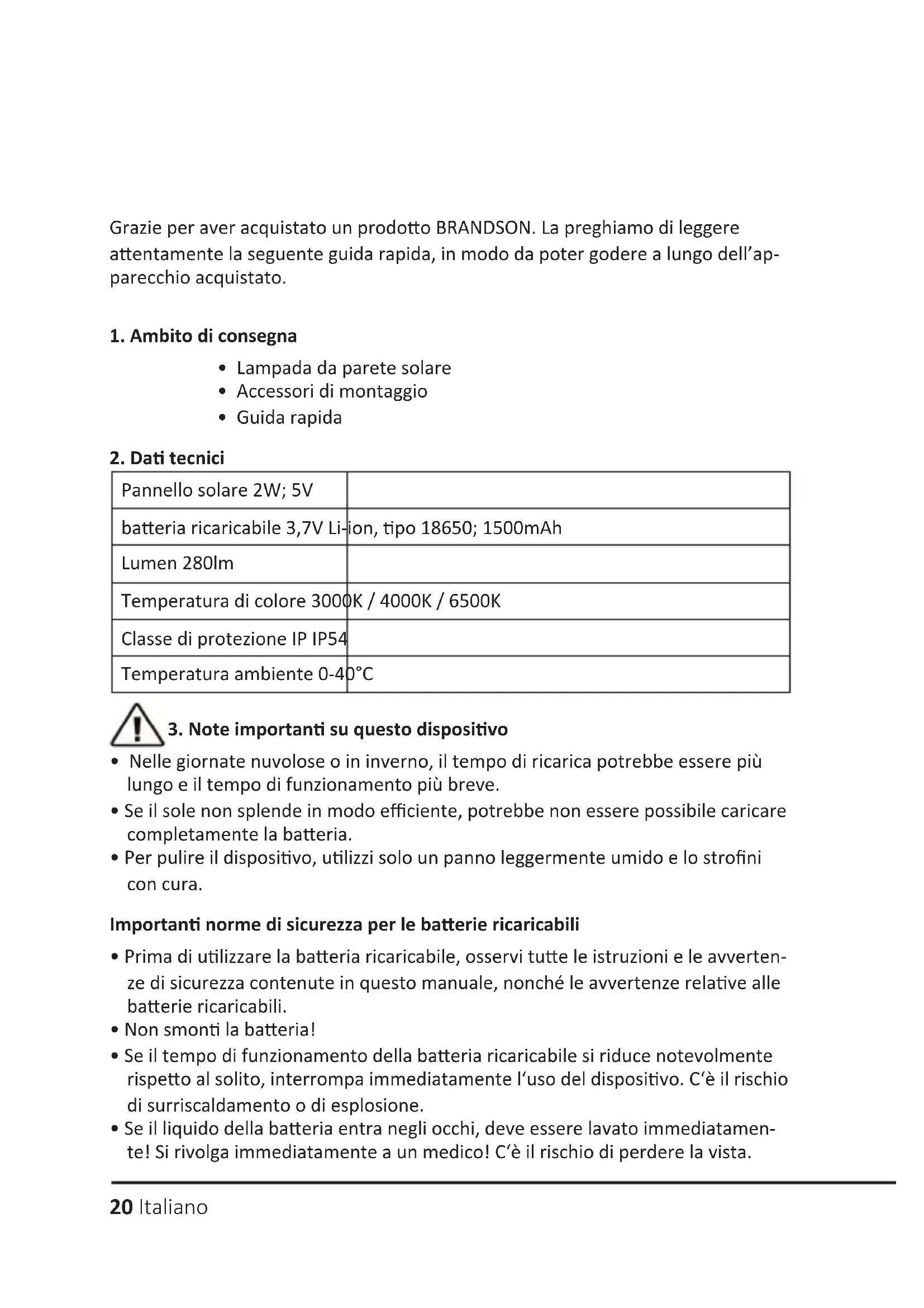Scarica le istruzioni per il tuo Illuminazione solare in formato PDF gratuitamente! Trova il tuo manuale 307152 - Brandson e riprendi in mano il tuo dispositivo elettronico. In questa pagina sono pubblicati tutti i documenti necessari per l'utilizzo del tuo dispositivo. 307152 del marchio Brandson.