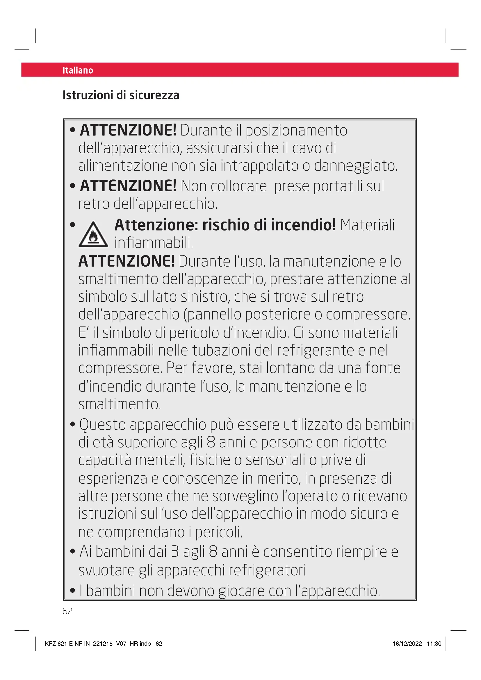 - I bambini non devono giocare con l’apparecchio. KFZ 621 E NF IN_221215_V07_HR.indb 62KFZ 621 E NF IN_221215_V07_HR.indb 62 16/12/2022 11:3016/12/2022 11:30Italiano