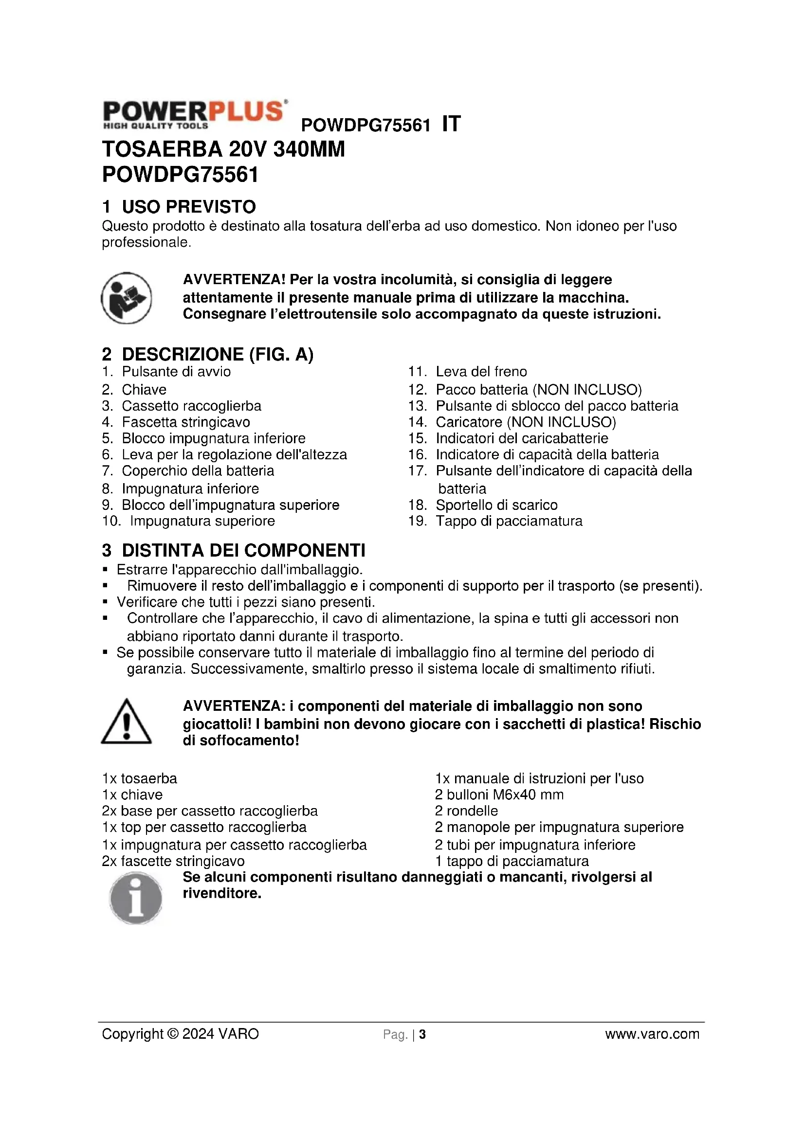 - Prestare particolare attenzione durante l'inversione di direzione del tosaerba e quando lo si tira verso di sé. Non avviare il motore se il sacco raccoglierba non è presente.POWDPG75561 IT Copyright © 2024 VARO Pag. | 7 www.varo.com