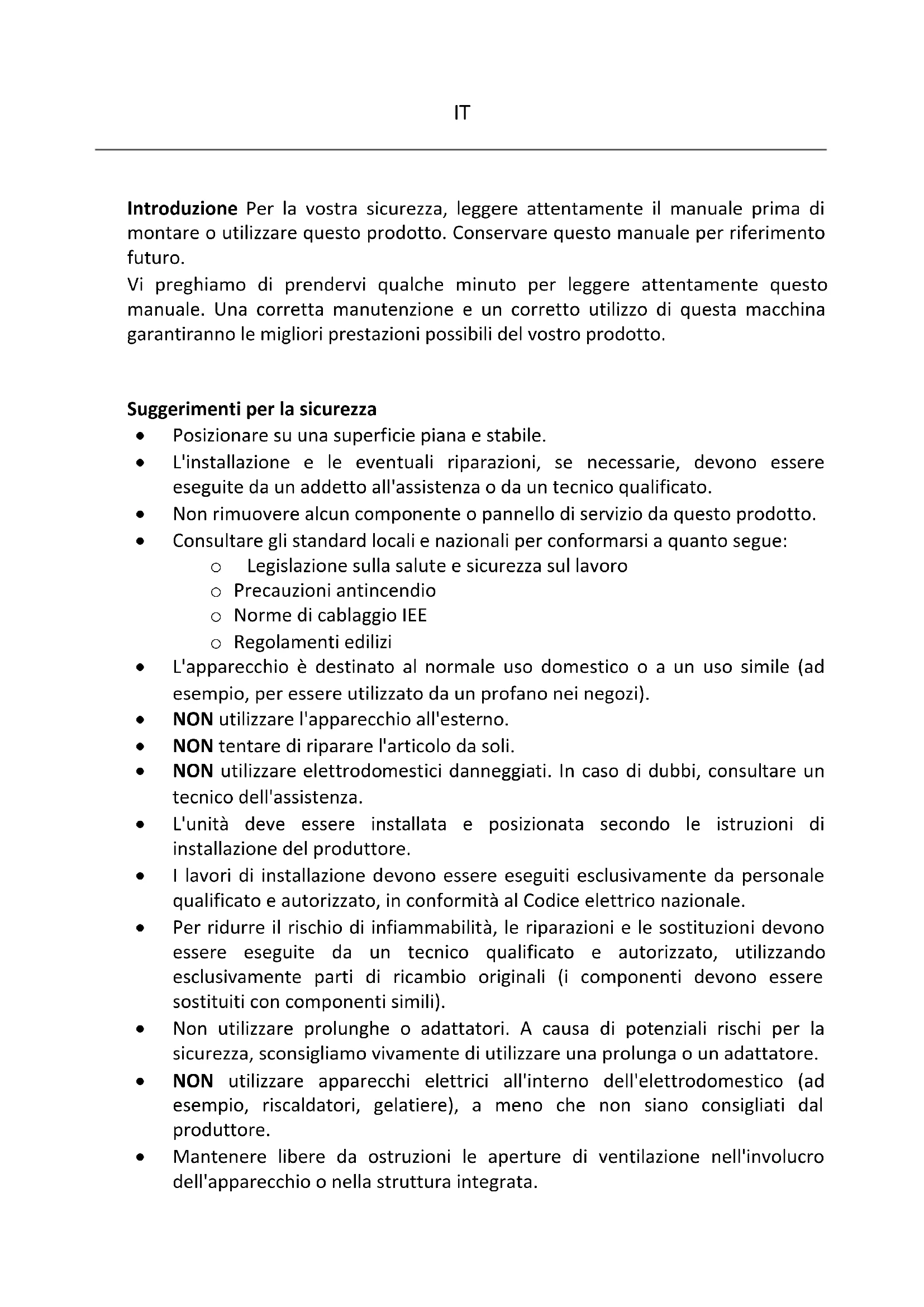 Introduzione Per la vostra sicurezza, leggere attentamente il manuale prima di montare o utilizzare questo prodotto. Conservare questo manuale per riferimento futuro. Vi preghiamo di prendervi qualche minuto per leggere attentamente questo manuale. Una corretta manutenzione e un corretto utilizzo di questa macchina garantiranno le migliori prestazioni possibili del vostro prodotto.