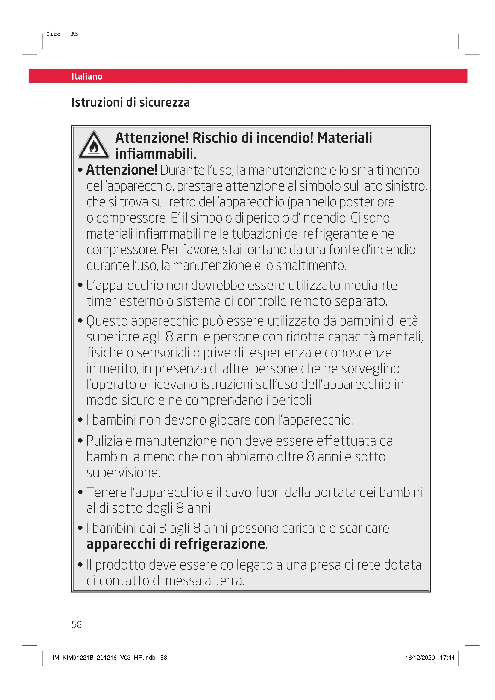 - L’apparecchio contiene gas isolanti infiammabili e deve quindi essere smaltito da strutture speciali. IM_KIM91221B_201216_V03_HR.indb 59IM_KIM91221B_201216_V03_HR.indb 59 16/12/2020 17:4416/12/2020 17:44Italiano