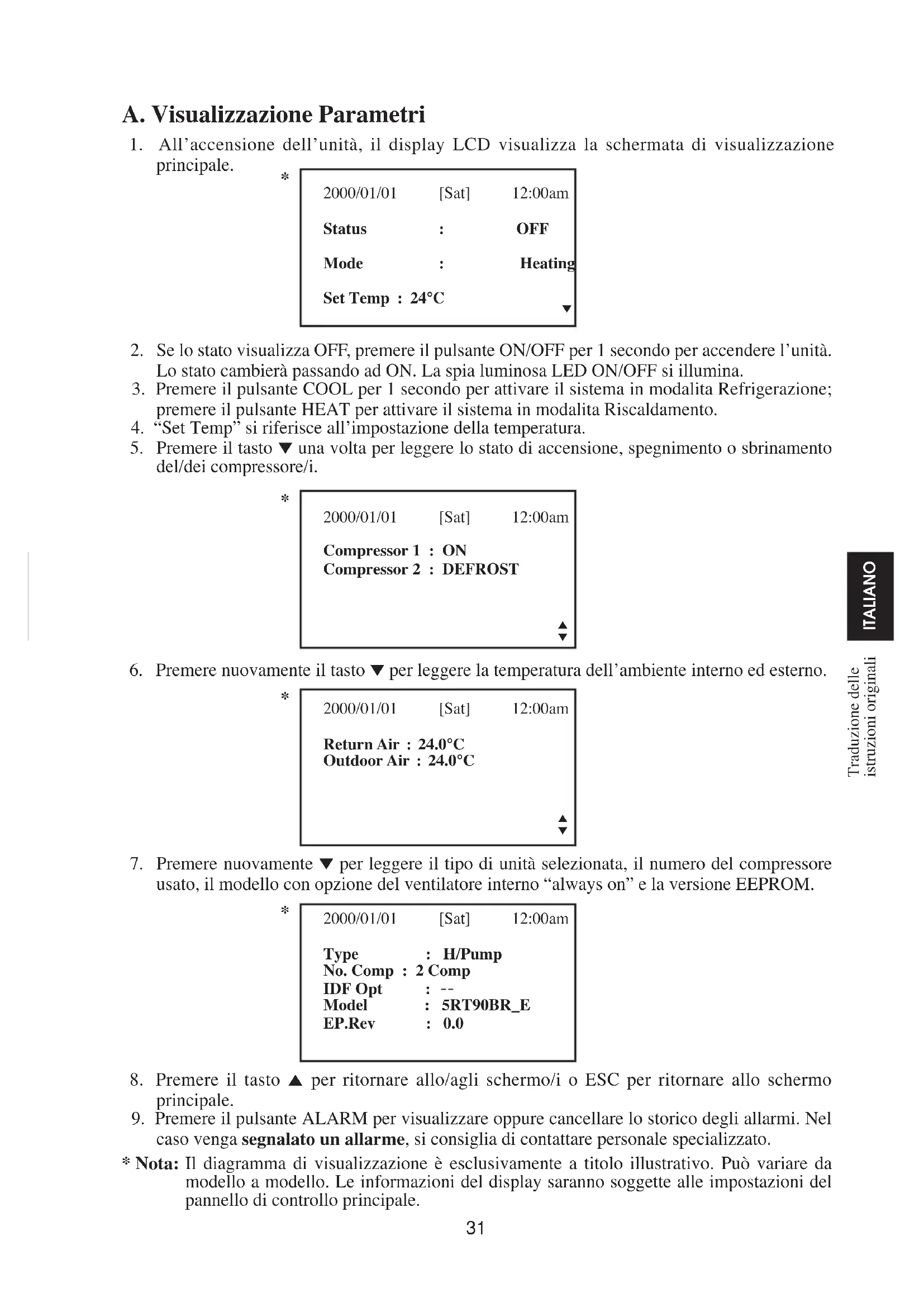 usato, il modello con opzione del ventilatore interno “always on” e la versione EEPROM. 2000/01/01 [Sat] 12:00am Type : H/Pump No. Comp : 2 Comp IDF Opt : Model : 5RT90BR_E EP.Rev : 0.0