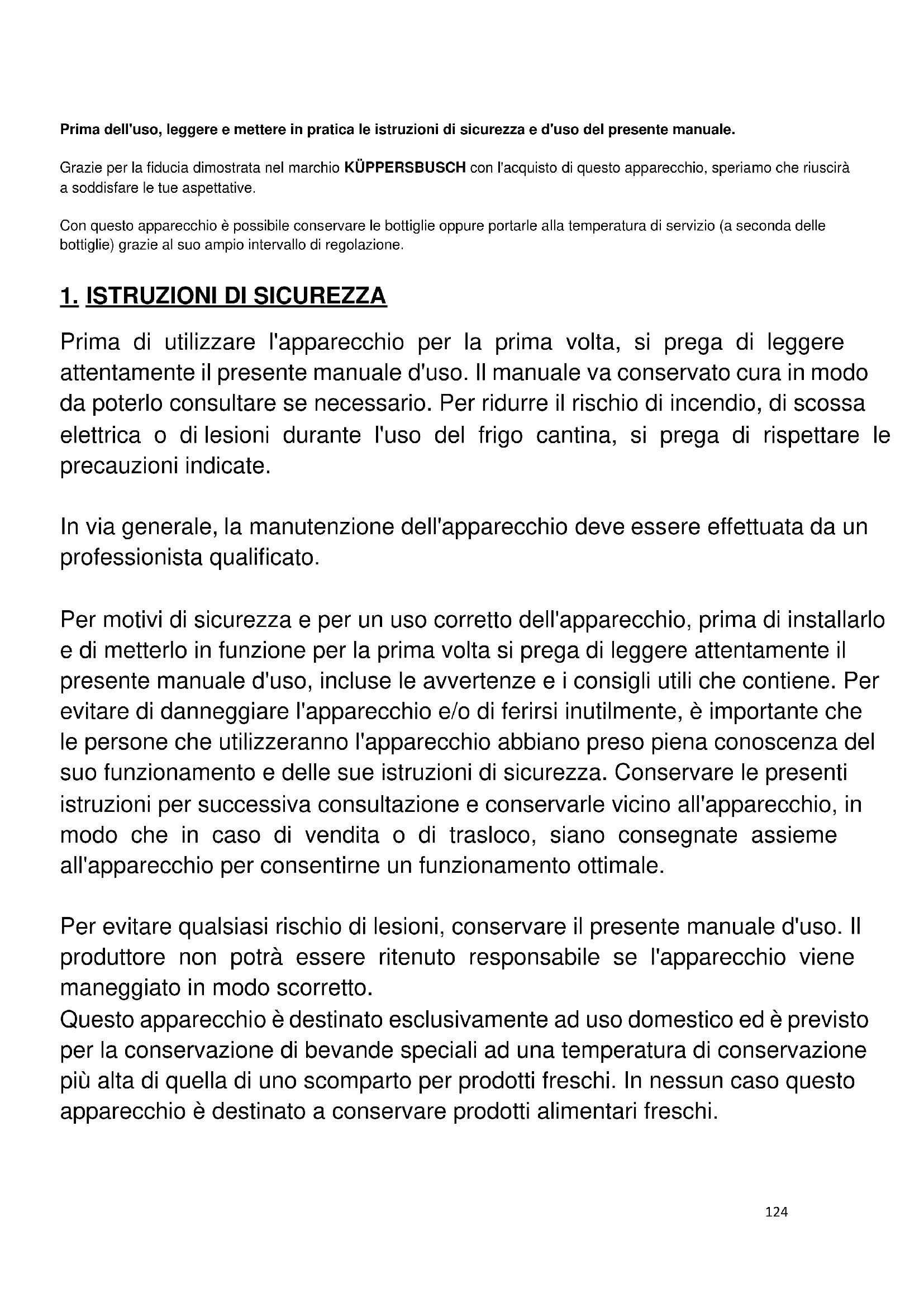 Prima di utilizzare l'apparecchio per la prima volta, si prega di leggere attentamente il presente manuale d'uso. Il manuale va conservato cura in modo da poterlo consultare se necessario. Per ridurre il rischio di incendio, di scossa elettrica o di lesioni durante l'uso del frigo cantina, si prega di rispettare le precauzioni indicate. In via generale, la manutenzione dell'apparecchio deve essere effettuata da un professionista qualificato. Per motivi di sicurezza e per un uso corretto dell'apparecchio, prima di installarlo e di metterlo in funzione per la prima volta si prega di leggere attentamente il presente manuale d'uso, incluse le avvertenze e i consigli utili che contiene. Per evitare di danneggiare l'apparecchio e/o di ferirsi inutilmente, è importante che le persone che utilizzeranno l'apparecchio abbiano preso piena conoscenza del suo funzionamento e delle sue istruzioni di sicurezza. Conservare le presenti istruzioni per successiva consultazione e conservarle vicino all'apparecchio, in modo che in caso di vendita o di trasloco, siano consegnate assieme all'apparecchio per consentirne un funzionamento ottimale. Per evitare qualsiasi rischio di lesioni, conservare il presente manuale d'uso. Il produttore non potrà essere ritenuto responsabile se l'apparecchio viene maneggiato in modo scorretto. Questo apparecchio è destinato esclusivamente ad uso domestico ed è previsto per la conservazione di bevande speciali ad una temperatura di conservazione più alta di quella di uno scomparto per prodotti freschi. In nessun caso questo apparecchio è destinato a conservare prodotti alimentari freschi.125