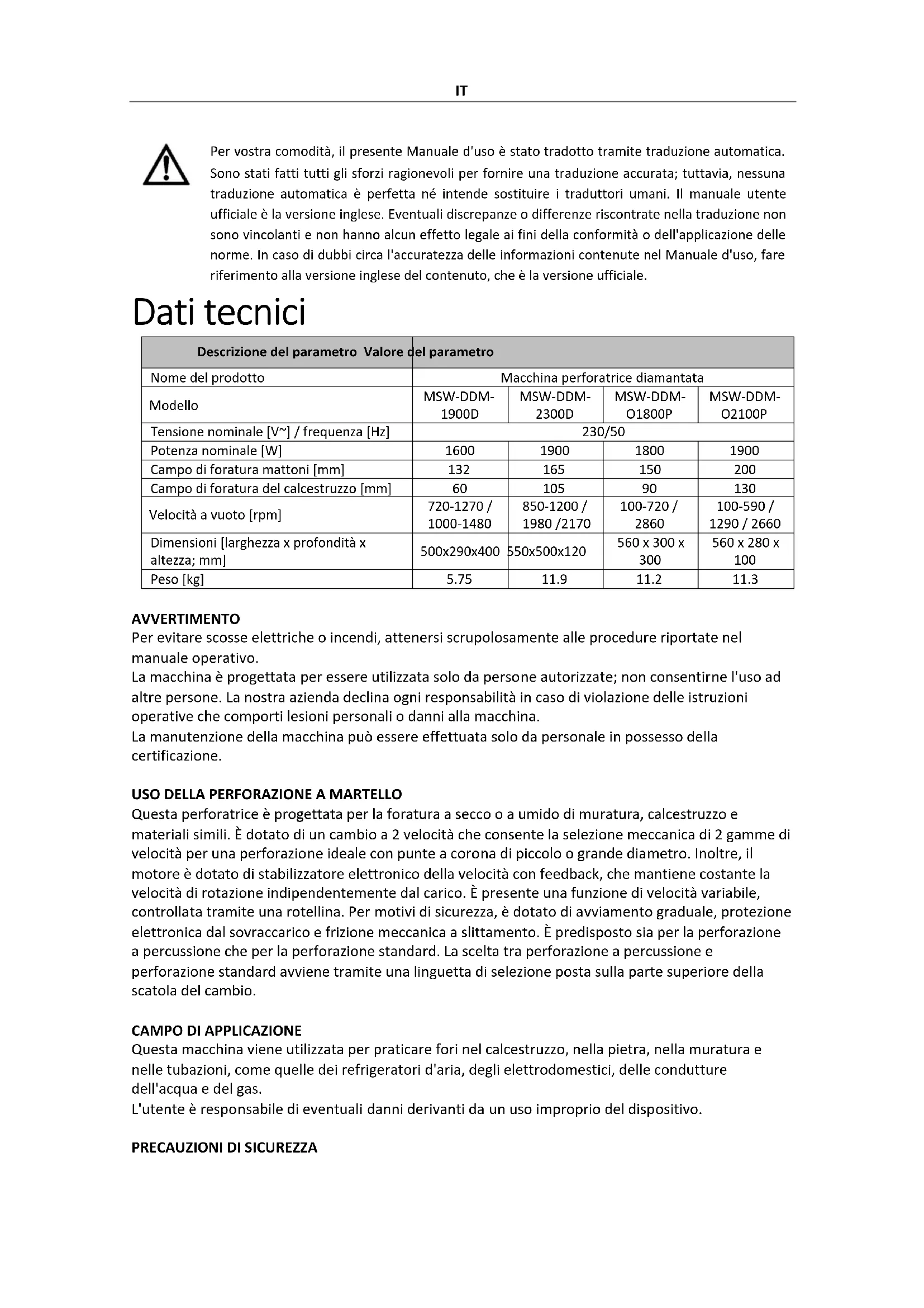 Après avoir utilisé la machine pendant environ 300 heures, vous devez vérifier l'usure des balais de charbon et les remplacer si nécessaire. Comme tout autre travail sur le moteur, celui-ci doit être effectué par un électricien spécialisé.IT Per vostra comodità, il presente Manuale d'uso è stato tradotto tramite traduzione automatica. Sono stati fatti tutti gli sforzi ragionevoli per fornire una traduzione accurata; tuttavia, nessuna traduzione automatica è perfetta né intende sostituire i traduttori umani. Il manuale utente ufficiale è la versione inglese. Eventuali discrepanze o differenze riscontrate nella traduzione non sono vincolanti e non hanno alcun effetto legale ai fini della conformità o dell'applicazione delle norme. In caso di dubbi circa l'accuratezza delle informazioni contenute nel Manuale d'uso, fare riferimento alla versione inglese del contenuto, che è la versione ufficiale. Dati tecnici Descrizione del parametro Valore del parametro Nome del prodotto Macchina perforatrice diamantata Modello MSW-DDM- 1900D MSW-DDM- 2300D MSW-DDM- O1800P MSW-DDM- O2100P Tensione nominale [V~] / frequenza [Hz] 230/50 Potenza nominale [W]