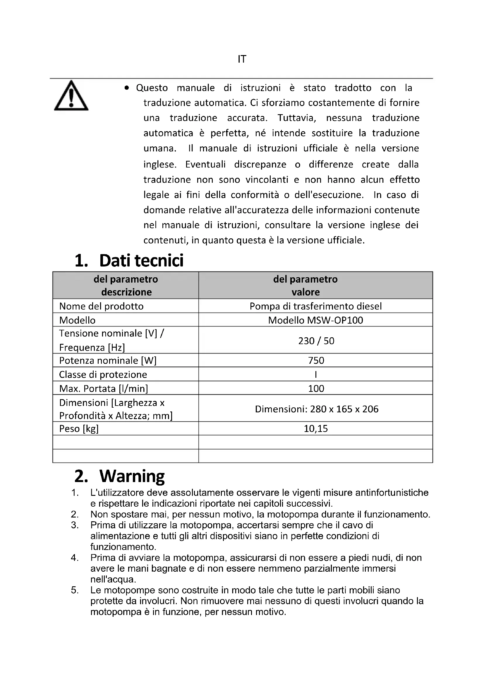OP100 - Pompa MSW - Manuale utente e istruzioni gratuiti