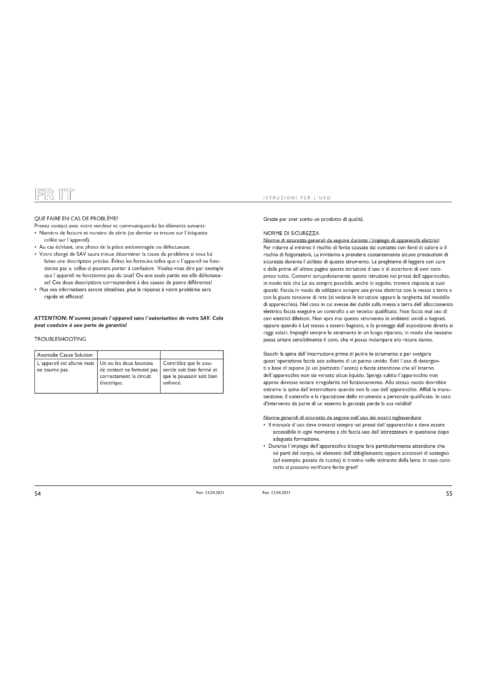 Rev. 13.04.2021• Per la pulizia dell´apparecchio bisognerebbe utilizzare in generale una spugna oppure un panno. Si invita a eliminare ogni residuo alimentare per evitare un cattivo funzionamento.