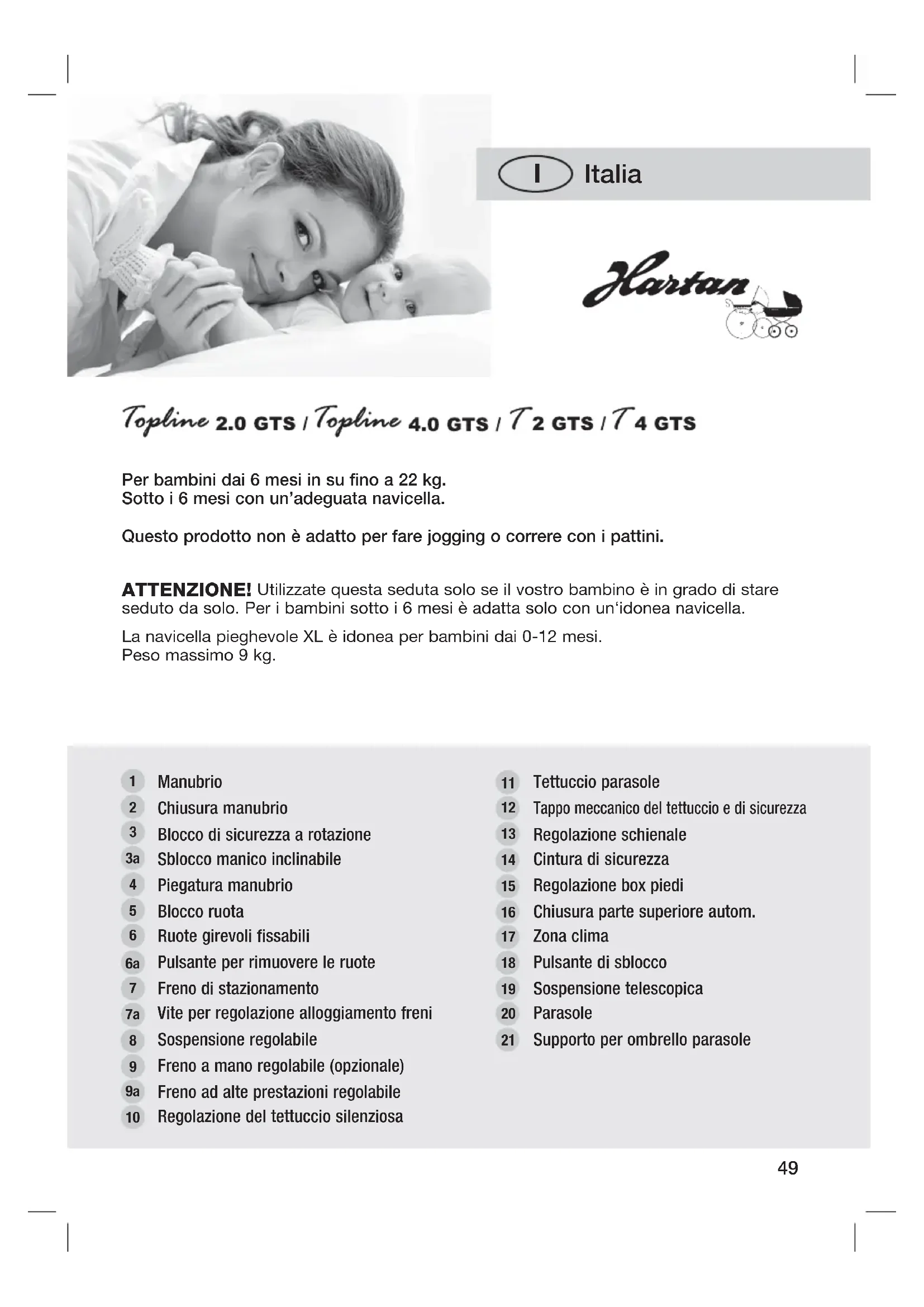 21ATTENZIONE! – Prima dell’uso assicuratevi che il passeggino non sia danneggiato e che nessuno dei suoi componenti sia strappato o rotto. In caso contrario, è fatto assoluto divieto di utilizzarlo. ATTENZIONE! – Quando aprite e chiudete il passeggino assicuratevi che il bambino sia lontano dalla vostra portata per evitare che si ferisca. ATTENZIONE! – Non lasciate mai il bambino incustodito sul passeggino. ATTENZIONE! – Prima dell’uso assicuratevi che la navicella, la seduta o il seggiolino per auto siano correttamente agganciati. ATTENZIONE! – Salire o scendere per le scale e sovraccaricare il passeggino può causare danni e mettere in pericolo il vostro bambino. ATTENZIONE! – Parcheggiate sempre il passeggino azionando il freno di stazionamento e quando utilizzate i mezzi pubblici mettetelo in una posizione sicura. ATTENZIONE! – I passeggini, le carrozzine e le navicelle non sono lettini né sostituti della culla e quindi devono essere utilizzati solo per il trasporto. ATTENZIONE! – L’utilizzo del passeggino per fare jogging, pattinare e simili è pericoloso e quindi è vietato. ATTENZIONE! – Tenete i bambini che giocano lontani dal passeggino e non permettete loro di utilizzarlo come se fosse un gioco. ATTENZIONE! – Utilizzate sempre l’imbracatura di sicurezza. ATTENZIONE! – Non appendere borse o pesi al manico, allo schienale o ai lati del passeggino perché possono comprometterne la stabilità. ATTENZIONE! – Non utilizzate mai il parapioggia senza la capottina (pericolo di soffocamento). Non esporre mai il parapioggia al sole quando il bambino è all’interno del passeggino (surriscaldamento). ATTENZIONE! – Tenete il passeggino lontano dal fuoco e dalle fonti di calore. ATTENZIONE! – Questo modello è omologato per 1 bambino. ATTENZIONE! – Per questo modello non è ammessa una seconda seduta. ATTENZIONE! – Non utilizzate la seduta, la parte superiore del passeggino o la navicella per il trasporto in auto. ATTENZIONE! – Rimuovete subito tutte le plastiche di imballaggio e non permettete al vostro bambino di giocarci (pericolo di soffocamento). ATTENZIONE! – Non utilizzate accessori e componenti non autorizzati dal produttore. ATTENZIONE! – Quando usate il passeggino con il manico inclinabile sul lato della ruota piroettante, assicuratevi che le ruote piroettanti siano bloccate in posizione. Per la sicurezza del vostro bambino