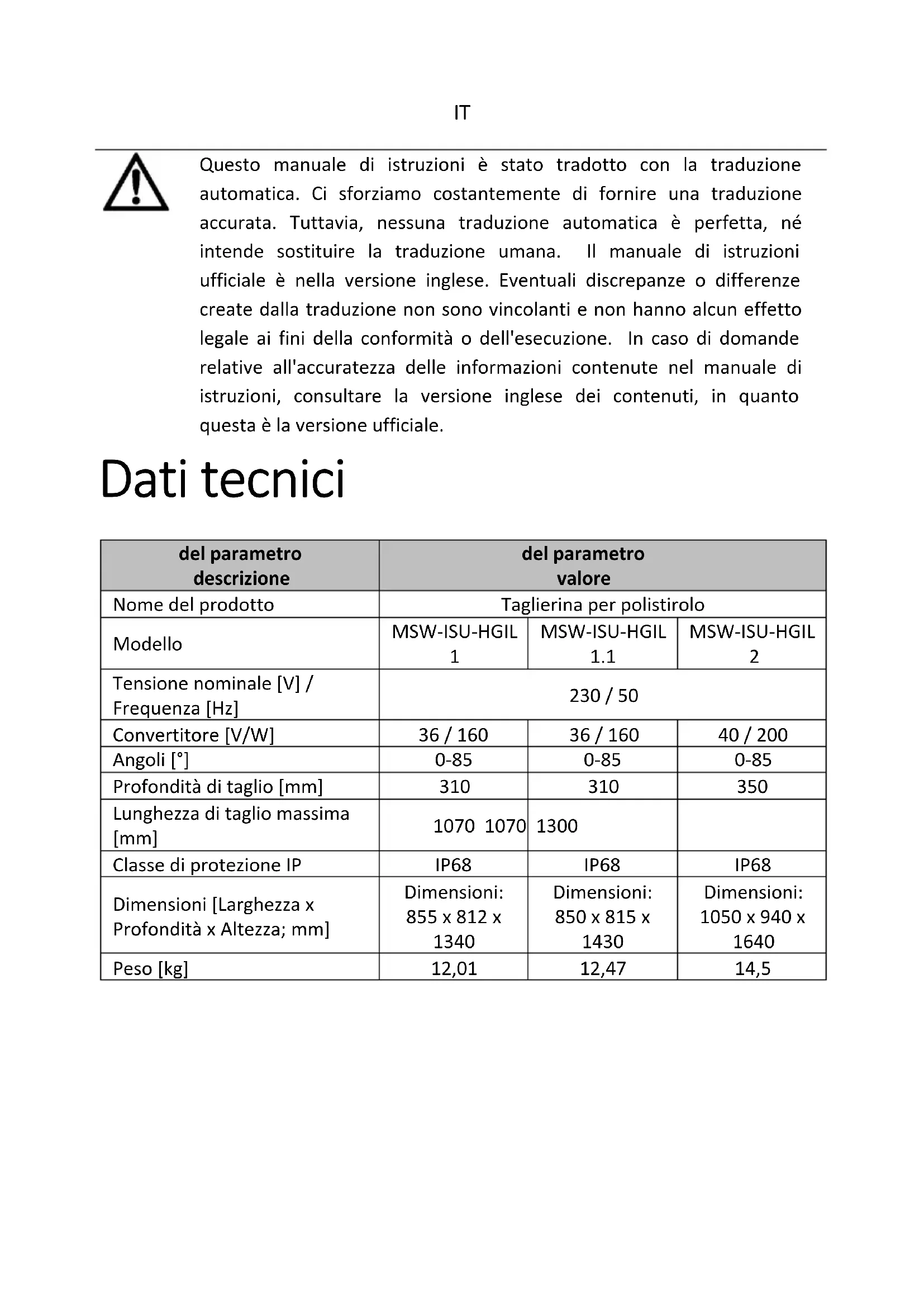Questo manuale di istruzioni è stato tradotto con la traduzione automatica. Ci sforziamo costantemente di fornire una traduzione accurata. Tuttavia, nessuna traduzione automatica è perfetta, né intende sostituire la traduzione umana. Il manuale di istruzioni ufficiale è nella versione inglese. Eventuali discrepanze o differenze create dalla traduzione non sono vincolanti e non hanno alcun effetto legale ai fini della conformità o dell'esecuzione. In caso di domande relative all'accuratezza delle informazioni contenute nel manuale di istruzioni, consultare la versione inglese dei contenuti, in quanto questa è la versione ufficiale. Dati tecnici del parametro descrizione del parametro valore Nome del prodotto Taglierina per polistirolo Modello MSW-ISU-HGIL