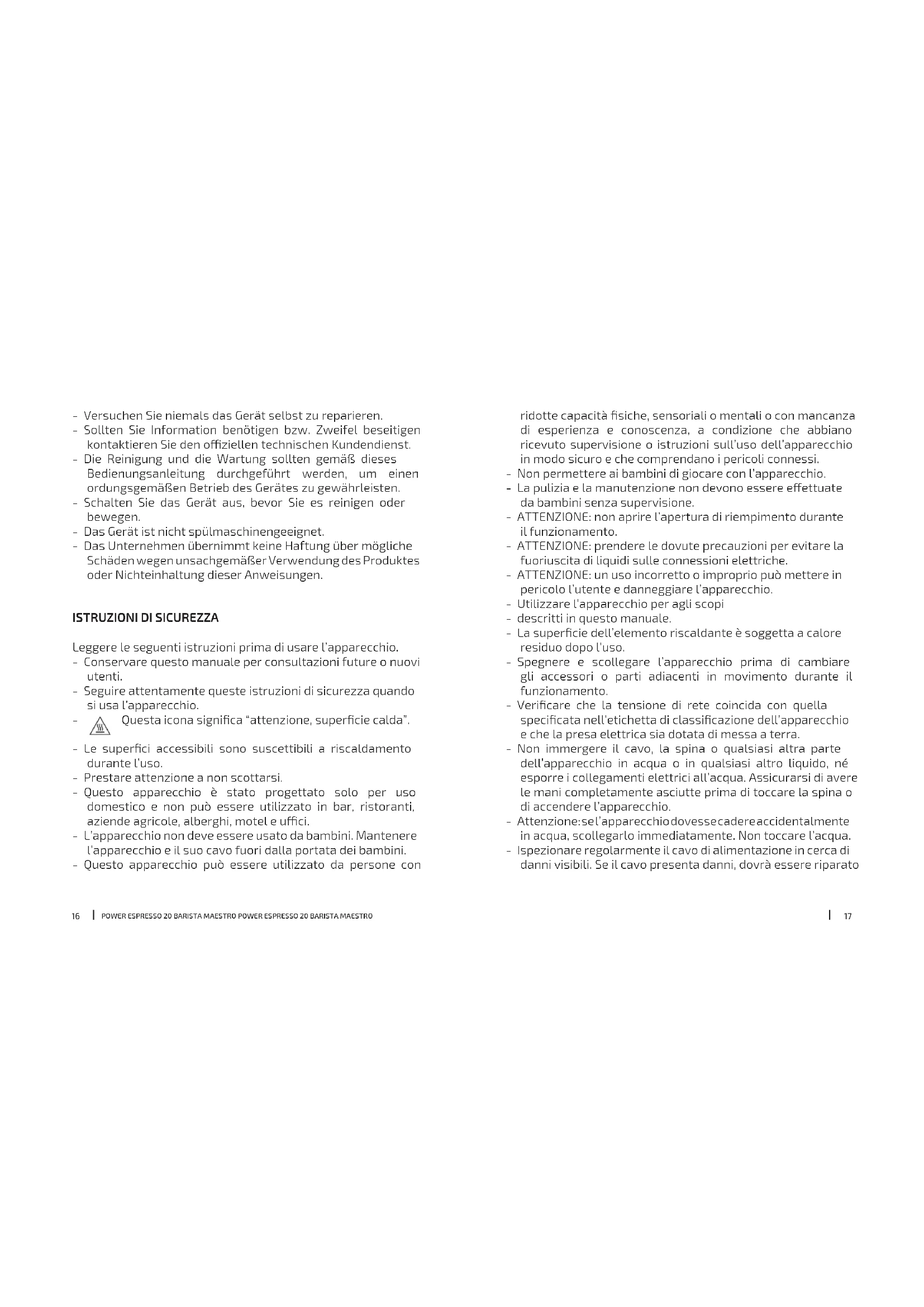 ITALIANOITALIANO c. Aceto bianco e acqua tiepida. d. Polveri decalcicanti come l’acido citrico. Per i metodi di pulizia specici, consultare le istruzioni del fornitore di soluzioni decalcicanti. Procedura di decalcicazione IMPORTANTE: se il ciclo di decalcicazione non viene completato o viene interrotto a metà di una delle fasi, è necessario riavviare il ciclo. - Aggiungere una tavoletta decalcicante, un decalcicante liquido, aceto bianco o polvere decalcicante al serbatoio dell’acqua - Aggiungere acqua fredda ltrata e inserire il serbatoio dell’acqua in posizione. - Posizionare due recipienti. - Posizionare un recipiente da 1 litro sotto la il gruppo erogatore e un altro recipiente sotto il vaporizzatore. - Verica dell’alimentazione: - Inserire la spina nella presa di corrente, accendere l’apparecchio e attendere che passi allo stato READY. - Assicurarsi che la manopola del vapore/acqua calda sia in posizione di spegnimento. IMPORTANTE: è possibile annullare il ciclo di decalcicazione in qualsiasi momento premendo il tasto di alimentazione. PASSAGGIO 1 Avvio della decalcicazione - Portare la manopola del vapore/acqua calda in posizione Acqua calda. - Premere il tasto Espresso o Doppio espresso. - La pompa si avvierà e verrà erogata acqua calda dal gruppo erogatore e dal vaporizzatore. La pompa farà rumore per 2 minuti, il che è normale. - Al termine dell’erogazione di acqua calda dal gruppo erogatore e dal vaporizzatore, l’apparecchio emetterà un segnale acustico per indicare la ne di questa fase di decalcicazione. - Portare la manopola del vapore/acqua calda in posizione di spegnimento. - Ripetere l’operazione precedente erogando acqua calda dal gruppo erogatore e dal vaporizzatore. PASSAGGIO 2 Preparazione dello spurgo IMPORTANTE: spurgare il vaporizzatore e il gruppo erogatore dai residui di decalcicante con acqua fredda ltrata. - A tal ne, rimuovere il serbatoio dell’acqua e sciacquarlo con acqua corrente, assicurandosi decalcicante. - Inserire un ltro a vuoto nel portaltro e inserire quest’ultimo nel gruppo erogatore. - Premere il tasto Espresso o Doppio espresso: le spie dei tasti si illumineranno in bianco sso. - Lasciare scorrere l’acqua no all’arresto automatico. Pulizia del portaltro Rimuovere i residui di caè macinato dal portaltro e dall’uscita del macinino pulendo con un panno umido e asciugando con un panno asciutto. Pulizia del contenitore per chicchi di caè (ogni 2 ~ 3 mesi) In caso di uso frequente o giornaliero del macinino, pulire regolarmente il contenitore per chicchi di caè. ATTENZIONE: per evitare danni alla macchina da caè, non utilizzare detergenti alcalini o abrasivi o pagliette metalliche. NOTA BENE: non immergere la macchina da caè in acqua o in altri liquidi. - Spegnere e scollegare la macchina da caè dalla presa di corrente. - Rimuovere il coperchio del contenitore. - Ruotare l’elemento di chiusura del contenitore in senso antiorario per sbloccarlo. - Rimuovere il contenitore e conservare i chicchi di caè rimanenti in un contenitore ermetico per preservarne la freschezza. IMPORTANTE: si consiglia di non smontare o rimuovere il contenitore se i chicchi di caè sono ancora all’interno; in caso contrario, il contenitore potrebbe bloccarsi. Una volta esauriti i chicchi di caè all’interno contenitore, quest’ultimo potrà essere smontato e rimossa. Decalcicazione - Per garantire un funzionamento eciente della macchina da caè e un caè di qualità, pulire periodicamente i condotti interni con una soluzione decalcicante. - Si consiglia di decalcicare la macchina per espresso ogni 4-6 mesi in base alla frequenza d’uso. - L’avviso di decalcicazione appare dopo 500 cicli di erogazione: la spia di pulizia e decalcicazione lampeggerà per indicare che bisogna decalcicare la macchina da caè. Dopo la decalcicazione, la spia si spegnerà; altrimenti, rimarrà accesa ad ogni accensione. Scegliere uno tra i quattro decalcicanti elencati in seguito: a. Tavoletta decalcicante per macchine espresso. b. Decalcicante liquido.146 POWER ESPRESSO 20 BARISTA MAESTRO POWER ESPRESSO 20 BARISTA MAESTRO