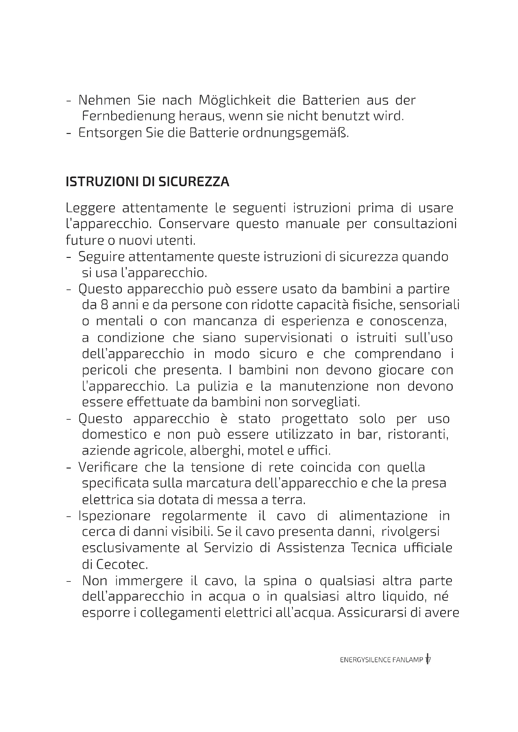 Leggere attentamente le seguenti istruzioni prima di usare l’apparecchio. Conservare questo manuale per consultazioni future o nuovi utenti. - Seguire attentamente queste istruzioni di sicurezza quando si usa l’apparecchio. - Questo apparecchio può essere usato da bambini a partire da 8 anni e da persone con ridotte capacità siche, sensoriali o mentali o con mancanza di esperienza e conoscenza, a condizione che siano supervisionati o istruiti sull’uso dell’apparecchio in modo sicuro e che comprendano i pericoli che presenta. I bambini non devono giocare con l’apparecchio. La pulizia e la manutenzione non devono essere eettuate da bambini non sorvegliati. - Questo apparecchio è stato progettato solo per uso domestico e non può essere utilizzato in bar, ristoranti, aziende agricole, alberghi, motel e uci. - Vericare che la tensione di rete coincida con quella specicata sulla marcatura dell’apparecchio e che la presa elettrica sia dotata di messa a terra. - Ispezionare regolarmente il cavo di alimentazione in cerca di danni visibili. Se il cavo presenta danni, rivolgersi esclusivamente al Servizio di Assistenza Tecnica uciale di Cecotec. - Non immergere il cavo, la spina o qualsiasi altra parte dell’apparecchio in acqua o in qualsiasi altro liquido, né esporre i collegamenti elettrici all’acqua. Assicurarsi di avereENERGYSILENCE FANLAMP18 le mani completamente asciutte prima di toccare la spina o di accendere l’apparecchio. - Se l’apparecchio dovesse cadere accidentalmente nell’acqua, scollegarlo immediatamente. Non toccare l’acqua! - Non utilizzare l’apparecchio in caso di malfunzionamento o segnali insoliti. - Mantenere i capelli, indumenti, dita e altre parti del corpo lontani dalle aperture e parti in movimento dell’apparecchio. - Assicurarsi che l’apparecchio sia collocato su una supercie piana e stabile durante il funzionamento. - Non utilizzare l’apparecchio vicino a nestre per evitare il rischio di esposizione alla pioggia e conseguenti danni. - Non utilizzare l’apparecchio sotto o aanco a tende. - Non coprire le griglie e non collocare il cavo dell’apparecchio sotto tappeti o altri oggetti durante il funzionamento. Mantenere i lati, il fronte e il retro dell’apparecchio a una distanza minima di 20 cm da pareti o altri oggetti. - Spegnere e scollegare l’apparecchio dalla presa di corrente quando non in uso, prima di montarlo o smontarlo e prima di spostarlo. Togliere la spina per scollegare l’apparecchio, non tirare il cavo. - Non lasciare l’apparecchio senza supervisione mentre è in uso. - Si sconsiglia l’utilizzo del prodotto con prolunghe. - Le mansioni di pulizia e mantenimento del prodotto devono compiersi secondo quanto spiegato in questo manuale per assicurarne un buon funzionamento. - Sorvegliare i bambini per assicurarsi che non giochino con l’apparecchio. È necessaria una rigida supervisione nel caso in cui l’apparecchio venga utilizzato da bambini o vicino a loro. Istruzioni relative all’uso delle pile: - Non smontare, aprire né danneggiare le pile.ENERGYSILENCE FANLAMP 19 - Mantenere le pile fuori dalla portata dei bambini - Tenere le pile di piccole dimensioni fuori dalla portata dei bambini. In caso di ingestione di una pila, rivolgersi immediatamente a un medico. - Non esporre le pile al calore o al fuoco. Non conservare le pile alla luce diretta del sole. - Non cortocircuitare le pile. Non conservare le pile in modo disordinato, in una scatola o in un cassetto dove possano essere cortocircuitate da altri oggetti metallici. - Non sottoporre le pile a urti meccanici. - Le pile possono presentare fughe in condizioni estreme. Se le pile perdono liquido, non toccarle. Se il liquido viene a contatto con la pelle, trattare immediatamente l’area lavandola con acqua e sapone. Se il liquido viene a contatto con gli occhi, lavarli immediatamente con abbondante acqua pulita per almeno 10 minuti e cercare assistenza medica. Utilizzare guanti per maneggiare le pile e smaltirle immediatamente secondo la normativa locale. - Osservare i simboli di positivo (+) e negativo (-) sulla pila e sul telecomando e assicurarsi che sia inserita correttamente. - Si sconsiglia l’uso di pile incompatibili con questo apparecchio. - Non usare l’apparecchio con pile di fabbricazione, capacità, dimensioni o tipo diversi. - L’uso delle pile da parte di bambini è consentito solo sotto stretta supervisione. - In caso di ingestione di una pila, consultare immediatamente un medico. - Acquistare sempre le pile consigliate dal produttore dell’apparecchio. - Mantenere le pile pulite e asciutte. - Pulire i terminali delle pile con un panno pulito e asciuttoENERGYSILENCE FANLAMP20 se sporche. - Conservare il manuale d’istruzioni originale del prodotto per riferimenti futuri. - Utilizzare le pile solo allo scopo per cui sono state fabbricate. - Se possibile, rimuovere le pile del telecomando quando non lo si usa. - Smaltire le pile adeguatamente.