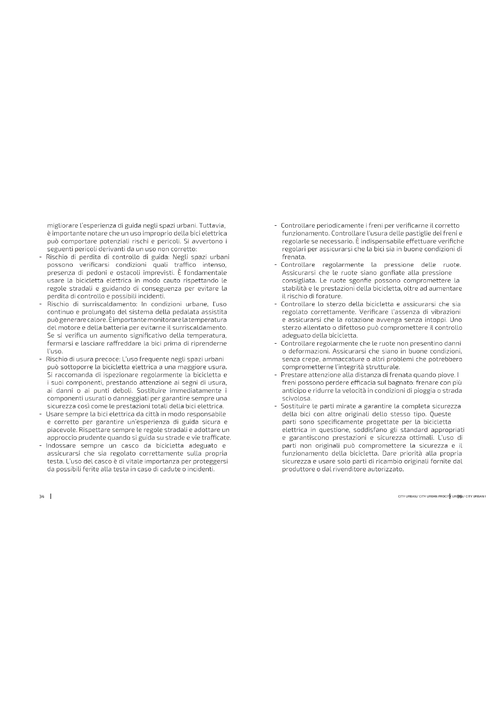 Leggere attentamente le seguenti istruzioni prima di usare l’apparecchio. Conservare questo manuale per consultazioni future o nuovi utenti. - Tenere presente che quando si utilizza una bicicletta elettrica a pedalata assistita (EPAC) su strade pubbliche, possono essere applicati requisiti legali specici in base alle normative nazionali. Questi requisiti possono includere, tra l’altro, l’obbligo di disporre di un sistema di illuminazione adeguato e di catarifrangenti per aumentare la visibilità e la sicurezza del ciclista. - Prima di usare la bicicletta elettrica in luoghi pubblici, si consiglia vivamente di consultare e rispettare le norme e gli standard in vigore nel proprio paese. Assicurarsi che la propria bicicletta elettrica sia dotata dei dispositivi di illuminazione e dei catarifrangenti necessari e che siano in buone condizioni di funzionamento. - Il rispetto dei requisiti di legge non solo garantisce la propria sicurezza, ma contribuisce anche alla sicurezza stradale in generale. Tenere presente che è propria responsabilità conoscere e rispettare le norme e standard applicabili mirati a garantire un uso sicuro e legale della bicicletta elettrica su strade pubbliche. - Rimuovere sempre la batteria durante la manutenzione. - Non modicare o manomettere il sistema di gestione elettrica della bicicletta. - Attenzione: Dopo un uso prolungato, prestare attenzione a non toccare le superci calde, come i freni a disco. - La bici elettrica da città è stata progettata specicamente per l’uso in spazi urbani e su superci piane. È progettata per orire una pedalata assistita su questi tipi di terreni e verbrennen oder hohen Temperaturen ausgesetzt werden darf, da sie explodieren kann. - Sowohl der Akku als auch die Batterien können unter extremen Bedingungen auslaufen. Wenn die Akkus/ Batterie ausläuft, berühren Sie die Flüssigkeit nicht. Falls die Flüssigkeiten in Kontakt mit der Haut kommt, waschen Sie sich sofort mit Wasser und Seife. Falls die Flüssigkeit in Kontakt mit den Augen kommt, waschen Sie sich die Augen während mindestens 10 Minuten und suchen Sie sich ärztliche Hilfe auf. Benutzen Sie Handschuhe, um die Batterie/ Akku zu hantieren und entsorgen Sie sie gemäß den örtlichen Vorschriften. - Die Batterie muss vor der Entsorgung aus dem Gerät entfernt werden. - Das Gerät muss von der Stromversorgung getrennt werden, wenn der Akku entfernt wird. - Die Batterie muss zur sicheren Entsorgung entfernt werden. - Nicht wiederauadbare Batterien dürfen nicht wieder aufgeladen werden. - Wiederauadbare Batterien müssen vor dem Auaden aus dem Gerät entfernt werden. - Verschiedene Batterietypen oder neue und gebrauchte Batterien dürfen nicht gemischt werden. - Die Batterien müssen mit der richtigen Polarität eingesetzt werden. - Wenn das Gerät über einen längeren Zeitraum unbenutzt gelagert wird, sollte die Batterie entfernt werden. - Die Versorgungsklemmen dürfen nicht kurzgeschlossen werden.3534 CITY URBAN/ CITY URBAN PROCITY URBAN/ CITY URBAN PRO - Controllare periodicamente i freni per vericarne il corretto funzionamento. Controllare l’usura delle pastiglie dei freni e regolarle se necessario. È indispensabile eettuare veriche regolari per assicurarsi che la bici sia in buone condizioni di frenata. - Controllare regolarmente la pressione delle ruote. Assicurarsi che le ruote siano gonate alla pressione consigliata. Le ruote sgone possono compromettere la stabilità e le prestazioni della bicicletta, oltre ad aumentare il rischio di forature. - Controllare lo sterzo della bicicletta e assicurarsi che sia regolato correttamente. Vericare l’assenza di vibrazioni e assicurarsi che la rotazione avvenga senza intoppi. Uno sterzo allentato o difettoso può compromettere il controllo adeguato della bicicletta. - Controllare regolarmente che le ruote non presentino danni o deformazioni. Assicurarsi che siano in buone condizioni, senza crepe, ammaccature o altri problemi che potrebbero comprometterne l’integrità strutturale. - Prestare attenzione alla distanza di frenata quando piove. I freni possono perdere ecacia sul bagnato: frenare con più anticipo e ridurre la velocità in condizioni di pioggia o strada scivolosa. - Sostituire le parti mirate a garantire la completa sicurezza della bici con altre originali dello stesso tipo. Queste parti sono specicamente progettate per la bicicletta elettrica in questione, soddisfano gli standard appropriati e garantiscono prestazioni e sicurezza ottimali. L’uso di parti non originali può compromettere la sicurezza e il funzionamento della bicicletta. Dare priorità alla propria sicurezza e usare solo parti di ricambio originali fornite dal produttore o dal rivenditore autorizzato. migliorare l’esperienza di guida negli spazi urbani. Tuttavia, è importante notare che un uso improprio della bici elettrica può comportare potenziali rischi e pericoli. Si avvertono i seguenti pericoli derivanti da un uso non corretto: - Rischio di perdita di controllo di guida: Negli spazi urbani possono vericarsi condizioni quali traco intenso, presenza di pedoni e ostacoli imprevisti. È fondamentale usare la bicicletta elettrica in modo cauto rispettando le regole stradali e guidando di conseguenza per evitare la perdita di controllo e possibili incidenti. - Rischio di surriscaldamento: In condizioni urbane, l’uso continuo e prolungato del sistema della pedalata assistita può generare calore. È importante monitorare la temperatura del motore e della batteria per evitarne il surriscaldamento. Se si verica un aumento signicativo della temperatura, fermarsi e lasciare rareddare la bici prima di riprenderne l’uso. - Rischio di usura precoce: L’uso frequente negli spazi urbani può sottoporre la bicicletta elettrica a una maggiore usura. Si raccomanda di ispezionare regolarmente la bicicletta e i suoi componenti, prestando attenzione ai segni di usura, ai danni o ai punti deboli. Sostituire immediatamente i componenti usurati