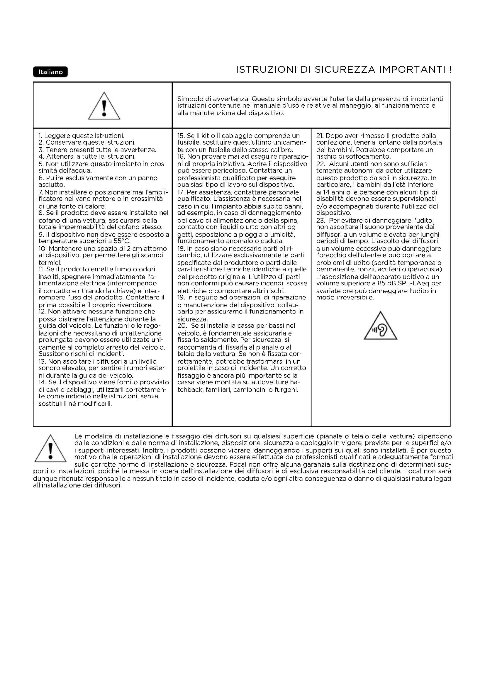 BMW v2 Istruzioni per l'uso Periodo di rodaggio Gli altoparlanti sono elementi meccanici complessi che richiedono un periodo di adattamento per poter funzionare al meglio delle loro possibilità. Questo periodo di rodaggio varia a seconda delle condizioni specifiche e può durare anche qualche settimana. Per velocizzare questa operazione, si consiglia di tenere in funzione gli altoparlanti per una ventina di ore, a un livello sonoro medio. Quando le caratteristiche degli altoparlanti si sono completamente stabilizzate, i prodotti offriranno le loro prestazioni ottimali. Condizioni di garanzia Tutti gli altoparlanti Focal sono coperti da garanzia emessa dal distributore ufficiale Focal del tuo paese. Il tuo distributore potrà fornirti tutti i dettagli relativi alle condizioni di garanzia. La copertura della garanzia comprende quanto concesso dalla garanzia legale in forza nel paese in cui è stata emessa la fattura d’acquisto originale.IMPORTANTES INSTRUCCIONES DE SEGURIDAD ! Español Símbolo de advertencia. Este símbolo se ha diseñado para advertir al usuario de la presencia de instrucciones importantes mencionadas en el manual de usuario y rela- cionadas con el manejo, funcionamiento y mantenimiento del dispositivo.