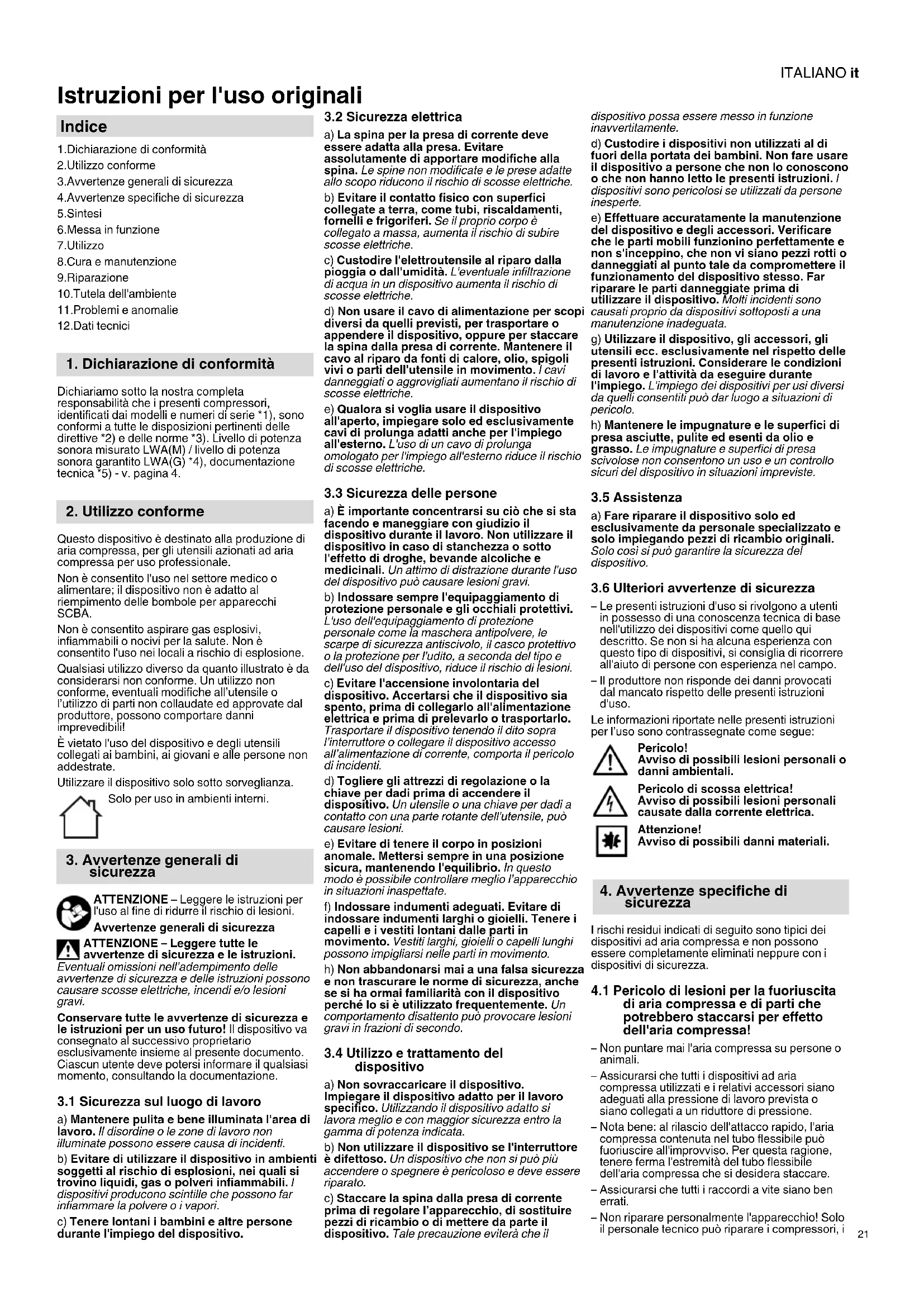 Istruzioni per l'uso originali 1.Dichiarazione di conformità 2.Utilizzo conforme 3.Avvertenze generali di sicurezza 4.Avvertenze specifiche di sicurezza 5.Sintesi 6.Messa in funzione 7.Utilizzo 8.Cura e manutenzione 9.Riparazione 10.Tutela dell'ambiente 11.Problemi e anomalie 12.Dati tecnici Dichiariamo sotto la nostra completa responsabilità che i presenti compressori, identificati dai modelli e numeri di serie *1), sono conformi a tutte le disposizioni pertinenti delle direttive *2) e delle norme *3). Livello di potenza sonora misurato LWA(M) / livello di potenza sonora garantito LWA(G) *4), documentazione tecnica *5) - v. pagina 4. Questo dispositivo è destinato alla produzione di aria compressa, per gli utensili azionati ad aria compressa per uso professionale. Non è consentito l'uso nel settore medico o alimentare; il dispositivo non è adatto al riempimento delle bombole per apparecchi SCBA. Non è consentito aspirare gas esplosivi, infiammabili o nocivi per la salute. Non è consentito l'uso nei locali a rischio di esplosione. Qualsiasi utilizzo diverso da quanto illustrato è da considerarsi non conforme. Un utilizzo non conforme, eventuali modifiche all’utensile o l’utilizzo di parti non collaudate ed approvate dal produttore, possono comportare danni imprevedibili! È vietato l'uso del dispositivo e degli utensili collegati ai bambini, ai giovani e alle persone non addestrate. Utilizzare il dispositivo solo sotto sorveglianza. Solo per uso in ambienti interni. ATTENZIONE – Leggere le istruzioni per l'uso al fine di ridurre il rischio di lesioni. Avvertenze generali di sicurezza ATTENZIONE – Leggere tutte le avvertenze di sicurezza e le istruzioni. Eventuali omissioni nell’adempimento delle avvertenze di sicurezza e delle istruzioni possono causare scosse elettriche, incendi e/o lesioni gravi. Conservare tutte le avvertenze di sicurezza e le istruzioni per un uso futuro! Il dispositivo va consegnato al successivo proprietario esclusivamente insieme al presente documento. Ciascun utente deve potersi informare il qualsiasi momento, consultando la documentazione.