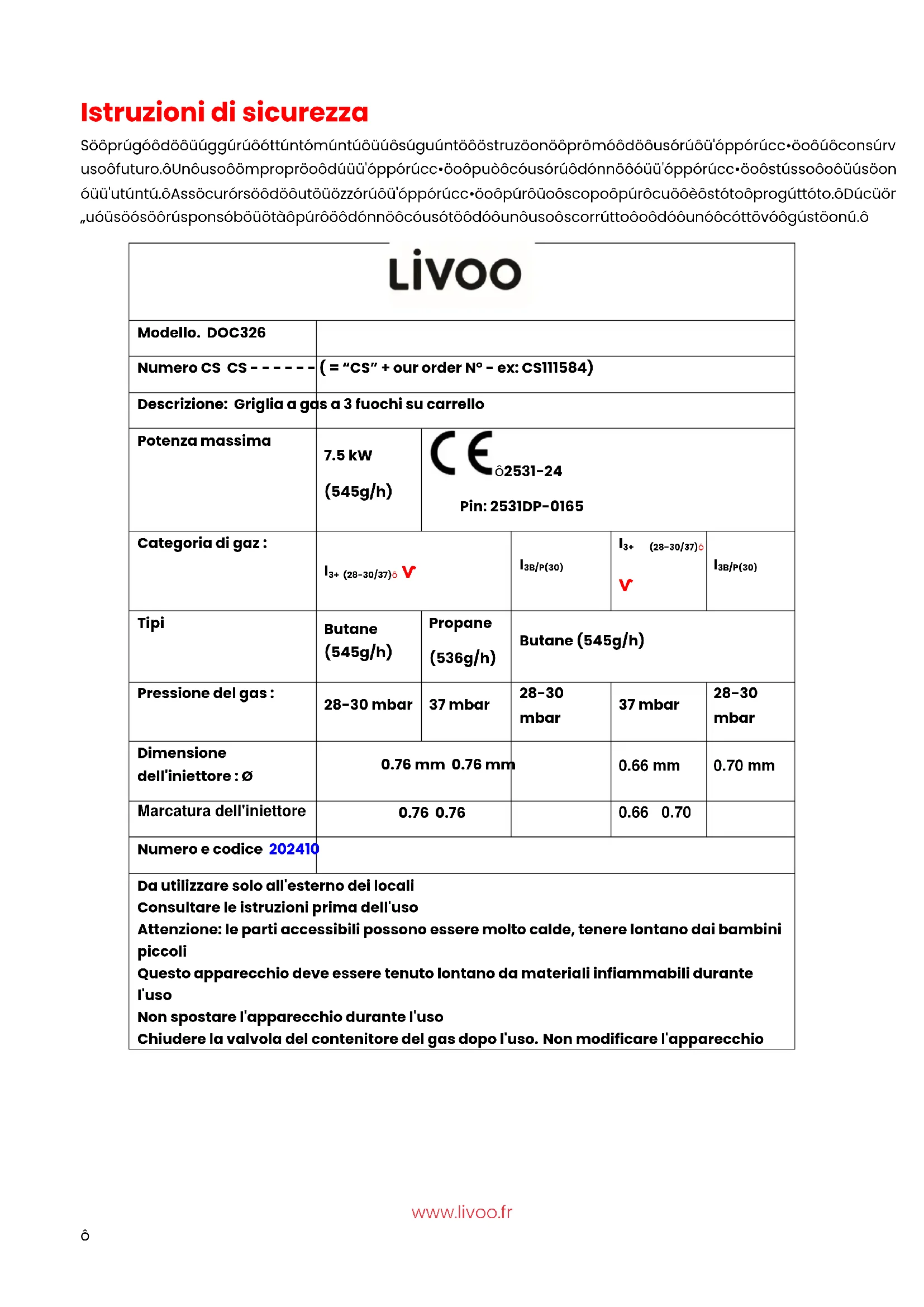 @Livoo ITwww.livoo.fr Istruzioni di sicurezza Si prega di leggere attentamente le seguenti istruzioni prima di usare l'apparecchio e conservarle per un uso futuro. Un uso improprio dell'apparecchio può causare danni all'apparecchio stesso o lesioni all'utente. Assicurarsi di utilizzare l'apparecchio per lo scopo per cui è stato progettato. Decliniamo qualsiasi responsabilità per i danni causati da un uso scorretto o da una cattiva gestione. Modello. DOC326 Numero CS CS - - - - - - ( = “CS” + our order N° - ex: CS111584) Descrizione: Griglia a gas a 3 fuochi su carrello Potenza massima