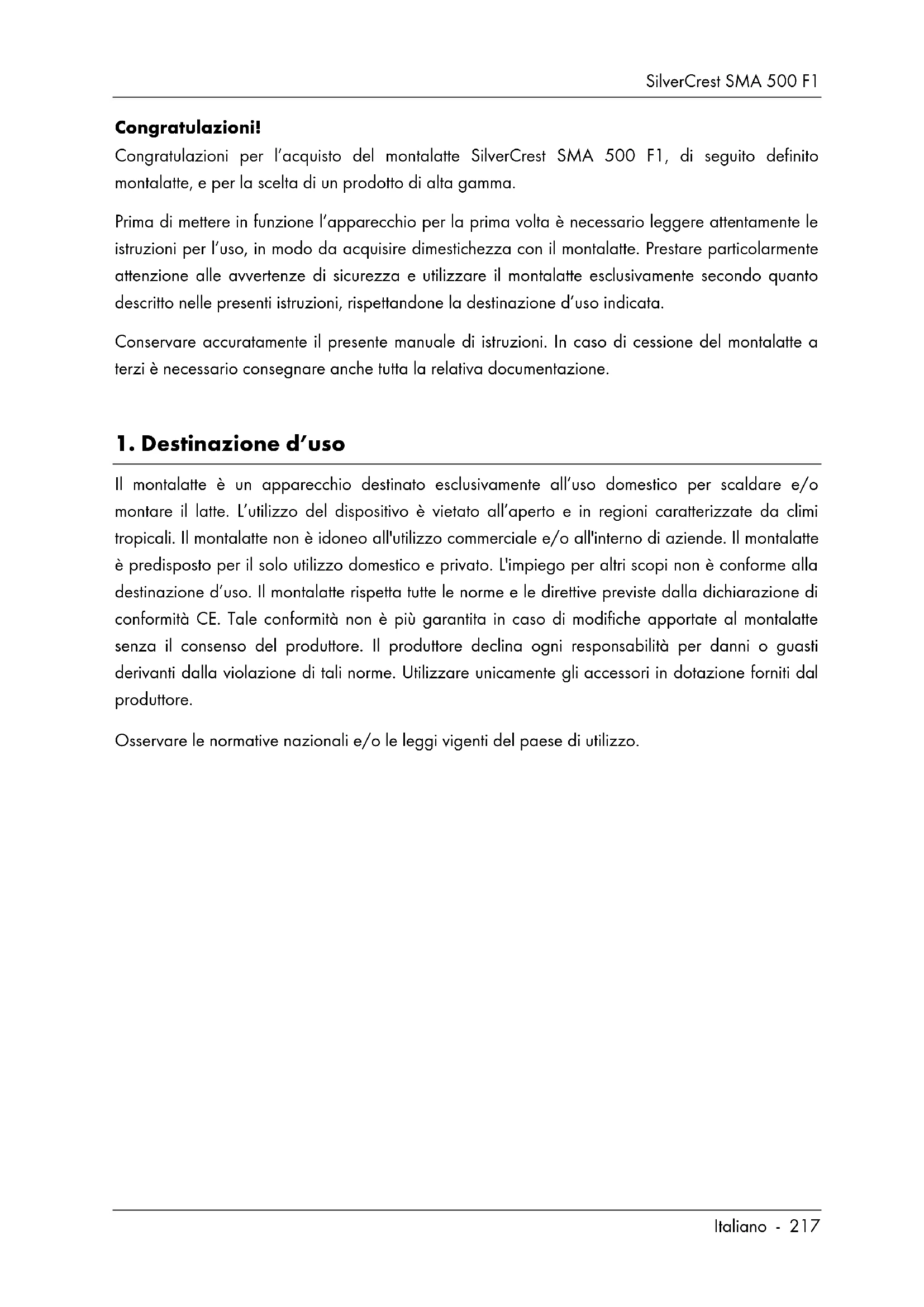 13. Avvertenze sulla garanzia ........................................................................ 238SilverCrest SMA 500 F1 Italiano - 217 Congratulazioni! Congratulazioni per l’acquisto del montalatte SilverCrest SMA 500 F1, di seguito definito montalatte, e per la scelta di un prodotto di alta gamma. Prima di mettere in funzione l’apparecchio per la prima volta è necessario leggere attentamente le istruzioni per l’uso, in modo da acquisire dimestichezza con il montalatte. Prestare particolarmente attenzione alle avvertenze di sicurezza e utilizzare il montalatte esclusivamente secondo quanto descritto nelle presenti istruzioni, rispettandone la destinazione d’uso indicata. Conservare accuratamente il presente manuale di istruzioni. In caso di cessione del montalatte a terzi è necessario consegnare anche tutta la relativa documentazione.