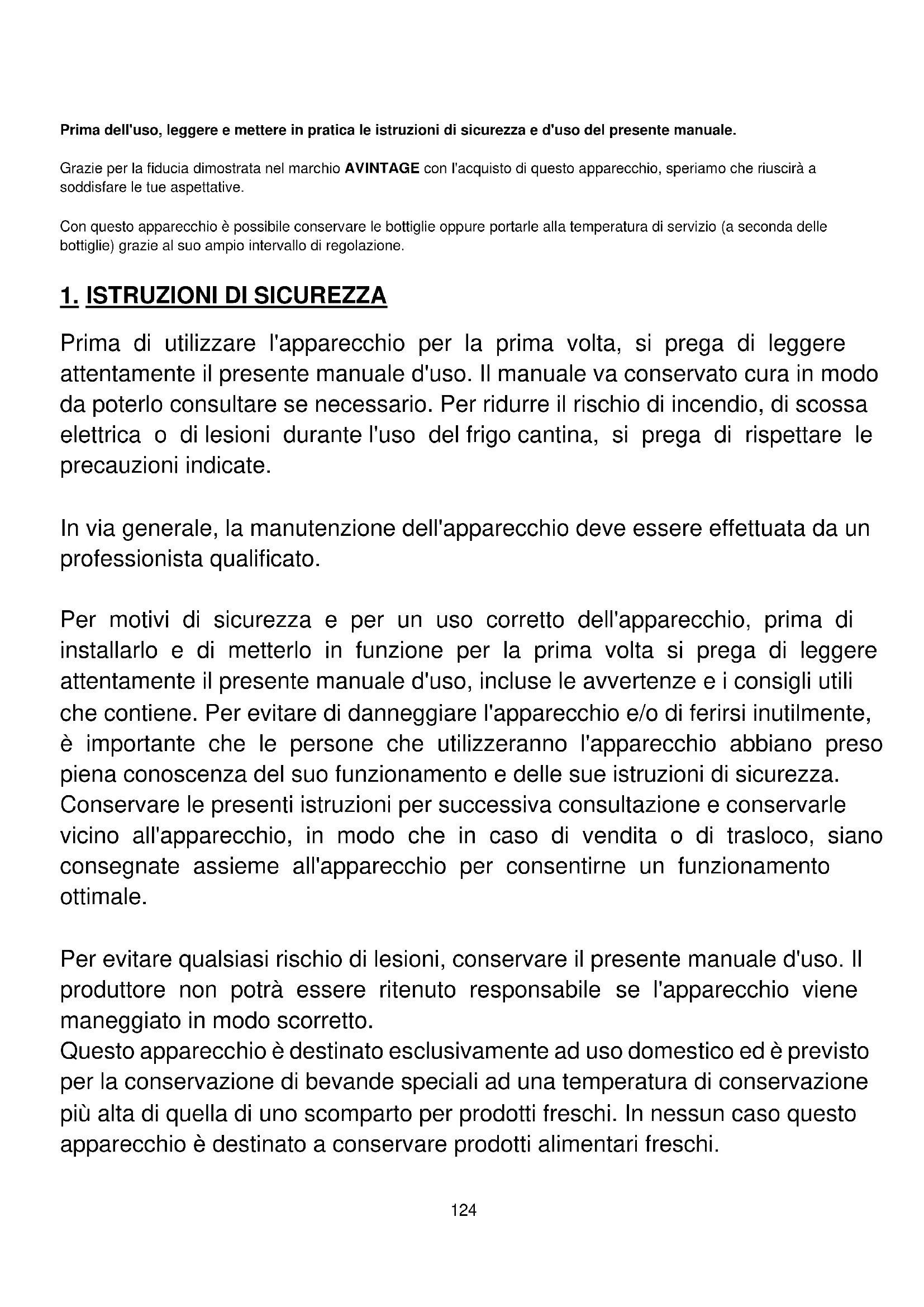 Prima di utilizzare l'apparecchio per la prima volta, si prega di leggere attentamente il presente manuale d'uso. Il manuale va conservato cura in modo da poterlo consultare se necessario. Per ridurre il rischio di incendio, di scossa elettrica o di lesioni durante l'uso del frigo cantina, si prega di rispettare le precauzioni indicate. In via generale, la manutenzione dell'apparecchio deve essere effettuata da un professionista qualificato. Per motivi di sicurezza e per un uso corretto dell'apparecchio, prima di installarlo e di metterlo in funzione per la prima volta si prega di leggere attentamente il presente manuale d'uso, incluse le avvertenze e i consigli utili che contiene. Per evitare di danneggiare l'apparecchio e/o di ferirsi inutilmente, è importante che le persone che utilizzeranno l'apparecchio abbiano preso piena conoscenza del suo funzionamento e delle sue istruzioni di sicurezza. Conservare le presenti istruzioni per successiva consultazione e conservarle vicino all'apparecchio, in modo che in caso di vendita o di trasloco, siano consegnate assieme all'apparecchio per consentirne un funzionamento ottimale. Per evitare qualsiasi rischio di lesioni, conservare il presente manuale d'uso. Il produttore non potrà essere ritenuto responsabile se l'apparecchio viene maneggiato in modo scorretto. Questo apparecchio è destinato esclusivamente ad uso domestico ed è previsto per la conservazione di bevande speciali ad una temperatura di conservazione più alta di quella di uno scomparto per prodotti freschi. In nessun caso questo apparecchio è destinato a conservare prodotti alimentari freschi.125 Verificare che la tensione dell'impianto elettrico della casa corrisponda a quella indicata sulla targa informativa: l'apparecchio deve essere collegato ad una presa di terra regolamentare. Riparazioni o collegamenti scorretti possono rappresentare un rischio per la sicurezza. Se si ha il minimo dubbio, far controllare il proprio impianto elettrico da un professionista. Per la tua protezione, questo apparecchio deve essere collegato correttamente ad una presa di terra. Non tagliare né togliere il filo di terra dal cavo di alimentazione fornito. Per motivi di sicurezza, non usare prolunghe. Se l'apparecchio si fosse rovinato (ad esempio per un forte urto) o danneggiato (sovratensione dovuta a fulmine, allagamento, incendio), può essere pericoloso utilizzarlo. Scollegare l'apparecchio dalla presa elettrica e farlo controllare da un riparatore professionista autorizzato. Per evitare pericoli, non sostituire da soli il cavo di alimentazione se rovinato. Contattare il proprio rivenditore, un centro assistenza autorizzato o un riparatore professionista. Questo apparecchio deve essere posizionato in modo che la presa a muro sia raggiungibile. Non spostare l'apparecchio una volta che è stato caricato con i vini perché la scocca potrebbe deformarsi, oltre a dover fare delle riparazioni. I componenti elettrici non devono essere a vista.