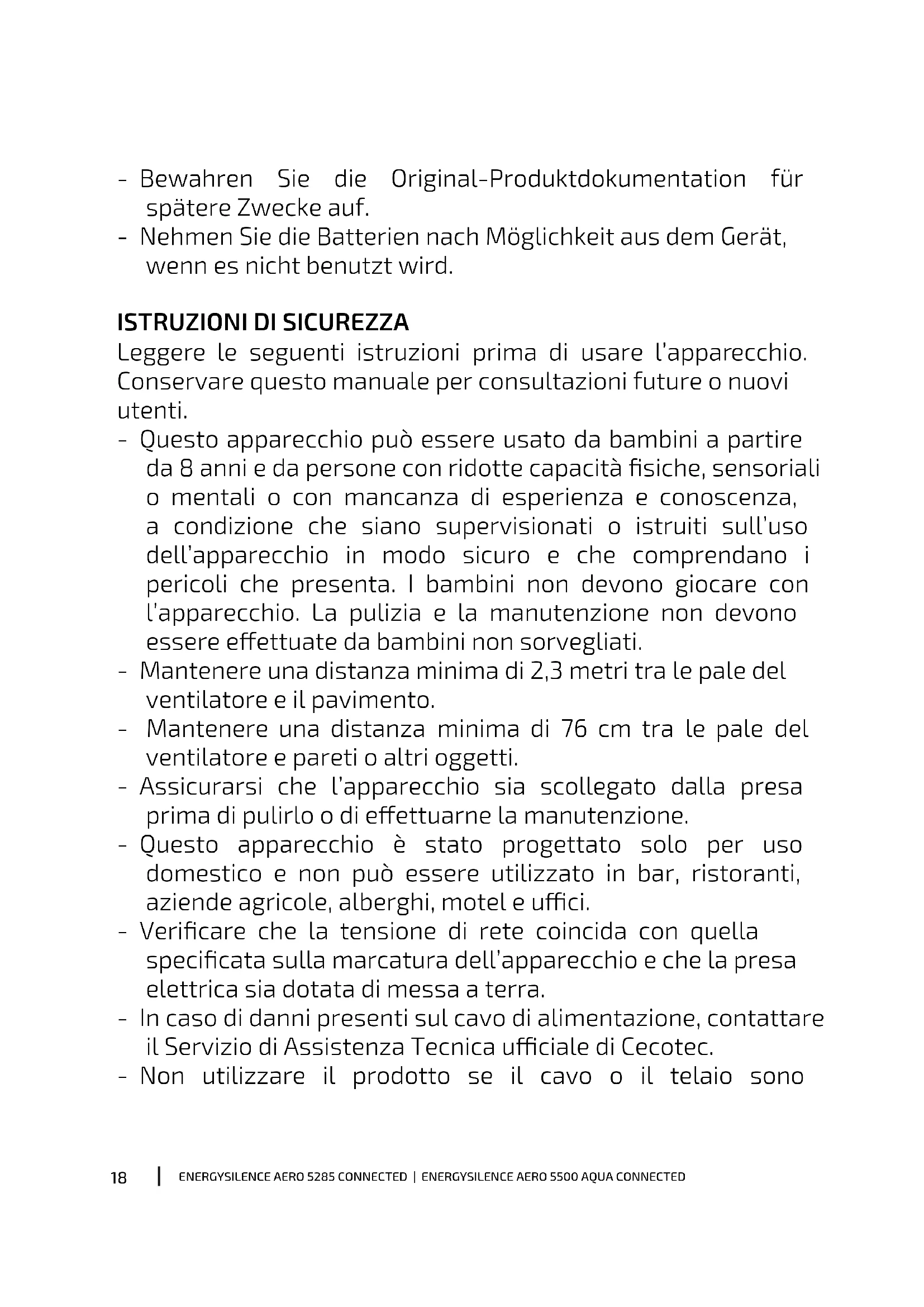 Leggere le seguenti istruzioni prima di usare l’apparecchio. Conservare questo manuale per consultazioni future o nuovi utenti. - Questo apparecchio può essere usato da bambini a partire da 8 anni e da persone con ridotte capacità siche, sensoriali o mentali o con mancanza di esperienza e conoscenza, a condizione che siano supervisionati o istruiti sull’uso dell’apparecchio in modo sicuro e che comprendano i pericoli che presenta. I bambini non devono giocare con l’apparecchio. La pulizia e la manutenzione non devono essere eettuate da bambini non sorvegliati. - Mantenere una distanza minima di 2,3 metri tra le pale del ventilatore e il pavimento. - Mantenere una distanza minima di 76 cm tra le pale del ventilatore e pareti o altri oggetti. - Assicurarsi che l’apparecchio sia scollegato dalla presa prima di pulirlo o di eettuarne la manutenzione. - Questo apparecchio è stato progettato solo per uso domestico e non può essere utilizzato in bar, ristoranti, aziende agricole, alberghi, motel e uci. - Vericare che la tensione di rete coincida con quella specicata sulla marcatura dell’apparecchio e che la presa elettrica sia dotata di messa a terra. - In caso di danni presenti sul cavo di alimentazione, contattare il Servizio di Assistenza Tecnica uciale di Cecotec. - Non utilizzare il prodotto se il cavo o il telaio sonoENERGYSILENCE AERO 5285 CONNECTED | ENERGYSILENCE AERO 5500 AQUA CONNECTED