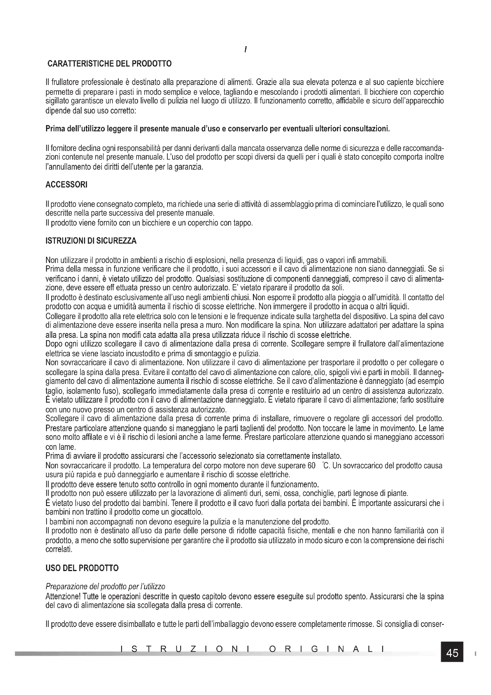 ISTRUZIONI ORIGINALI vare l’imballaggio, può essere utile per il successivo trasporto e stoccaggio del prodotto. Controllare che il prodotto non sia danneggiato. In caso di danni utilizzare il prodotto solo dopo aver riparato il danno o aver sostituito i componenti danneggiati con componenti nuovi e non danneggiati. Lavare il prodotto seguendo le istruzioni riportate nella sezione “Manutenzione del prodotto”. Il corpo del motore deve essere posizionato su una superfi cie piana, orizzontale, rigida e stabile. Tutti i supporti del corpo del motore devono essere a contatto con la superfi cie. Montare il bicchiere posizionandolo sul corpo del motore del frullatore (II). Tutte le linguette sulla superfi cie superiore del corpo devono entrare nelle guide nella base del bicchiere. Il bicchiere deve essere a fi lo con il suo alloggiamento. Questo è l’unico modo per garantire che il motore della lama montata alla base del bicchiere sia correttamente collegato. Il bicchiere è dotato di un coperchio con guarnizione, il coperchio deve essere montato premendolo nell’apertura del bicchiere (III). L’uso del coperchio del bicchiere aumenta la sicurezza del prodotto e previene anche la fuoriuscita del cibo durante la sua preparazione nel frullatore. Il coperchio è dotato di un tappo supplementare che consente di aggiungere prodotti alimentari al bicchiere senza rimuovere il coperchio. La spina deve essere installata nel coperchio in modo che le linguette del tappo entrino nelle scanalature dell’apertura del coperchio (IV). Uso del prodotto Si raccomanda di riempire il bicchiere di cibo quando è rimosso dal corpo del motore. In questo modo si evitano possibili conta- minazioni alimentari del corpo del motore durante il riempimento del bicchiere. Non riempire il bicchiere al di sopra del simbolo di capacità massima. Occorre tener conto del fatto che il livello del liquido nel bicchiere aumenterà durante la miscelazione. Dopo il riempimento, il bicchiere deve essere chiuso dal coperchio con tappo. Posizionare il bicchiere sul corpo del motore. Assicurarsi che l’interruttore sia in posizione O - spento, quindi collegare il cavo di alimentazione alla presa di corrente. Avviare il prodotto cambiando la posizione dell’interruttore su: 1, 2 o P. Le posizioni dell’interruttore 1 e 2 attivano il frullatore e consentono di lavorare ad una delle due velocità: 1 - più lento, 2 - più velo- ce. La posizione P consente di attivare la velocità massima di funzionamento, fi nché la manopola dell’interruttore viene mantenuta in questa posizione. Quando la manopola viene rilasciata, ritorna automaticamente alla posizione O - spento. L’arresto del funzionamento avviene dopo aver cambiato la posizione dell’interruttore in posizione O - spento. Prima di rimuovere il bicchiere, attendere che le lame si fermino completamente, quindi scollegare il cavo di alimentazione dalla presa di corrente e solo in questo momento rimuovere il bicchiere dal corpo del motore. All’inizio si consiglia di utilizzare una velocità inferiore e di aumentarla gradualmente durante l’operazione fi no ad ottenere risultati soddisfacenti. Il prodotto è progettato per funzionare ininterrottamente per non più di 2 minuti. Lasciare raff reddare completamente il prodotto. ATTENZIONE! Se, dopo l’accensione, l’apparecchio comincia a vibrare, emette un rumore anomalo o mostra altri segni di mal- funzionamento, spegnerlo immediatamente, scollegarlo dall’alimentazione di rete e verifi care la causa del malfunzionamento. Manutenzione del prodotto ATTENZIONE! Prima della pulizia, spegnere il prodotto, scollegare il cavo di alimentazione dalla presa a muro, attendere che si raff reddi, quindi procedere con la manutenzione. ATTENZIONE! Si raccomanda di pulire l’interno del bicchiere subito dopo la fi ne della lavorazione. In questo modo si evita che i residui di cibo si secchino e si facilita la pulizia del prodotto. Se durante l’uso il corpo del motore si sporcherà con il cibo lavorato, bisogna interrompere la lavorazione, scollegare il prodotto dall’alimentazione elettrica staccando il cavo di alimentazione dalla presa di corrente, pulire il prodotto e solo dopo riprendere l’operazione. Per la pulizia del prodotto utilizzare solo detergenti delicati destinati alla pulizia delle stoviglie. È vietato l’uso di detergenti abrasivi, ad esempio in polvere, o contenenti sostanze corrosive. Per la pulizia non utilizzare solventi a base di benzina o alcool. Diluire il detergente con acqua seguendo le istruzioni sulla su a etichetta, quindi applicarlo su un panno morbido e pulire esterna- mente il corpo del motore. Rimuovere eventuale residuo del detergente con un panno morbido leggermente imbevuto di acqua pulita. Quindi asciugare tutta la superfi cie con un panno morbido e asciutto. ATTENZIONE! Il corpo del motore non è progettato per la pulizia a getto d’acqua. Non immergere il corpo del motore in acqua. Prima di utilizzare il bicchiere per la prima volta è suffi ciente risciacquarlo riempendolo di acqua con una piccola quantità di de- tergente quindi svuotare e ripetere l’operazione, questa volta riempiendo il bicchiere con acqua pulita, fi no a quando i residui di detergente vengono sciacquati via. L’interno del bicchiere e le lame devono essere puliti dopo ogni lavorazione riempiendo il bicchiere di acqua e detersivo. Quindi coprire il coperchio con il tappo installato e far funzionare il prodotto per un breve periodo di tempo. Quindi svuotare il bicchiere e ripetere l’operazione questa volta con acqua pulita. Ripetere l’operazione fi nché non si elimina qualsiasi residuo di detergente. Quindi svuotare il bicchiere d’acqua e lasciarlo asciugare. La base del bicchiere non deve venire a contatto con acqua o altri liquidi.47