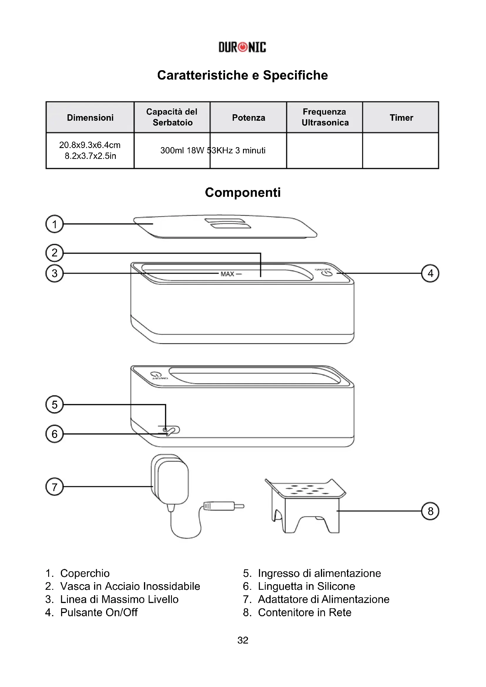 - Conservare in un luogo asciutto. AVVERTENZA: NON immergere oggetti elettrici come orologi nel pulitore a ultrasuoni a meno che non siano dichiarati impermeabili dal produttore. Pulire a proprio rischio. NON tentare di pulire magneti o oggetti con magneti in quanto possono danneggiare l’apparecchio. Non inserire mai batterie o prodotti chimici all’interno dell’apparecchio. NON pulire oggetti delicati o facilmente danneggiabili nel pulitore a ultrasuoni, inclusi perle e giada. Vericare sempre se l’oggetto che si desidera pulire è adatto.37 Risoluzione dei problemi Problema Probabile Causa Soluzione La macchina non si accende. Il cavo di alimentazione è collegato correttamente alla presa? Inserire correttamente la spina nella presa. Il cavo di alimentazione è danneggiato? Smettere di utilizzare la macchina. Contattare Duronic. Gli oggetti non sono stati puliti correttamente dopo il lavaggio. Acqua insufciente nella vasca in acciaio. Aggiungere abbastanza acqua per immergere completamente gli oggetti da pulire o riempire no alla linea di livello dell'acqua "MAX". L'oggetto potrebbe necessitare di un po' di soluzione detergente. Aggiungere una piccola quantità di soluzione detergente. Lo sporco sulla supercie dell'oggetto è molto appiccicoso. Può essere pulito più volte (l'intervallo migliore tra due pulizie è di 5 minuti). L'oggetto ha molto olio sulla supercie. L'effetto sgrassante dell'acqua del rubinetto non è abbastanza forte per pulire, assicurarsi di aggiungere un po' di soluzione detergente per assistere la pulizia. Le superci ossidate e annerite dei gioielli in oro e argento non sono state pulite. Aggiungere una piccola quantità di soluzione detergente professionale per gioielli in oro e argento per rimuovere lo strato ossidato superciale. Se non si è sicuri, chiedere assistenza professionale. La supercie dell'oggetto è danneggiata dopo la pulizia. La potenza di pulizia standard della macchina è troppo forte. Gli oggetti con trattamenti di elettroplaccatura e spruzzatura sulla supercie dovrebbero avere un tempo di pulizia più breve. Posizionare oggetti delicati in un contenitore o borsa protettiva prima della pulizia. Pulire oggetti delicati a proprio rischio. Se non si è sicuri, portare gli oggetti a pulire professionalmente. Non tentare di pulire nel pulitore a ultrasuoni poiché ciò potrebbe danneggiare l’oggetto. Per qualsiasi altro problema o domanda, contattare Duronic.38 Instrukcja obsługi. Polski39 Cechy i Specykacje Wymiary Pojemność zbiornika Moc Częstotliwość ultradźwięków Timer 20.8x9.3x6.4cm 8.2x3.7x2.5in 300ml 18W 53KHz 3 min Komponenty