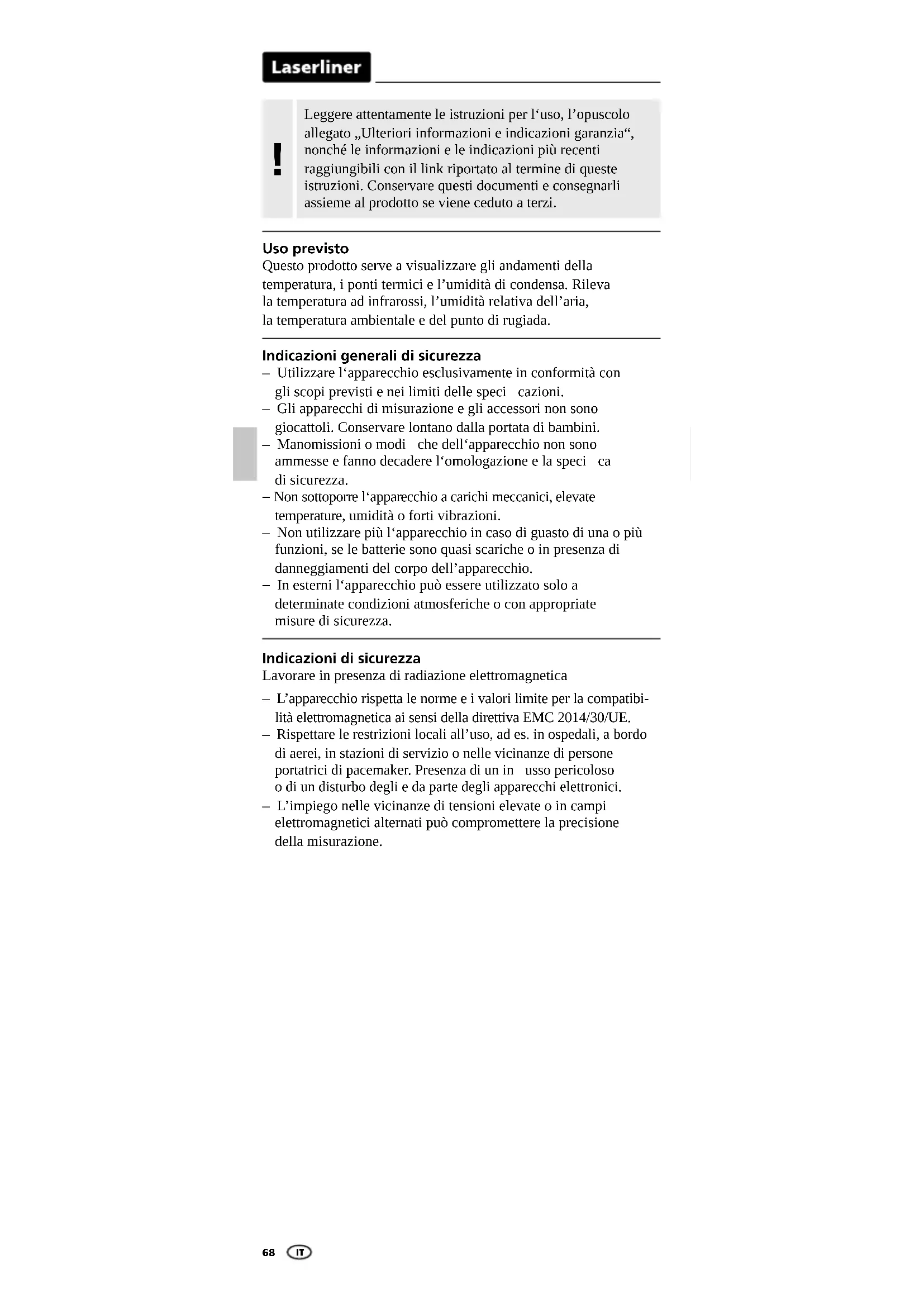 - IT78 Disposizioni valide in UE e Regno unito e smaltimento L‘apparecchio soddisfa tutte le norme necessarie per la libera circolazione di merci all‘interno dell‘UE e del Regno unito. Questo prodotto, accessori e imballaggio inclusi, è un apparecchio elettrico che deve essere riciclato nel rispetto dell’ambiente secondo le direttive europee e del Regno Unito in materia di rifiuti di apparecchiature elettriche ed elettroniche, batterie e imballaggi così da recuperare preziose materie prime. Gli apparecchi elettrici, le batterie e i materiali di imballaggio non devono essere gettati nei rifiuti domestici. Gli utilizzatori sono tenuti per legge a consegnare gratuitamente batterie e accumulatori usati presso un centro di raccolta autorizzato, nei punti vendita o all’assistenza tecnica. L’accumulatore può essere rimosso dall’apparecchio senza distruzione utilizzando gli utensili disponibili in commercio. Provvedere alla raccolta separata prima di restituire l’apparecchio per lo smaltimento. Per domande sulla rimozione della batteria potete rivolgervi al reparto assistenza di UMAREX-LASERLINER. Informatevi presso il vostro comune sui centri di raccolta autorizzati allo smaltimento e osservare le relative avvertenze per lo smaltimento e la sicurezza nei centri di recupero. Per ulteriori informazioni e indicazioni di sicurezza: https://packd.li/ll/apb/in Dati tecnici (Con riserva di modifiche tecniche. Rev25W01) Grado di emissione regolabile da 0,01 a 1,00 Campo di misura temperatura ambiente / del punto di rugiada -20°C p. 60