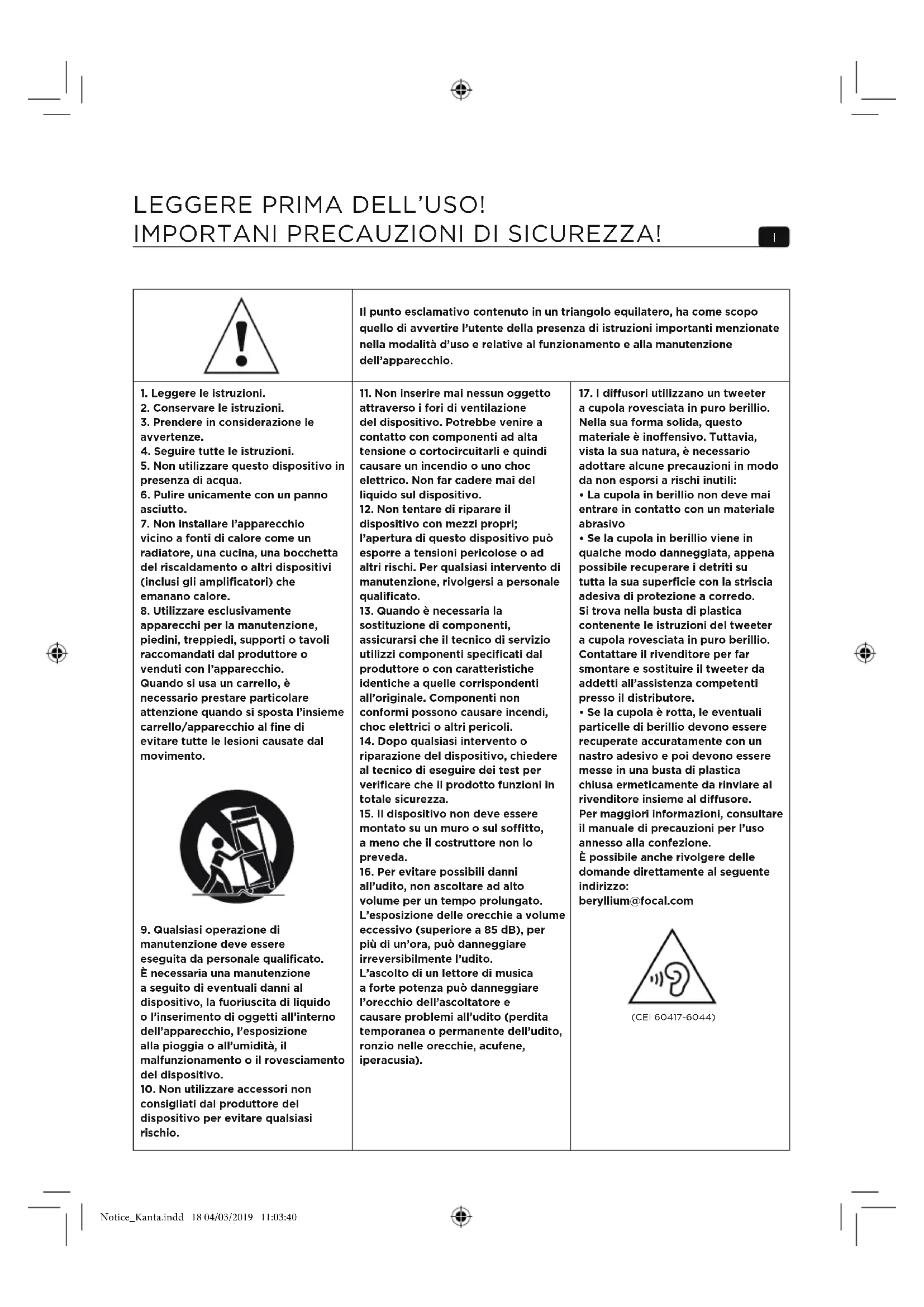 - Se la cupola è rotta, le eventuali particelle di berillio devono essere recuperate accuratamente con un nastro adesivo e poi devono essere messe in una busta di plastica chiusa ermeticamente da rinviare al rivenditore insieme al diusore. Per maggiori informazioni, consultare il manuale di precauzioni per l’uso annesso alla confezione. È possibile anche rivolgere delle domande direttamente al seguente indirizzo: beryllium@focal.com (CEI 60417-6044) Notice_Kanta.indd 18 04/03/2019 11:03:4019 KANTA