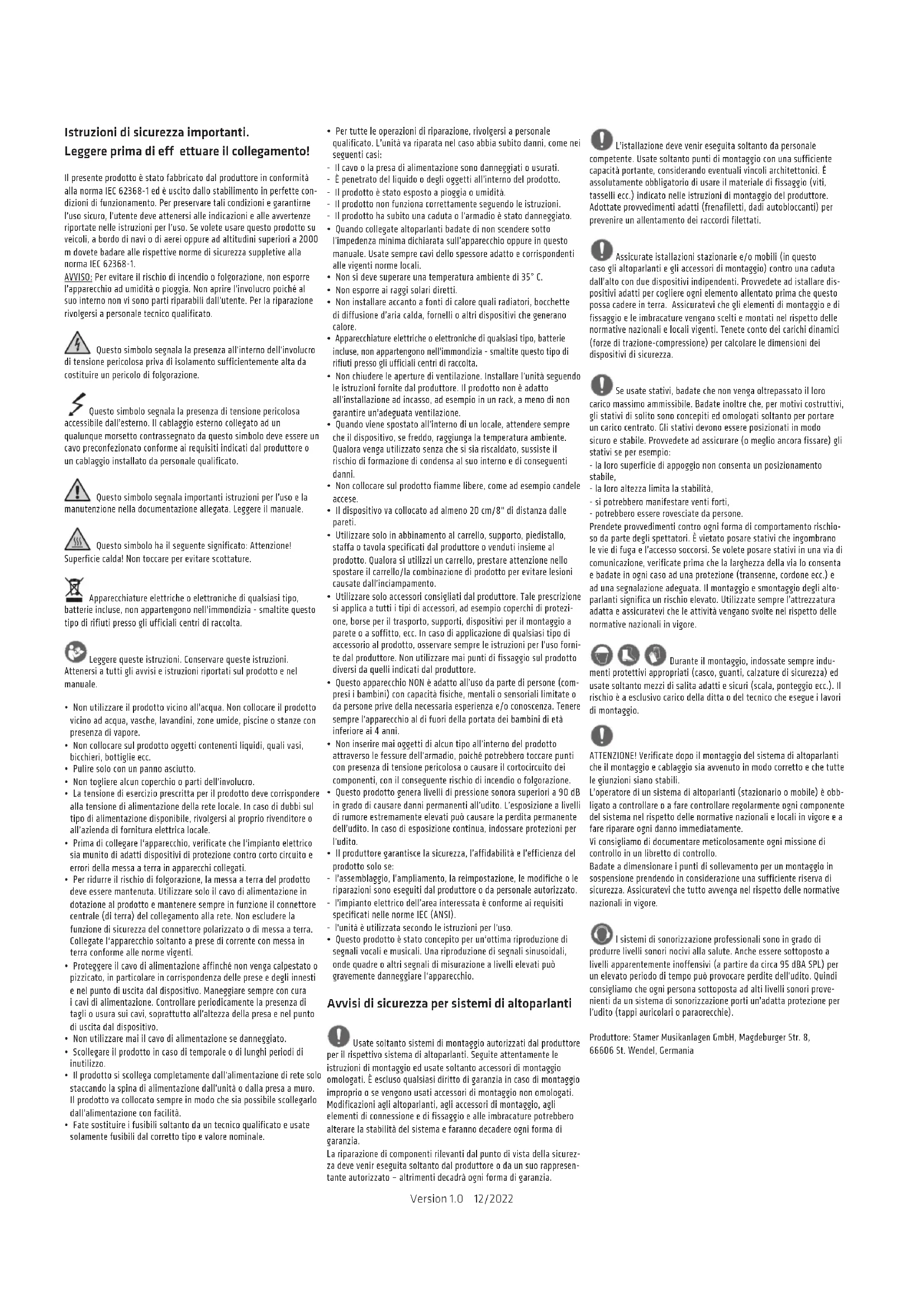 - Questo prodotto è stato concepito per un‘ottima riproduzione di segnali vocali e musicali. Una riproduzione di segnali sinusoidali, onde quadre o altri segnali di misurazione a livelli elevati può gravemente danneggiare l‘apparecchio. Avvisi di sicurezza per sistemi di altoparlanti Usate soltanto sistemi di montaggio autorizzati dal produttore per il rispettivo sistema di altoparlanti. Seguite attentamente le istruzioni di montaggio ed usate soltanto accessori di montaggio omologati. È escluso qualsiasi diritto di garanzia in caso di montaggio improprio o se vengono usati accessori di montaggio non omologati. Modificazioni agli altoparlanti, agli accessori di montaggio, agli elementi di connessione e di fissaggio e alle imbracature potrebbero alterare la stabilità del sistema e faranno decadere ogni forma di garanzia. La riparazione di componenti rilevanti dal punto di vista della sicurez- za deve venir eseguita soltanto dal produttore o da un suo rappresen- tante autorizzato – altrimenti decadrà ogni forma di garanzia. L’istallazione deve venir eseguita soltanto da personale competente. Usate soltanto punti di montaggio con una sufficiente capacità portante, considerando eventuali vincoli architettonici. È assolutamente obbligatorio di usare il materiale di fissaggio (viti, tasselli ecc.) indicato nelle istruzioni di montaggio del produttore. Adottate provvedimenti adatti (frenafiletti, dadi autobloccanti) per prevenire un allentamento dei raccordi filettati. Assicurate istallazioni stazionarie e/o mobili (in questo caso gli altoparlanti e gli accessori di montaggio) contro una caduta dall’alto con due dispositivi indipendenti. Provvedete ad istallare dis- positivi adatti per cogliere ogni elemento allentato prima che questo possa cadere in terra. Assicuratevi che gli elementi di montaggio e di fissaggio e le imbracature vengano scelti e montati nel rispetto delle normative nazionali e locali vigenti. Tenete conto dei carichi dinamici (forze di trazione-compressione) per calcolare le dimensioni dei dispositivi di sicurezza. Se usate stativi, badate che non venga oltrepassato il loro carico massimo ammissibile. Badate inoltre che, per motivi costruttivi, gli stativi di solito sono concepiti ed omologati soltanto per portare un carico centrato. Gli stativi devono essere posizionati in modo sicuro e stabile. Provvedete ad assicurare (o meglio ancora fissare) gli stativi se per esempio: - la loro superficie di appoggio non consenta un posizionamento stabile, - la loro altezza limita la stabilità, - si potrebbero manifestare venti forti, - potrebbero essere rovesciate da persone. Prendete provvedimenti contro ogni forma di comportamento rischio- so da parte degli spettatori. È vietato posare stativi che ingombrano le vie di fuga e l’accesso soccorsi. Se volete posare stativi in una via di comunicazione, verificate prima che la larghezza della via lo consenta e badate in ogni caso ad una protezione (transenne, cordone ecc.) e ad una segnalazione adeguata. Il montaggio e smontaggio degli alto- parlanti significa un rischio elevato. Utilizzate sempre l’attrezzatura adatta e assicuratevi che le attività vengano svolte nel rispetto delle normative nazionali in vigore. Durante il montaggio, indossate sempre indu- menti protettivi appropriati (casco, guanti, calzature di sicurezza) ed usate soltanto mezzi di salita adatti e sicuri (scala, ponteggio ecc.). Il rischio è a esclusivo carico della ditta o del tecnico che esegue i lavori di montaggio. ATTENZIONE! Verificate dopo il montaggio del sistema di altoparlanti che il montaggio e cablaggio sia avvenuto in modo corretto e che tutte le giunzioni siano stabili. L’operatore di un sistema di altoparlanti (stazionario o mobile) è obb- ligato a controllare o a fare controllare regolarmente ogni componente del sistema nel rispetto delle normative nazionali e locali in vigore e a fare riparare ogni danno immediatamente. Vi consigliamo di documentare meticolosamente ogni missione di controllo in un libretto di controllo. Badate a dimensionare i punti di sollevamento per un montaggio in sospensione prendendo in considerazione una sufficiente riserva di sicurezza. Assicuratevi che tutto avvenga nel rispetto delle normative nazionali in vigore. I sistemi di sonorizzazione professionali sono in grado di produrre livelli sonori nocivi alla salute. Anche essere sottoposto a livelli apparentemente inoffensivi (a partire da circa 95 dBA SPL) per un elevato periodo di tempo può provocare perdite dell’udito. Quindi consigliamo che ogni persona sottoposta ad alti livelli sonori prove- nienti da un sistema di sonorizzazione porti un’adatta protezione per l’udito (tappi auricolari o paraorecchie). Produttore: Stamer Musikanlagen GmbH, Magdeburger Str. 8, 66606 St. Wendel, GermaniaLINEAR 5 MK II 1.0