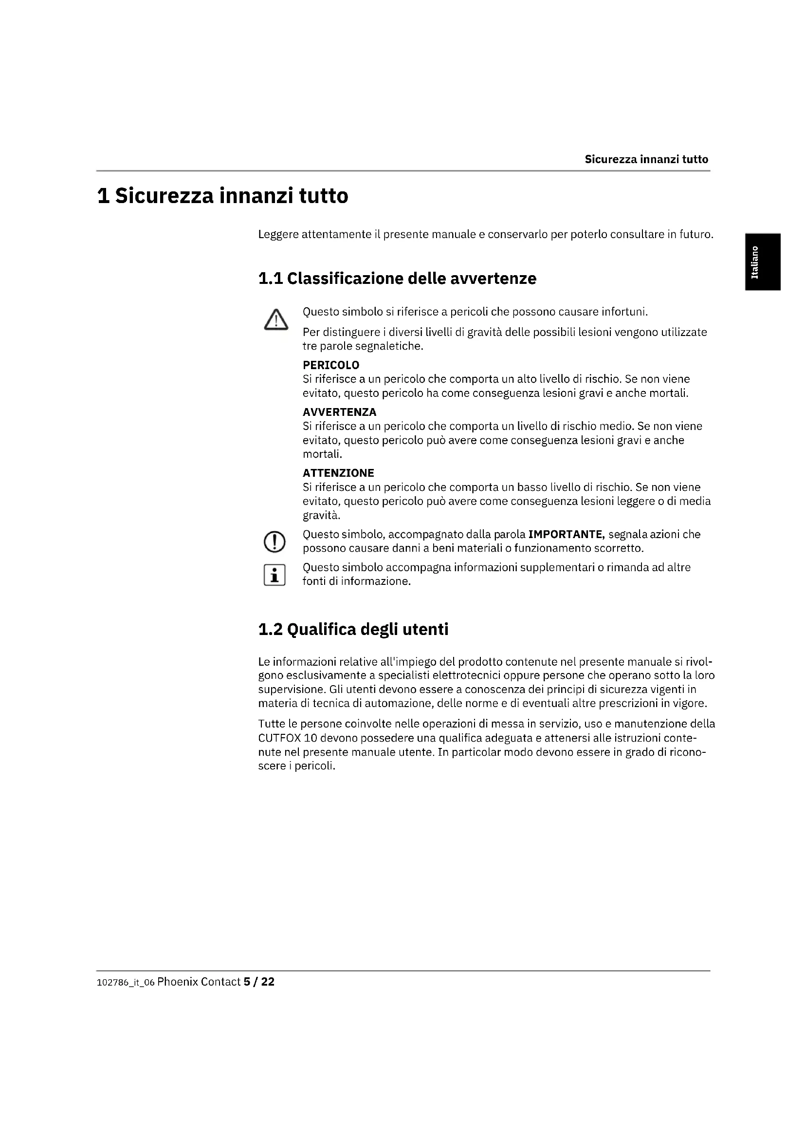 Le informazioni relative all'impiego del prodotto contenute nel presente manuale si rivol- gono esclusivamente a specialisti elettrotecnici oppure persone che operano sotto la loro supervisione. Gli utenti devono essere a conoscenza dei principi di sicurezza vigenti in materia di tecnica di automazione, delle norme e di eventuali altre prescrizioni in vigore. Tutte le persone coinvolte nelle operazioni di messa in servizio, uso e manutenzione della CUTFOX 10 devono possedere una qualifica adeguata e attenersi alle istruzioni conte- nute nel presente manuale utente. In particolar modo devono essere in grado di ricono- scere i pericoli. Questo simbolo si riferisce a pericoli che possono causare infortuni. Per distinguere i diversi livelli di gravità delle possibili lesioni vengono utilizzate tre parole segnaletiche. PERICOLO Si riferisce a un pericolo che comporta un alto livello di rischio. Se non viene evitato, questo pericolo ha come conseguenza lesioni gravi e anche mortali. AVVERTENZA Si riferisce a un pericolo che comporta un livello di rischio medio. Se non viene evitato, questo pericolo può avere come conseguenza lesioni gravi e anche mortali. ATTENZIONE Si riferisce a un pericolo che comporta un basso livello di rischio. Se non viene evitato, questo pericolo può avere come conseguenza lesioni leggere o di media gravità. Questo simbolo, accompagnato dalla parola IMPORTANTE, segnala azioni che possono causare danni a beni materiali o funzionamento scorretto. Questo simbolo accompagna informazioni supplementari o rimanda ad altre fonti di informazione.CUTFOX 10 6 / 22 Phoenix Contact 102786_it_06
