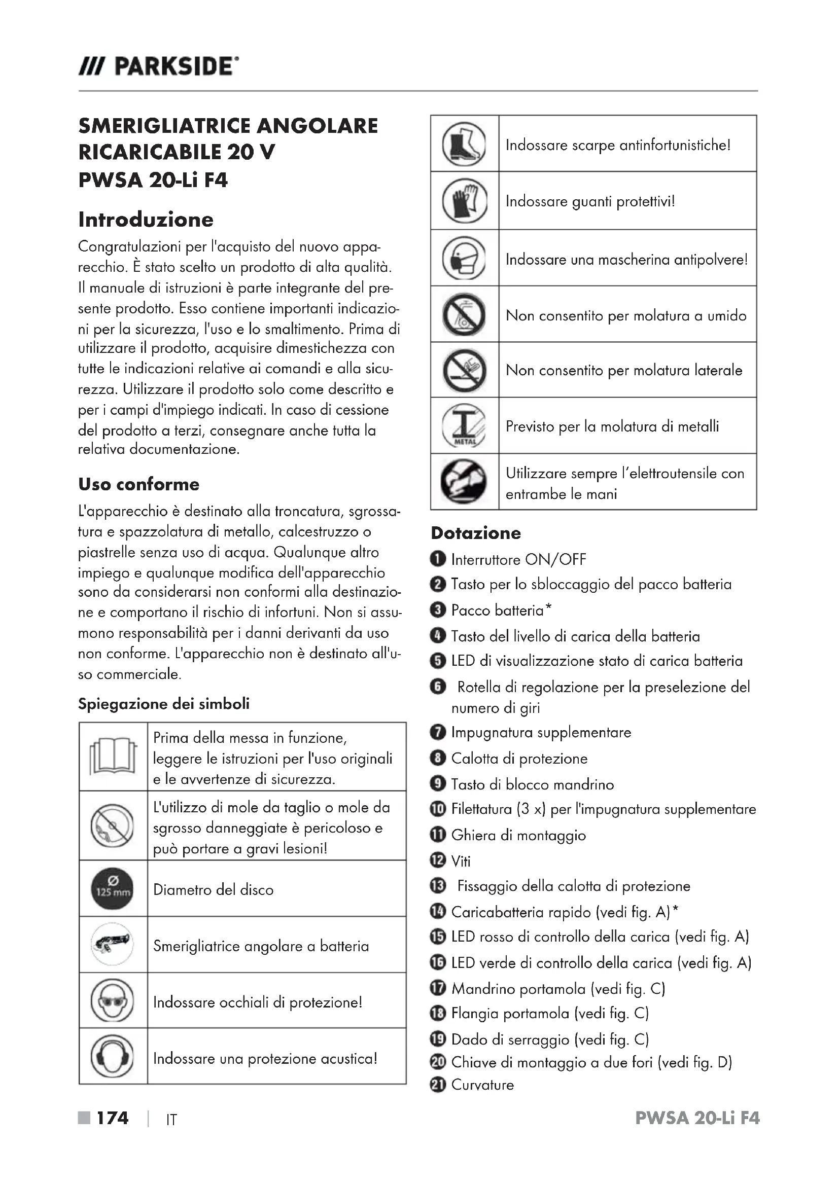 SMERIGLIATRICE ANGOLARE RICARICABILE 20 V PWSA 20-Li F4 Introduzione Congratulazioni per l'acquisto del nuovo appa- recchio. È stato scelto un prodotto di alta qualità. Il manuale di istruzioni è parte integrante del pre- sente prodotto. Esso contiene importanti indicazio- ni per la sicurezza, l'uso e lo smaltimento. Prima di utilizzare il prodotto, acquisire dimestichezza con tutte le indicazioni relative ai comandi e alla sicu- rezza. Utilizzare il prodotto solo come descritto e per i campi d'impiego indicati. In caso di cessione del prodotto a terzi, consegnare anche tutta la relativa documentazione. Uso conforme L'apparecchio è destinato alla troncatura, sgrossa- tura e spazzolatura di metallo, calcestruzzo o piastrelle senza uso di acqua. Qualunque altro impiego e qualunque modifica dell'apparecchio sono da considerarsi non conformi alla destinazio- ne e comportano il rischio di infortuni. Non si assu- mono responsabilità per i danni derivanti da uso non conforme. L'apparecchio non è destinato all'u- so commerciale. Spiegazione dei simboli Prima della messa in funzione, leggere le istruzioni per l'uso originali e le avvertenze di sicurezza. L'utilizzo di mole da taglio o mole da sgrosso danneggiate è pericoloso e può portare a gravi lesioni! Diametro del disco Smerigliatrice angolare a batteria Indossare occhiali di protezione! Indossare una protezione acustica! Indossare scarpe antinfortunistiche! Indossare guanti protettivi! Indossare una mascherina antipolvere! Non consentito per molatura a umido Non consentito per molatura laterale Previsto per la molatura di metalli Utilizzare sempre l‘elettroutensile con entrambe le mani Dotazione Interruttore ON/OFF Tasto per lo sbloccaggio del pacco batteria Pacco batteria* Tasto del livello di carica della batteria LED di visualizzazione stato di carica batteria Rotella di regolazione per la preselezione del numero di giri Impugnatura supplementare Calotta di protezione Tasto di blocco mandrino Filettatura (3 x) per l'impugnatura supplementare Ghiera di montaggio Viti Fissaggio della calotta di protezione Caricabatteria rapido (vedi fig. A)* LED rosso di controllo della carica (vedi fig. A) LED verde di controllo della carica (vedi fig. A) Mandrino portamola (vedi fig. C) Flangia portamola (vedi fig. C) Dado di serraggio (vedi fig. C) Chiave di montaggio a due fori (vedi fig. D) CurvaturePWSA 20-Li F4 IT