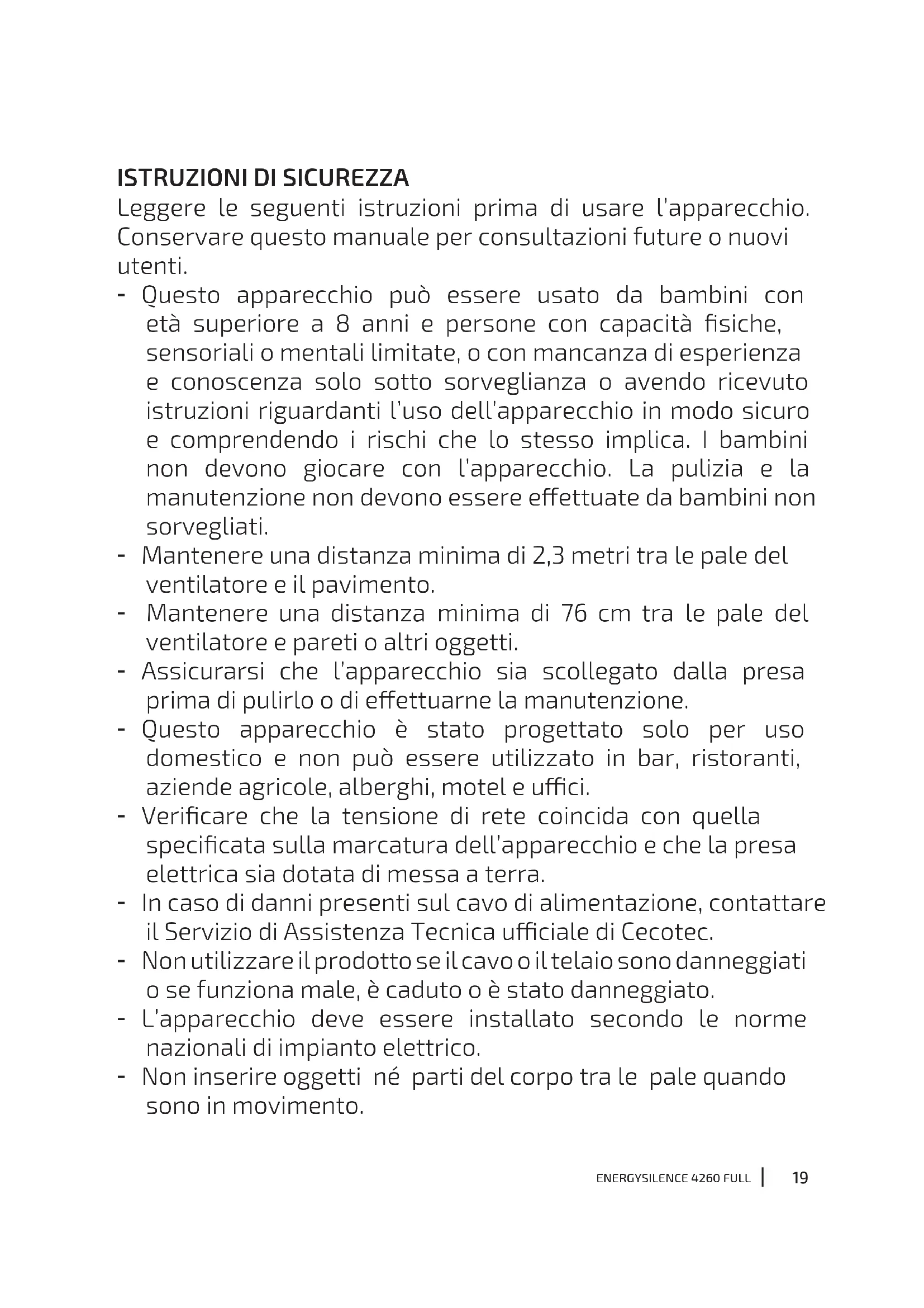 Leggere le seguenti istruzioni prima di usare l’apparecchio. Conservare questo manuale per consultazioni future o nuovi utenti. - Questo apparecchio può essere usato da bambini con età superiore a 8 anni e persone con capacità siche, sensoriali o mentali limitate, o con mancanza di esperienza e conoscenza solo sotto sorveglianza o avendo ricevuto istruzioni riguardanti l’uso dell’apparecchio in modo sicuro e comprendendo i rischi che lo stesso implica. I bambini non devono giocare con l’apparecchio. La pulizia e la manutenzione non devono essere eettuate da bambini non sorvegliati. - Mantenere una distanza minima di 2,3 metri tra le pale del ventilatore e il pavimento. - Mantenere una distanza minima di 76 cm tra le pale del ventilatore e pareti o altri oggetti. - Assicurarsi che l’apparecchio sia scollegato dalla presa prima di pulirlo o di eettuarne la manutenzione. - Questo apparecchio è stato progettato solo per uso domestico e non può essere utilizzato in bar, ristoranti, aziende agricole, alberghi, motel e uci. - Vericare che la tensione di rete coincida con quella specicata sulla marcatura dell’apparecchio e che la presa elettrica sia dotata di messa a terra. - In caso di danni presenti sul cavo di alimentazione, contattare il Servizio di Assistenza Tecnica uciale di Cecotec. - Non utilizzare il prodotto se il cavo o il telaio sono danneggiati o se funziona male, è caduto o è stato danneggiato. - L’apparecchio deve essere installato secondo le norme nazionali di impianto elettrico. - Non inserire oggetti né parti del corpo tra le pale quando sono in movimento.20 ENERGYSILENCE 4260 FULL - Per ridurre il rischio di danni, ssare il ventilatore direttamente alla struttura di supporto dell’edicio come indicato in questo manuale e utilizzare unicamente parti e componenti fornite e consigliate da Cecotec. - Per evitare il rischio di scariche elettriche, scollegare la rete elettrica principale spegnendo gli interruttori di potenza prima di installare o riparare il ventilatore. - Il cablaggio deve essere conforme alle norme elettriche nazionali. - Il cavo deve essere correttamente connesso a terra per evitare possibili incidenti. - L’apparecchio deve essere installato secondo le norme nazionali di impianto elettrico. - Mai installare il ventilatore in una stanza con molta umidità. - Fare molta attenzione se si è vicini alle pale del ventilatore. - Per controllare la velocità delle pale del ventilatore, utilizzare unicamente i mezzi di controllo della velocità forniti da Cecotec. - Non piegare né curvare il sistema di presa delle pale durante l’installazione e la pulizia. - Per garantire il corretto funzionamento del dispositivo, la pulizia e manutenzione devono essere eettuate in linea con quanto spiegato in questo manuale di istruzioni. Spegnere e scollegare l’apparecchio prima di pulirlo. - Vericare che il ventilatore non venga collocato vicino a tende o qualsiasi altro oggetto che possa impligliarvisi. - Mantenere tutto il materiale di imballaggio (sacchetti di plastica, scatole, polistirolo, ecc.) e le pile fuori dalla portata dei bambini per garantire la loro sicurezza. - Si consiglia di chiedere l’assistenza di un’altra persona per l’installazione del prodotto. - Questo prodotto è stato progettato esclusivamente per uso domestico.ENERGYSILENCE 4260 FULL