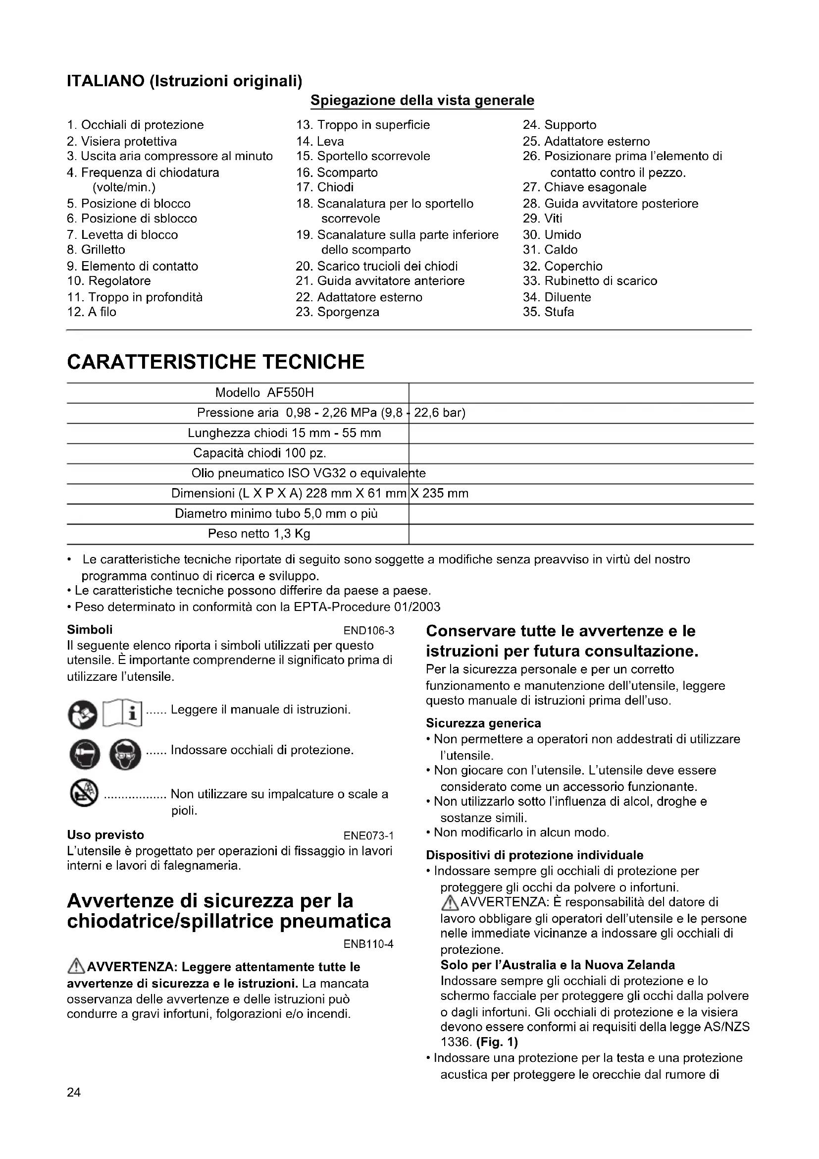 - Peso determinato in conformità con la EPTA-Procedure 01/2003 Simboli END106-3 Il seguente elenco riporta i simboli utilizzati per questo utensile. È importante comprenderne il significato prima di utilizzare l’utensile. ...... Leggere il manuale di istruzioni. ...... Indossare occhiali di protezione. .................. Non utilizzare su impalcature o scale a pioli. Uso previsto ENE073-1 L’utensile è progettato per operazioni di fissaggio in lavori interni e lavori di falegnameria. Avvertenze di sicurezza per la chiodatrice/spillatrice pneumatica ENB110-4 AVVERTENZA: Leggere attentamente tutte le avvertenze di sicurezza e le istruzioni. La mancata osservanza delle avvertenze e delle istruzioni può condurre a gravi infortuni, folgorazioni e/o incendi. Conservare tutte le avvertenze e le istruzioni per futura consultazione. Per la sicurezza personale e per un corretto funzionamento e manutenzione dell’utensile, leggere questo manuale di istruzioni prima dell’uso. Sicurezza generica