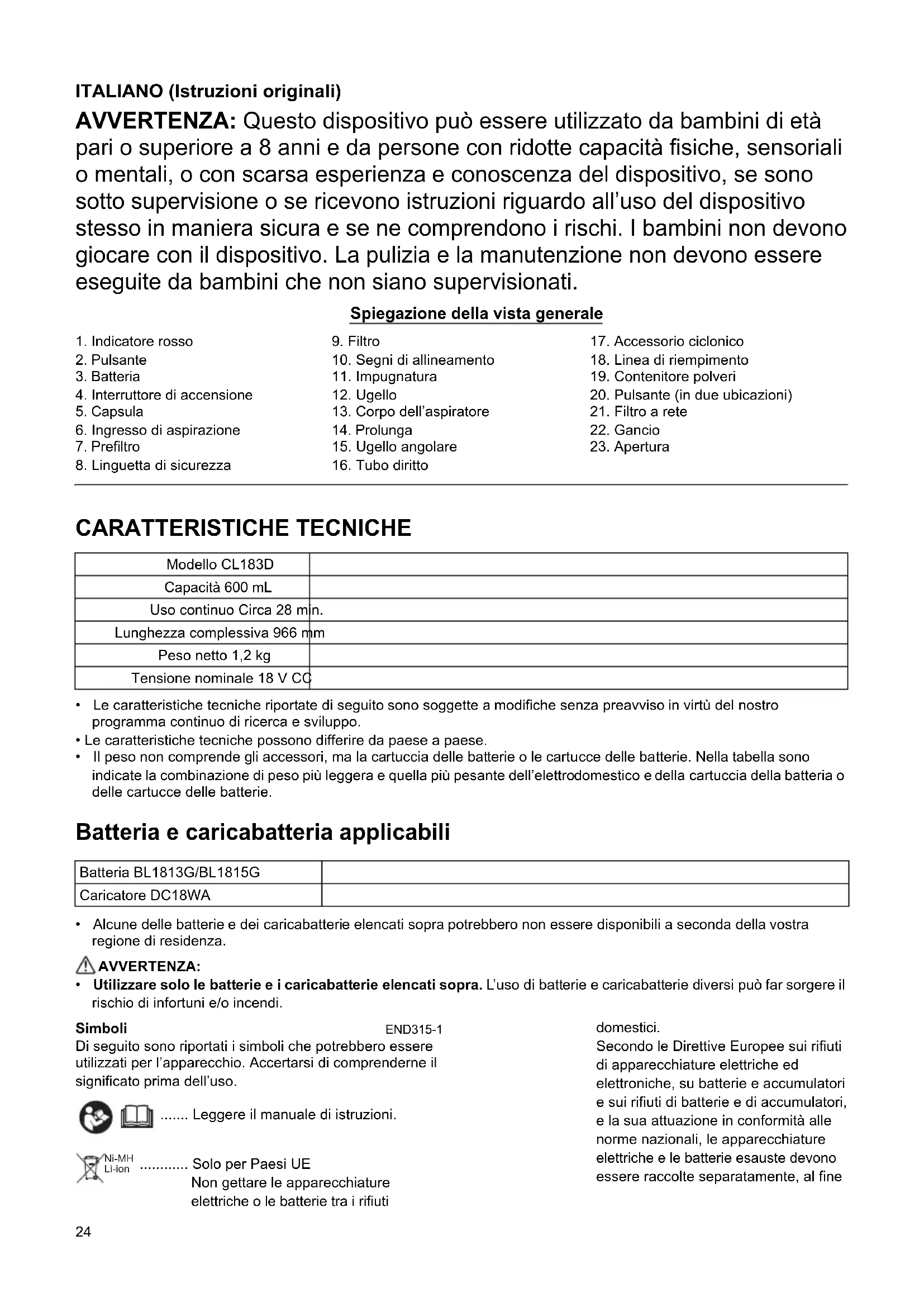 - Utilizzare solo le batterie e i caricabatterie elencati sopra. L’uso di batterie e caricabatterie diversi può far sorgere il rischio di infortuni e/o incendi. Simboli END315-1 Di seguito sono riportati i simboli che potrebbero essere utilizzati per l’apparecchio. Accertarsi di comprenderne il significato prima dell’uso. ....... Leggere il manuale di istruzioni. ............ Solo per Paesi UE Non gettare le apparecchiature elettriche o le batterie tra i rifiuti domestici. Secondo le Direttive Europee sui rifiuti di apparecchiature elettriche ed elettroniche, su batterie e accumulatori e sui rifiuti di batterie e di accumulatori, e la sua attuazione in conformità alle norme nazionali, le apparecchiature elettriche e le batterie esauste devono essere raccolte separatamente, al fine